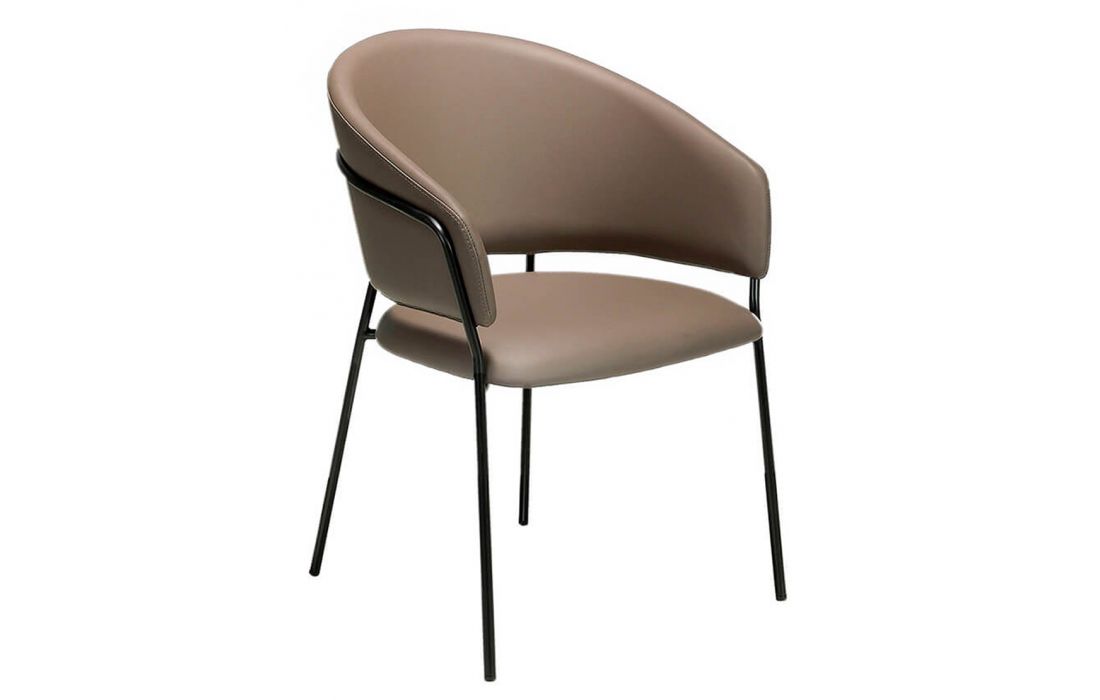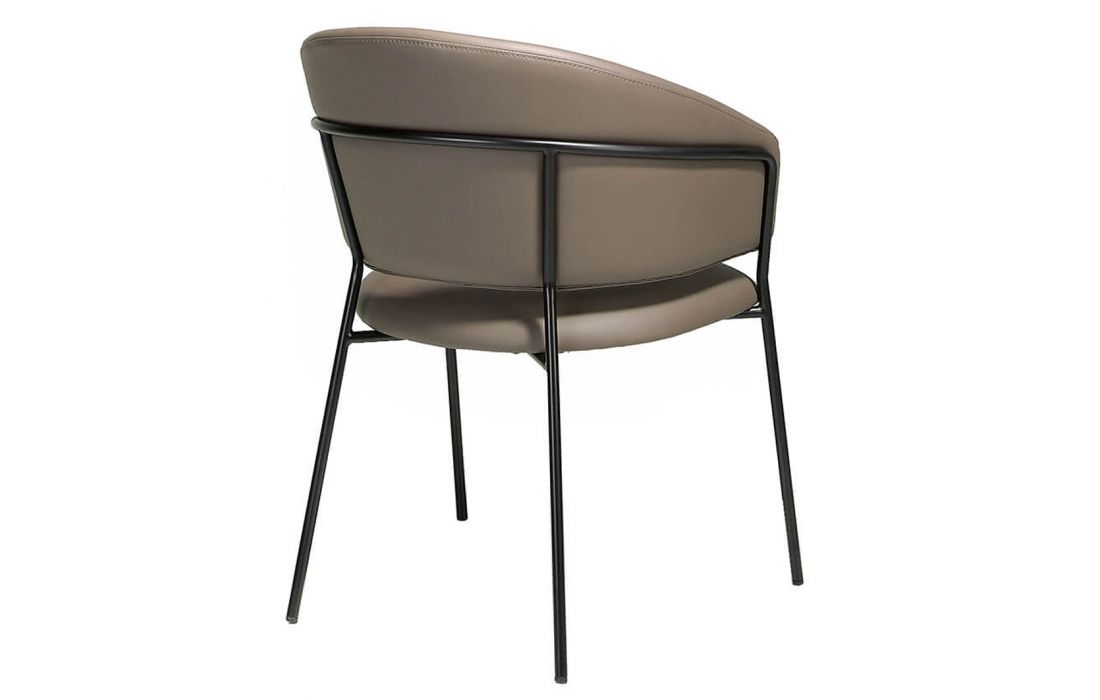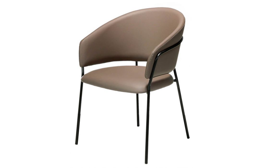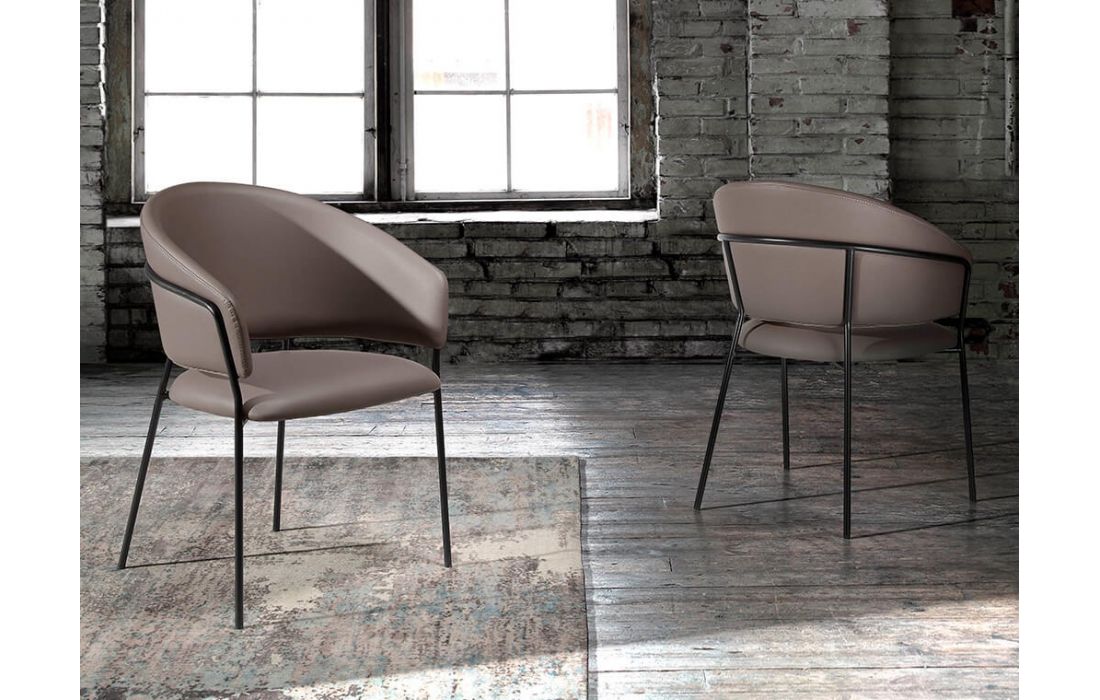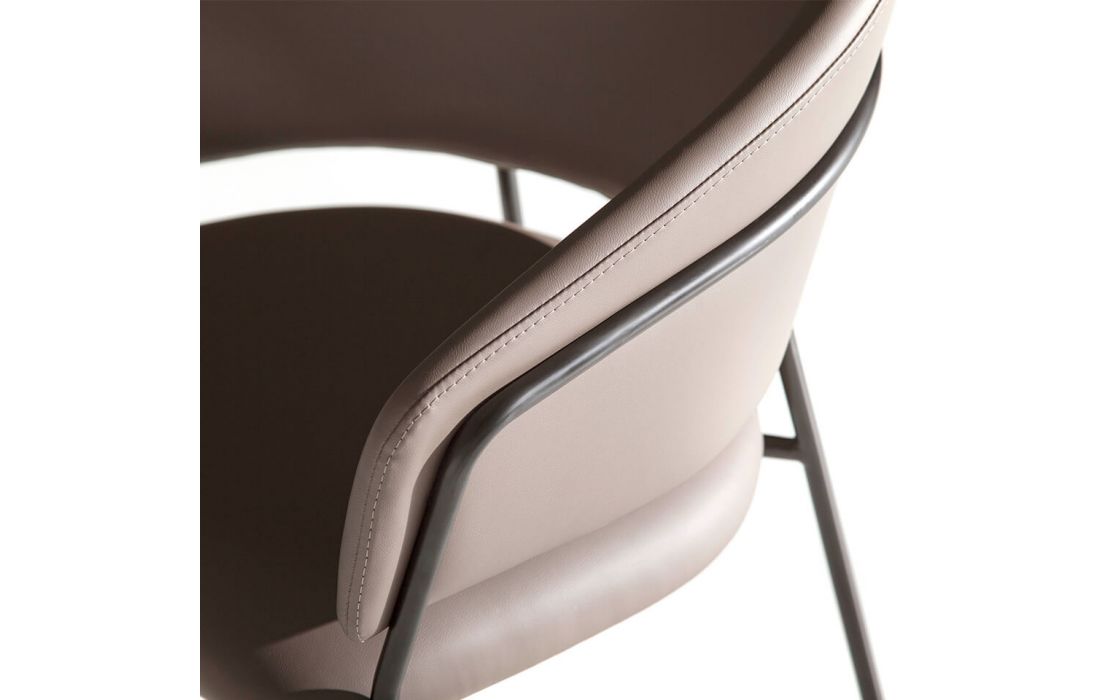 Modern design chair with seat and back upholstered in synthetic leather and stainless steel legs