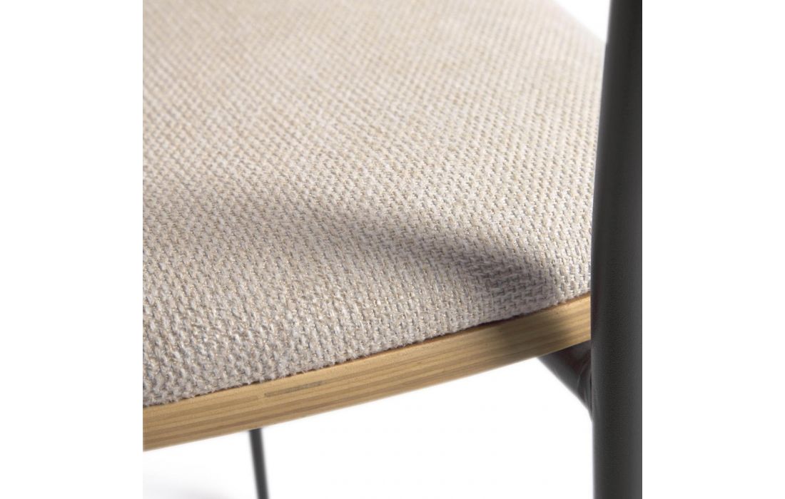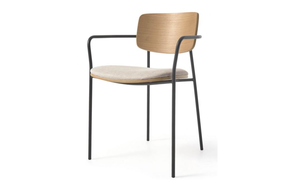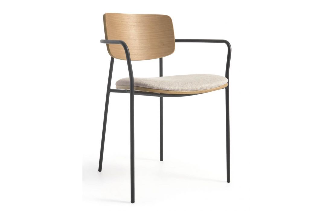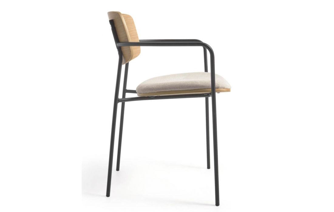 Chair with armrests, black metal frame, natural finish oak veneer back and fabric upholstered seat
