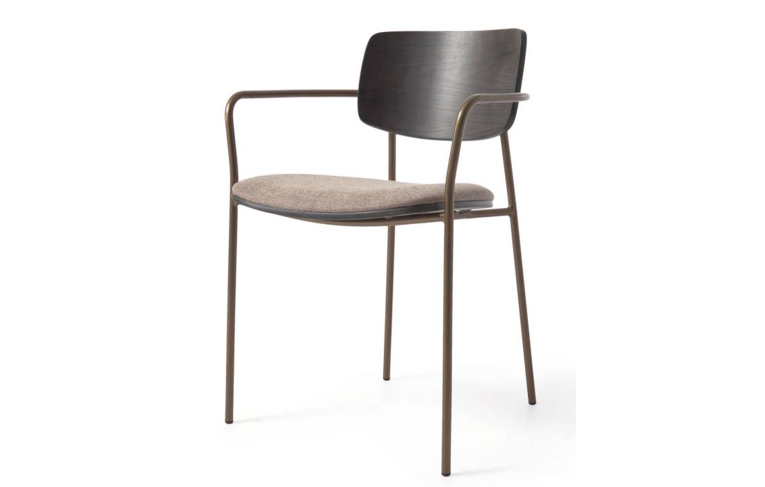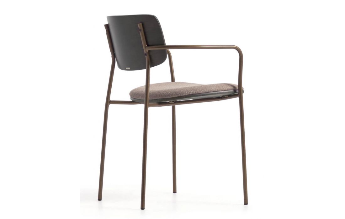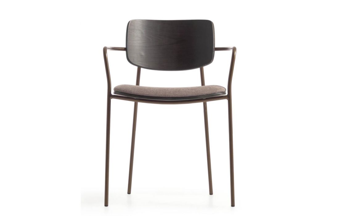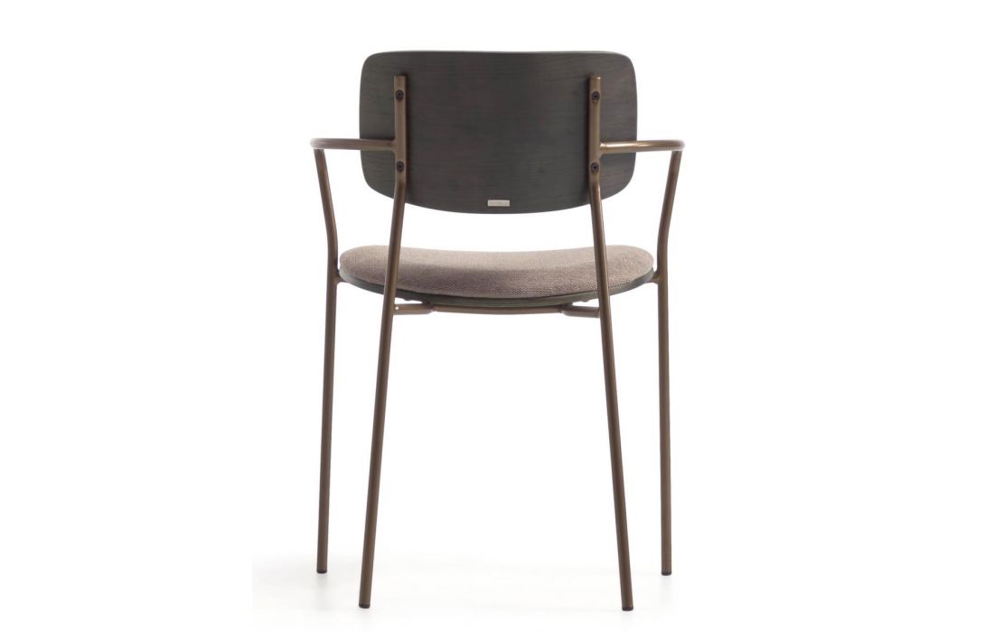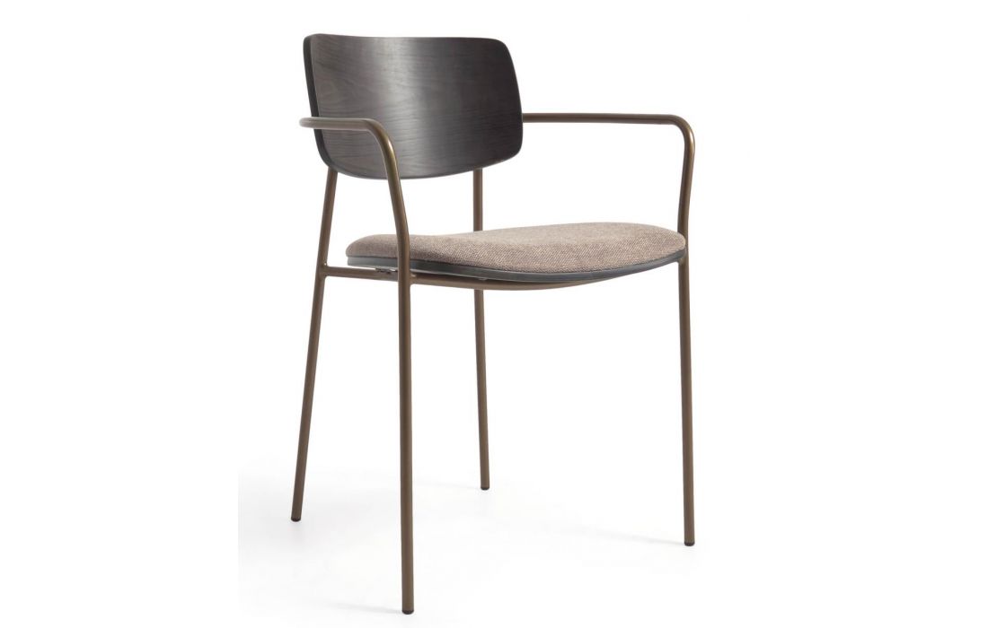 Chair with armrests, metal frame, ash leaf back with dark finish and fabric upholstered seat