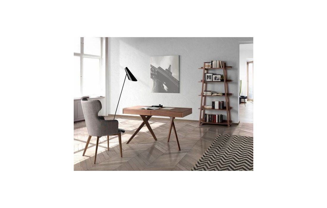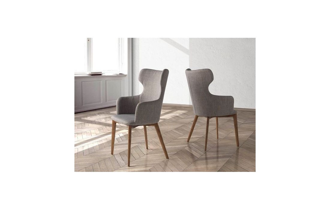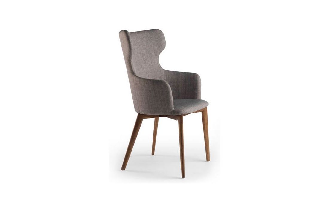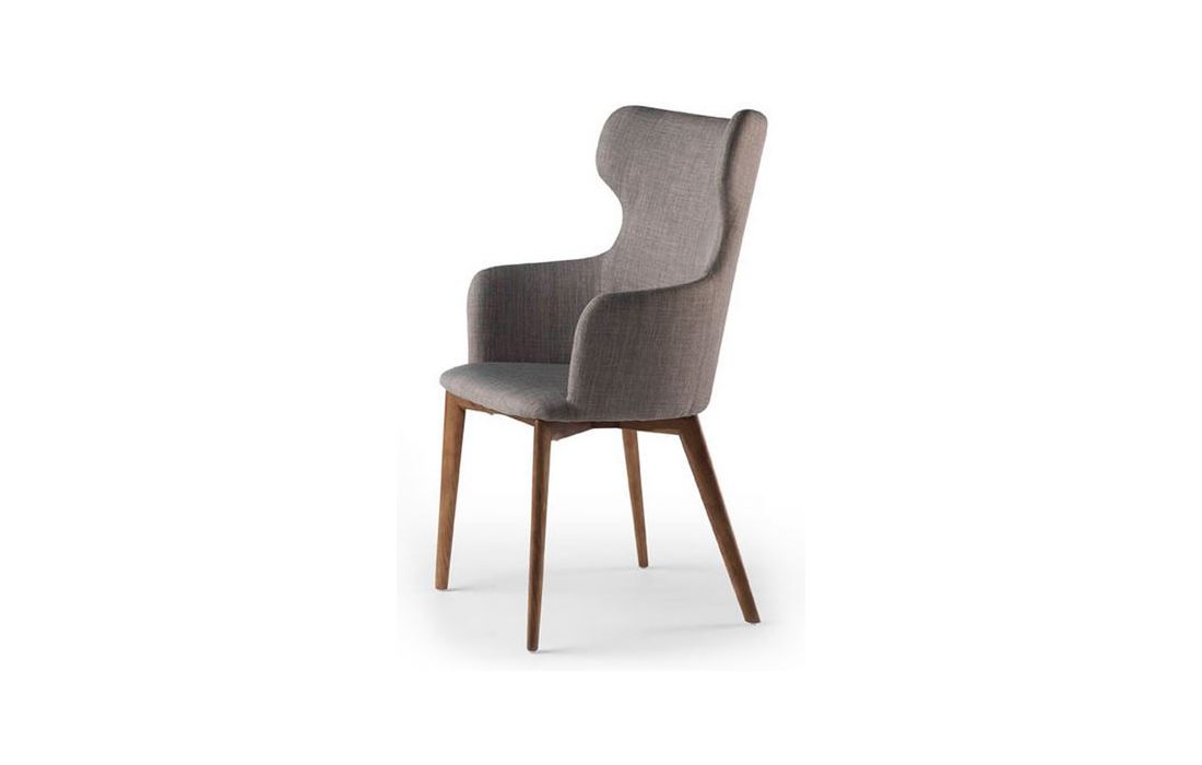 High-back dining armchair upholstered in fabric and frame in walnut-colored ash wood.