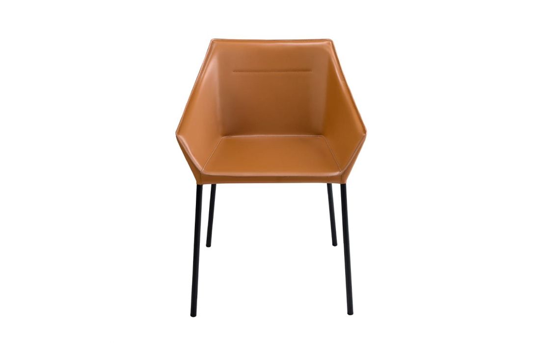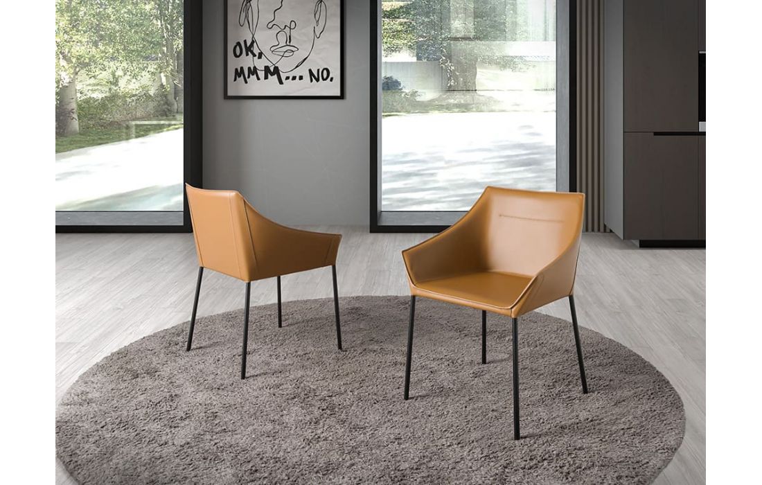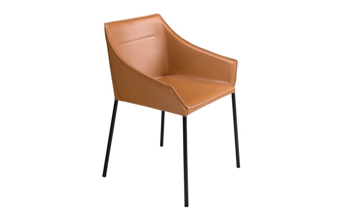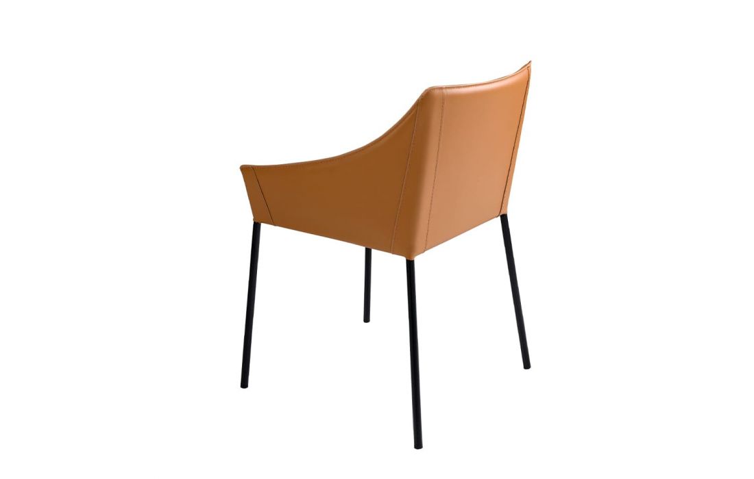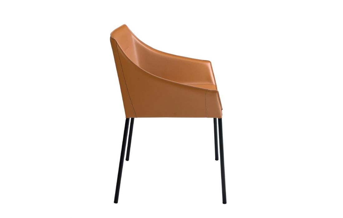 Modern design armchair with seat and back upholstered in brown synthetic leather, feet in matte black stainless steelRecipient :