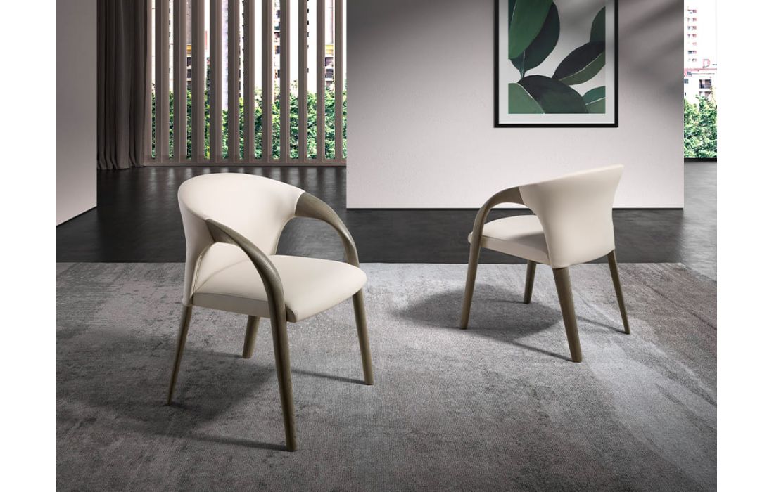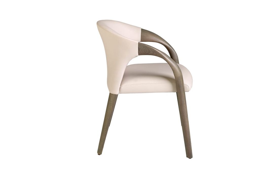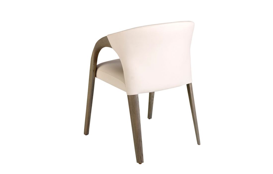 Modern design armchair with seat and back upholstered in cream synthetic leather, legs in gray oak wood.