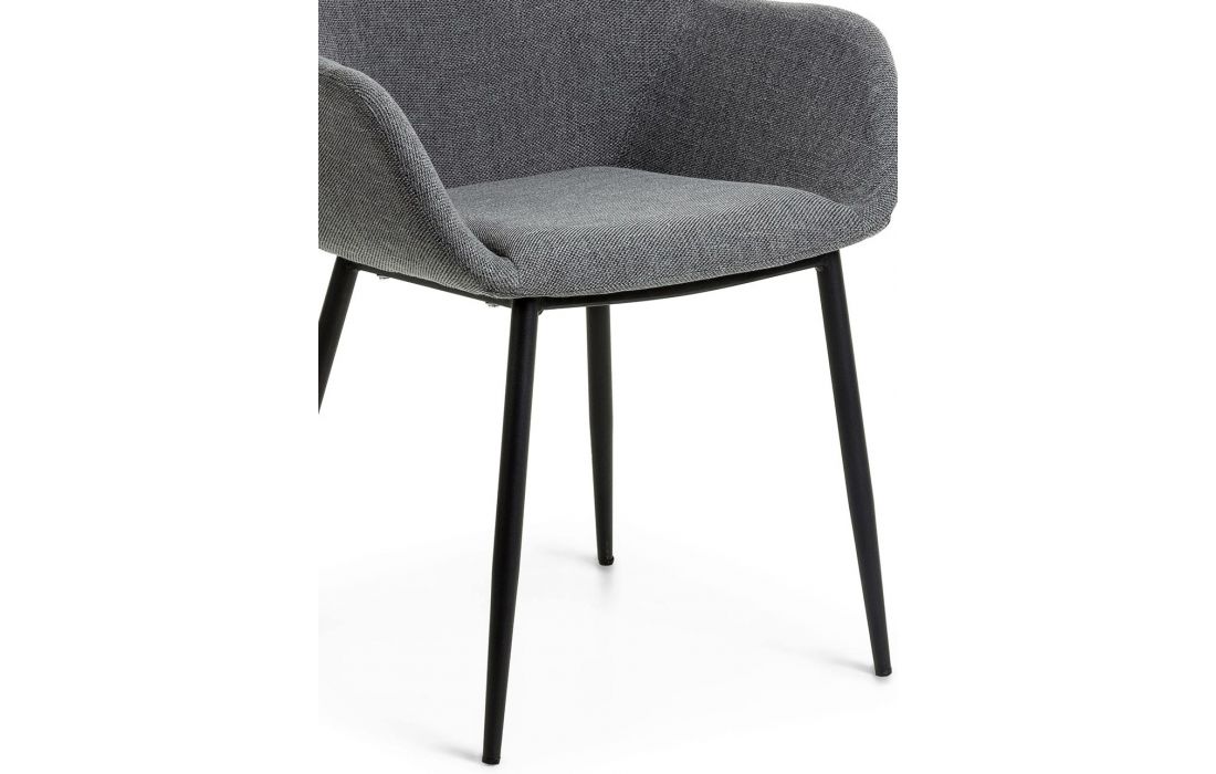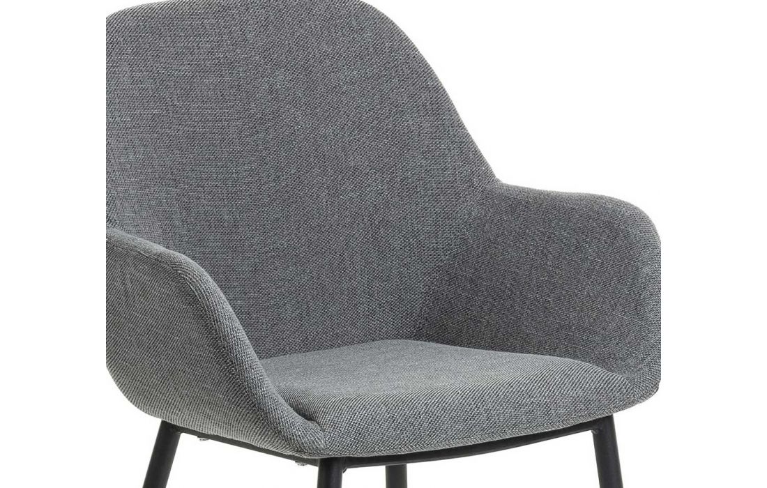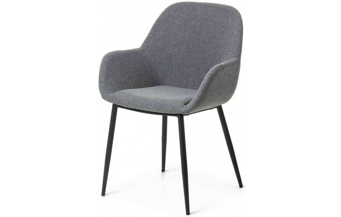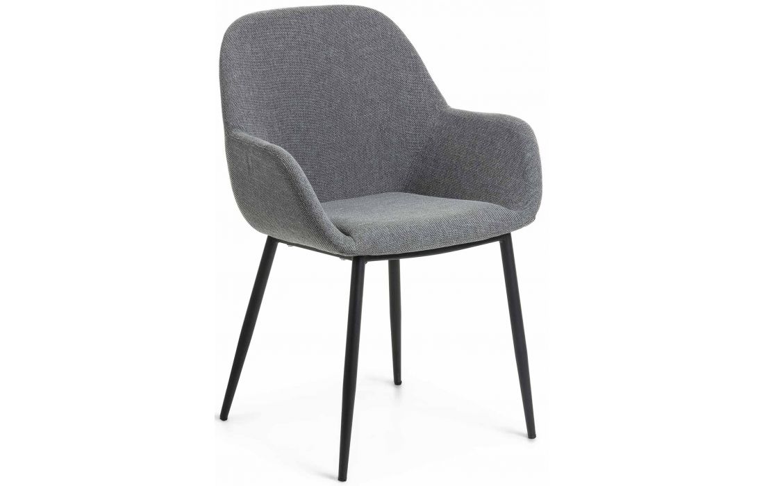 Chair with armrests, upholstered in gray fabric, dark gray, blue or mustard. Feet in black metal.