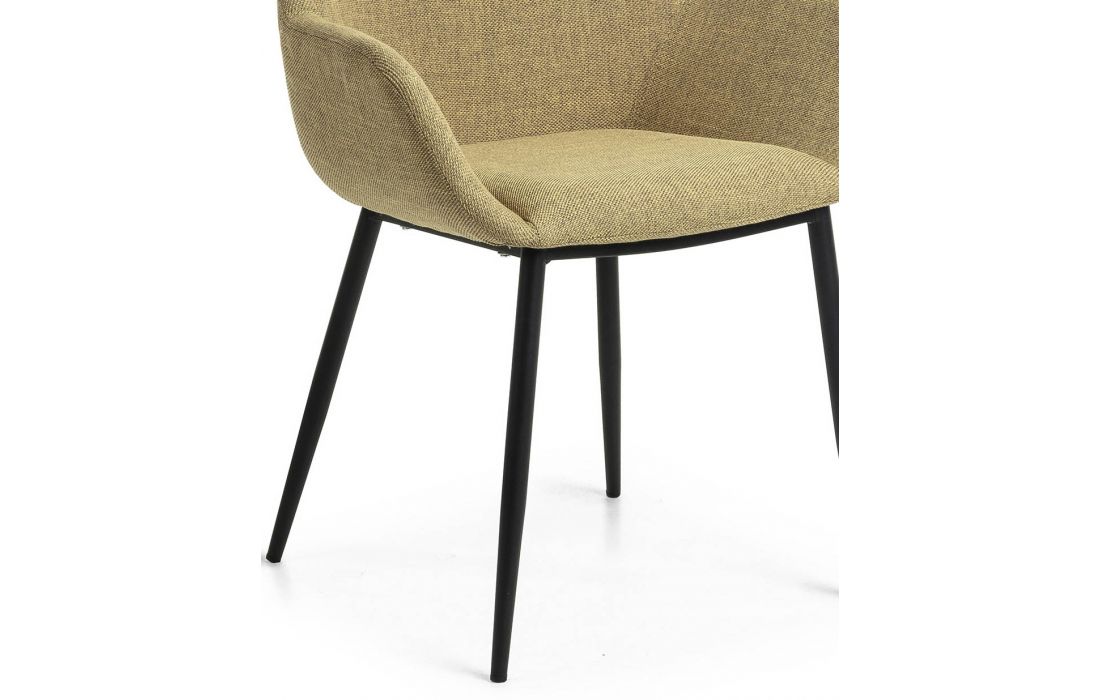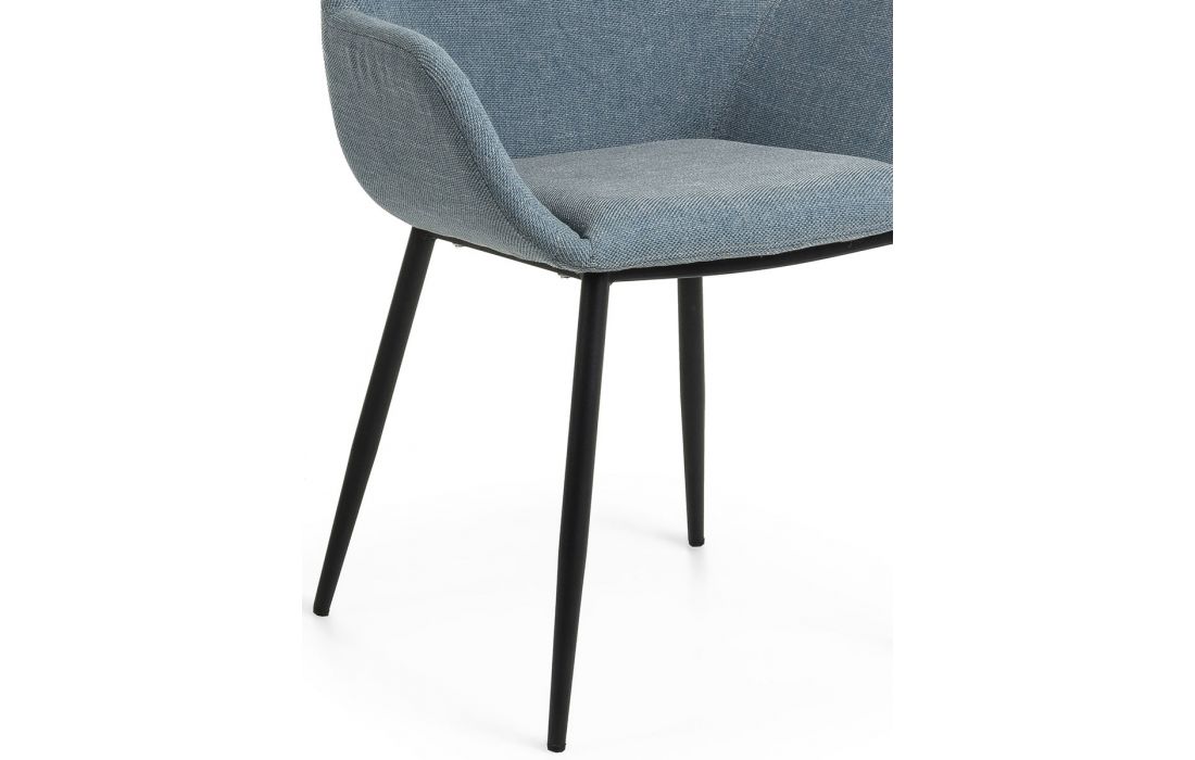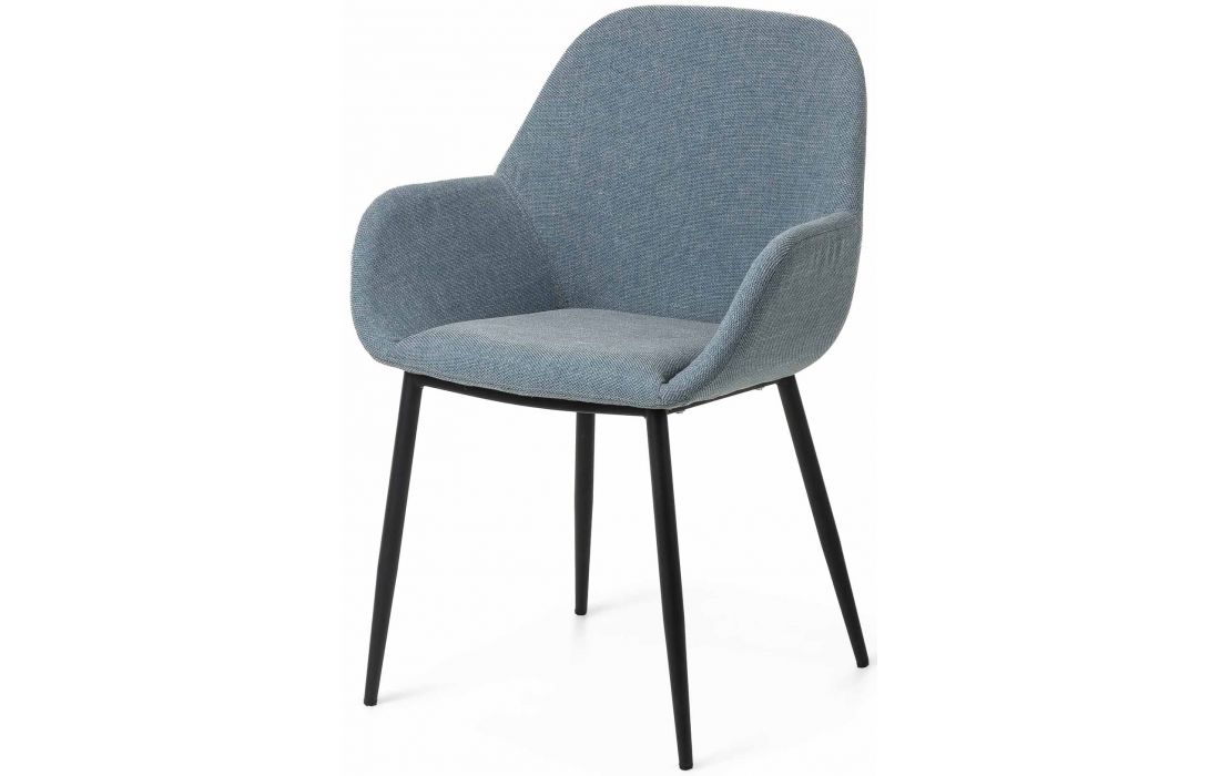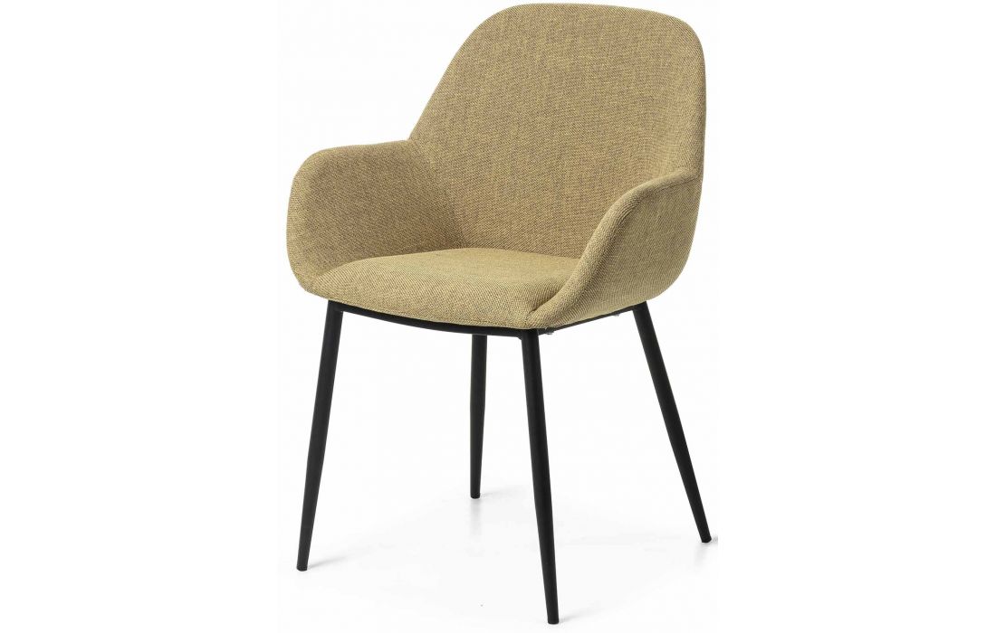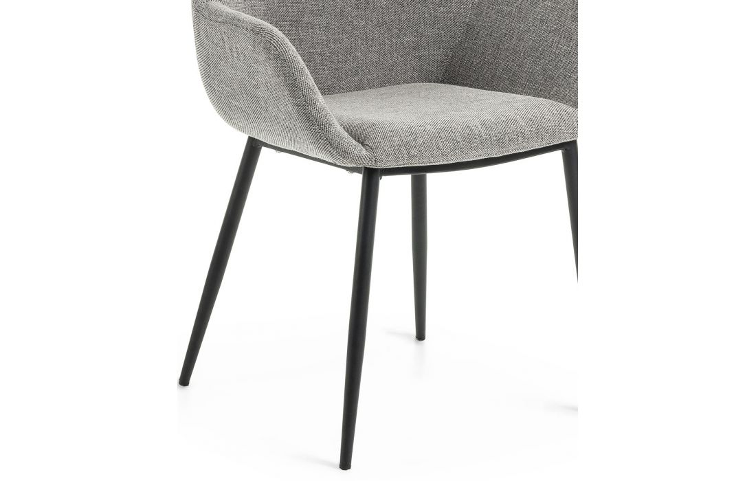 Chair with armrests, upholstered in gray fabric, dark gray, blue or mustard. Feet in black metal.