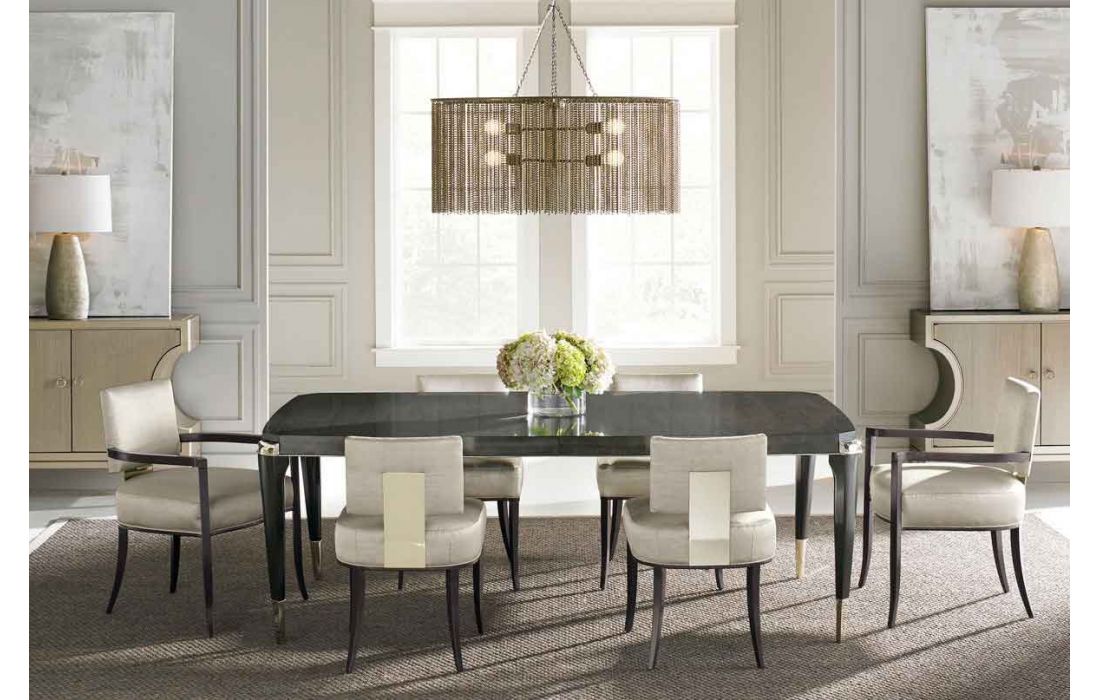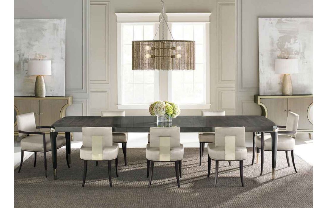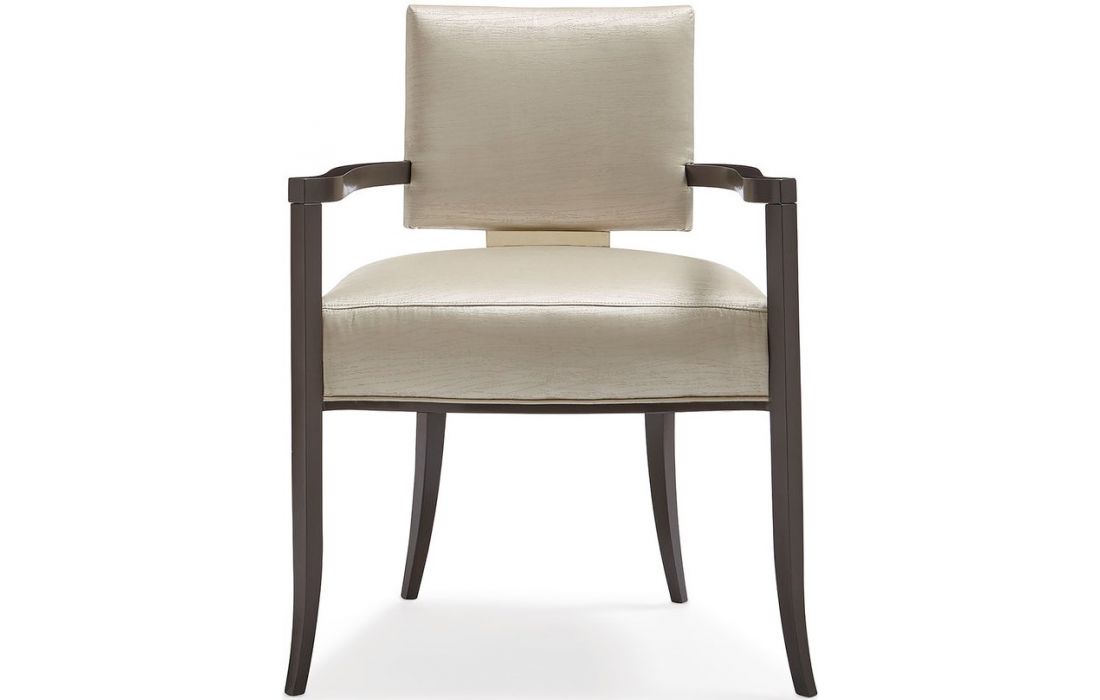 This contemporary armchair takes on a dramatic style when we see the panel with a light touch of gold color "Whisper of Gold" that shines on the back. The neutral satin fabric with a subtle moiré design completely envelops the top of the back and seat cushion resting on an exposed wooden frame, saber legs and gracefully curved arms with dark gray finish