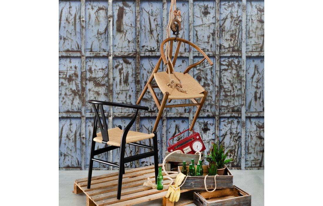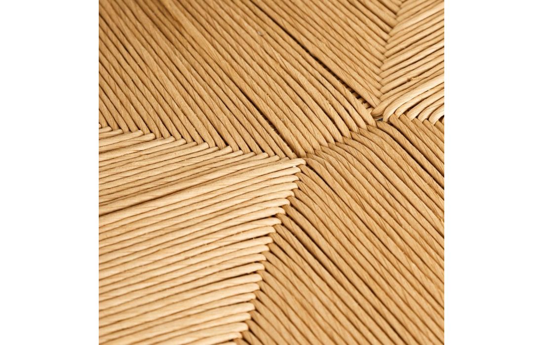 Armchair with natural colored rattan structure.