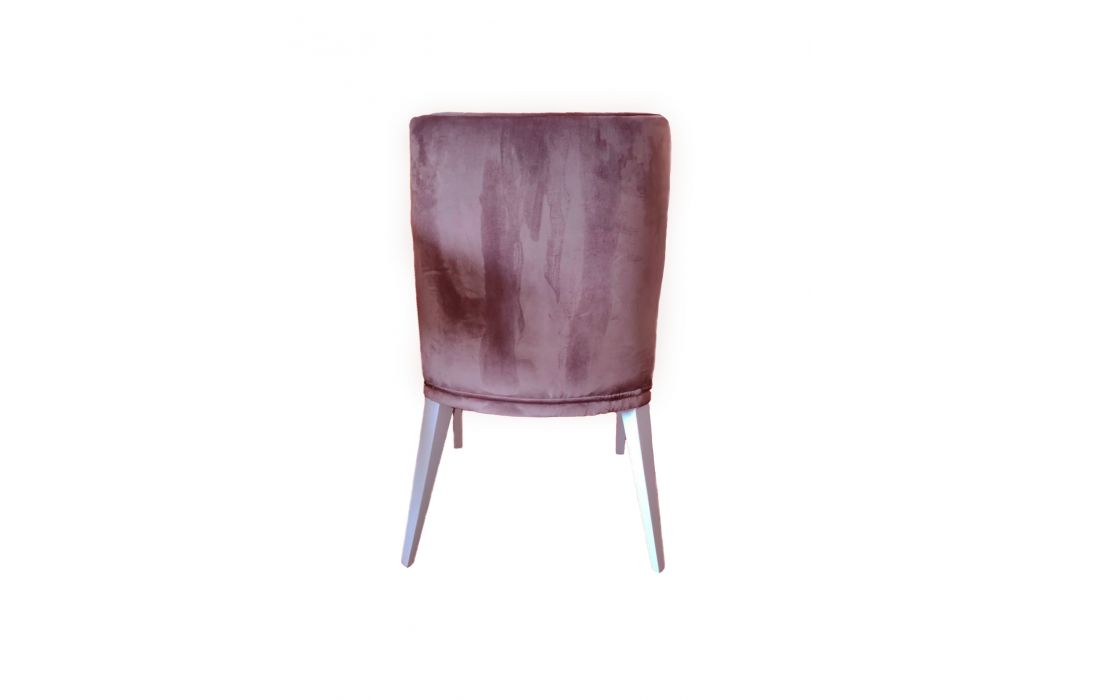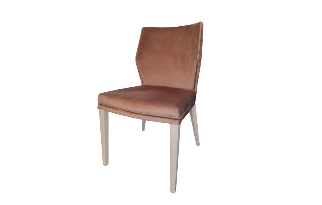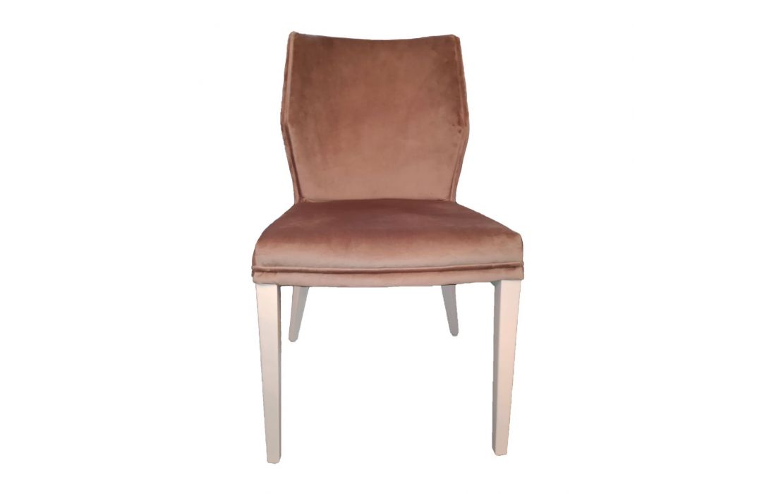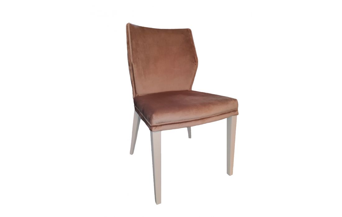 Chair with white lacquered feet and fabric covering in various possible finishes.