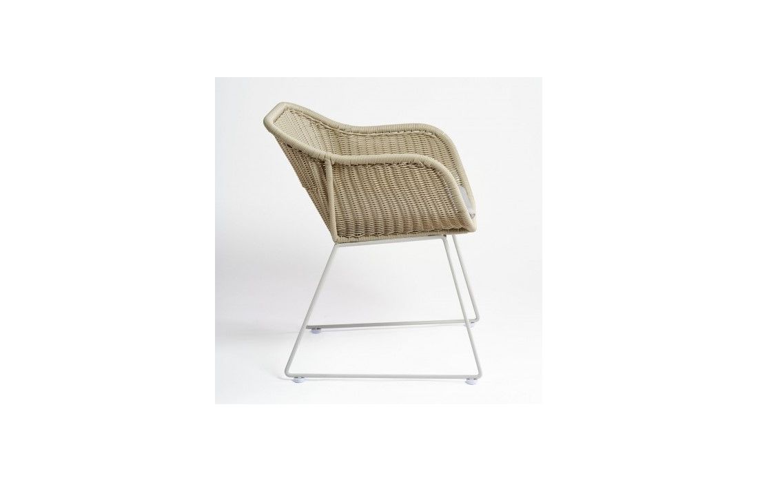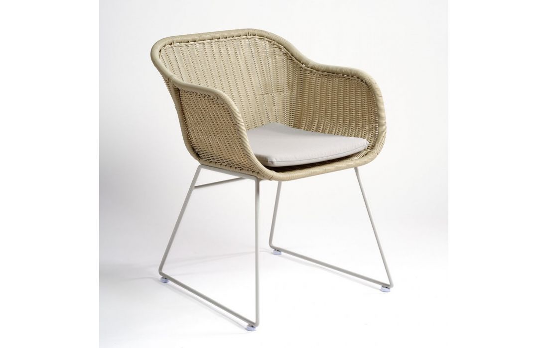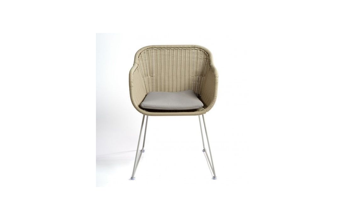 Synthetic rattan armchair with cushion included.