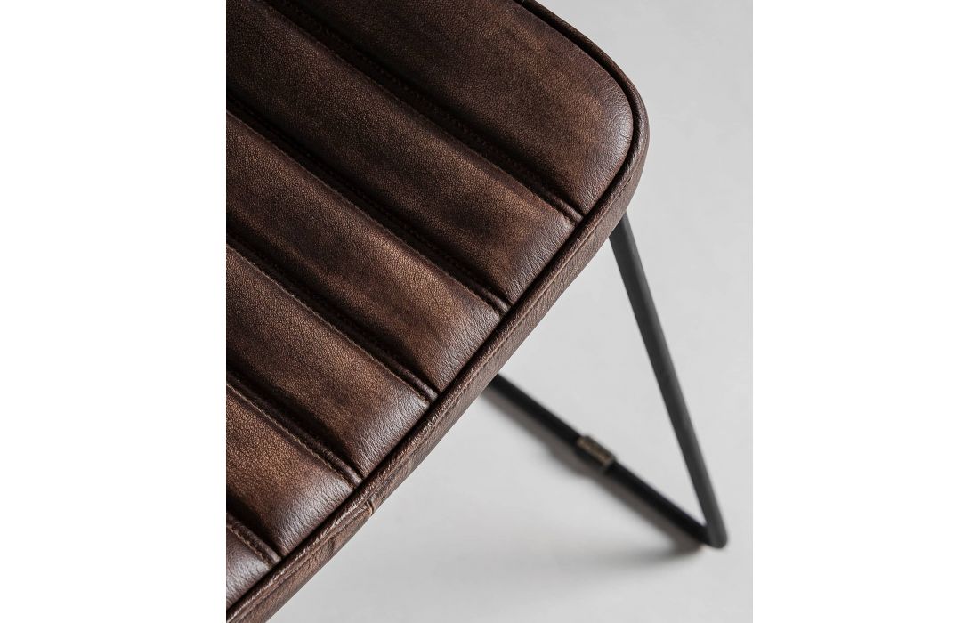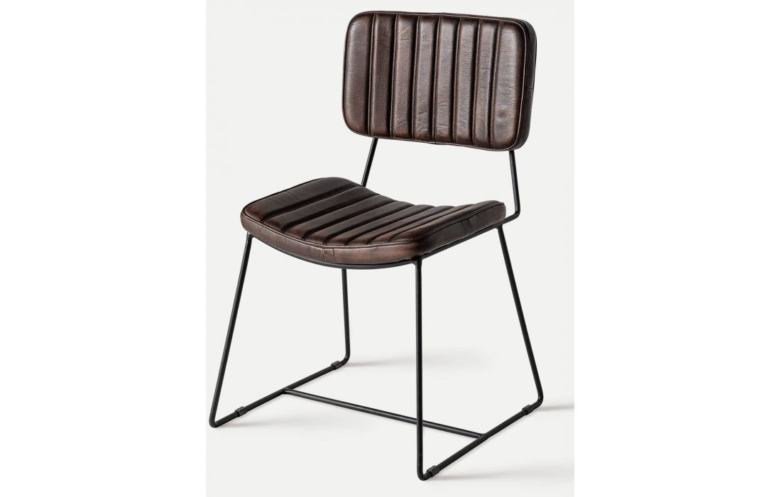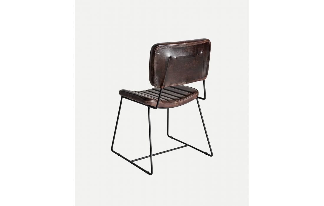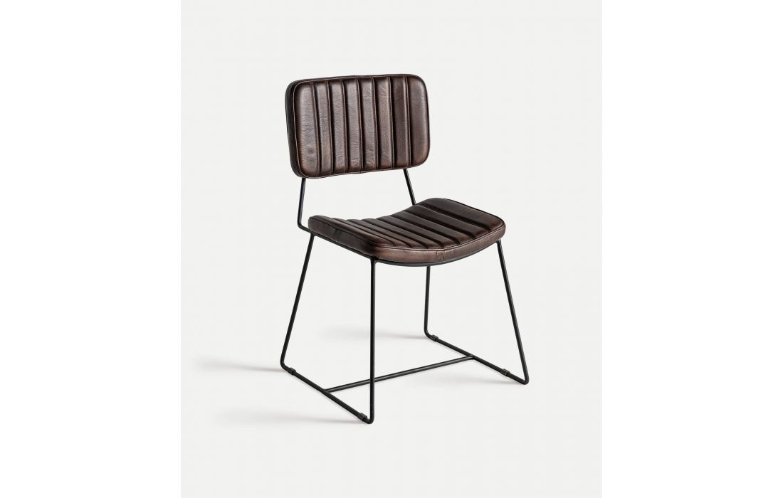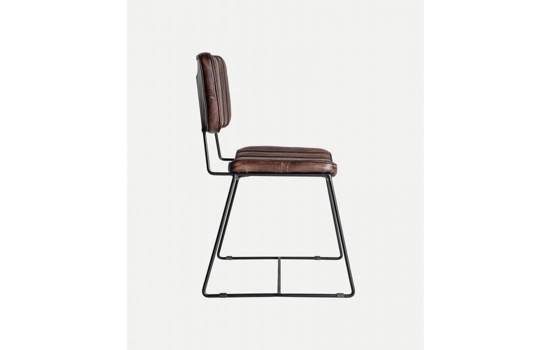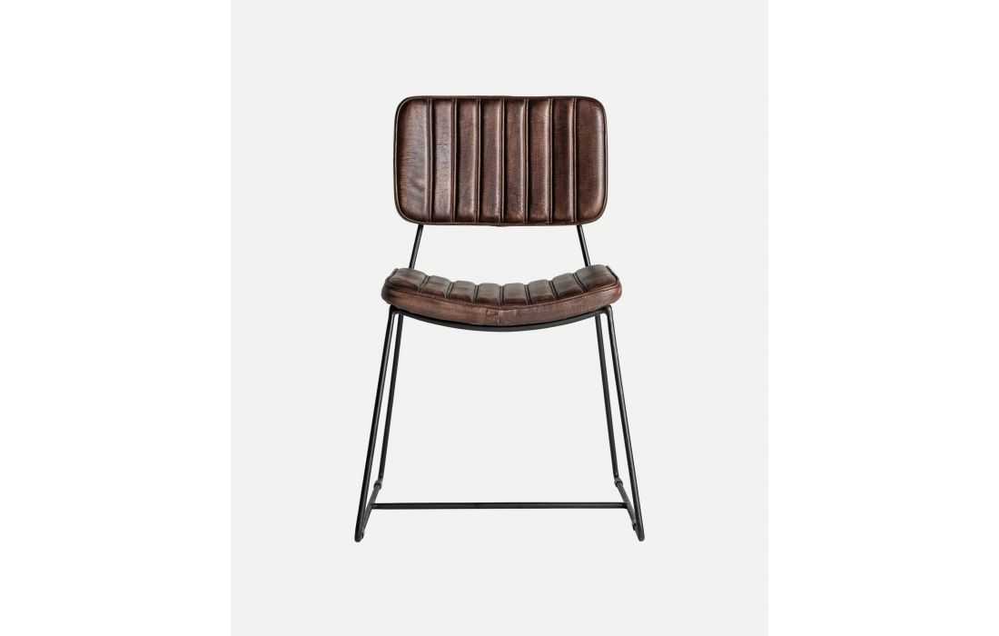 Leather chair with metal legs, ideal for dining rooms or workspaces. Its leather seat and metal frame give it a modern, industrial style, providing an elegant and robust touch.