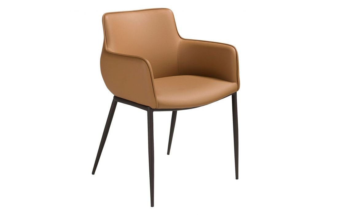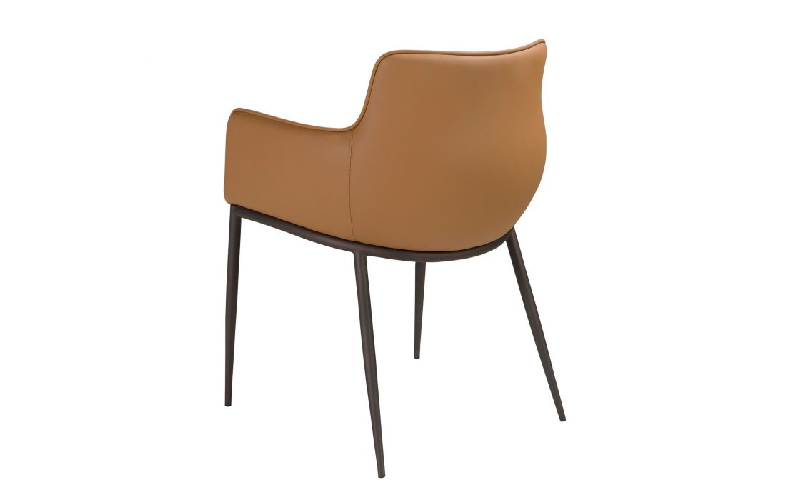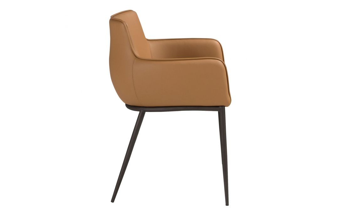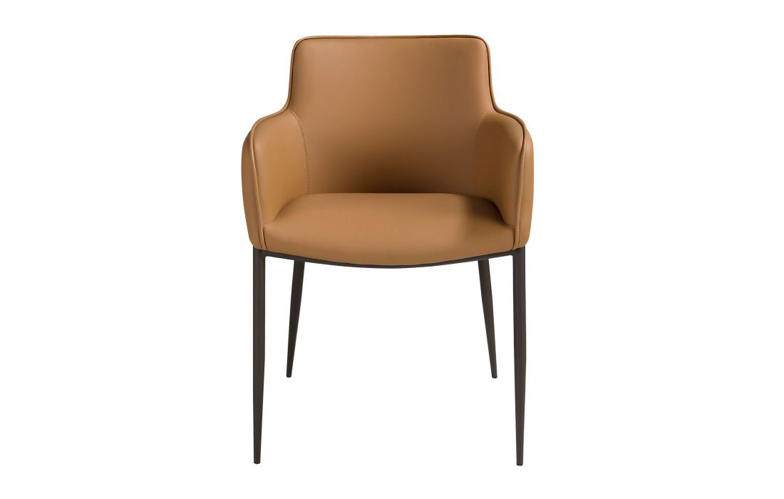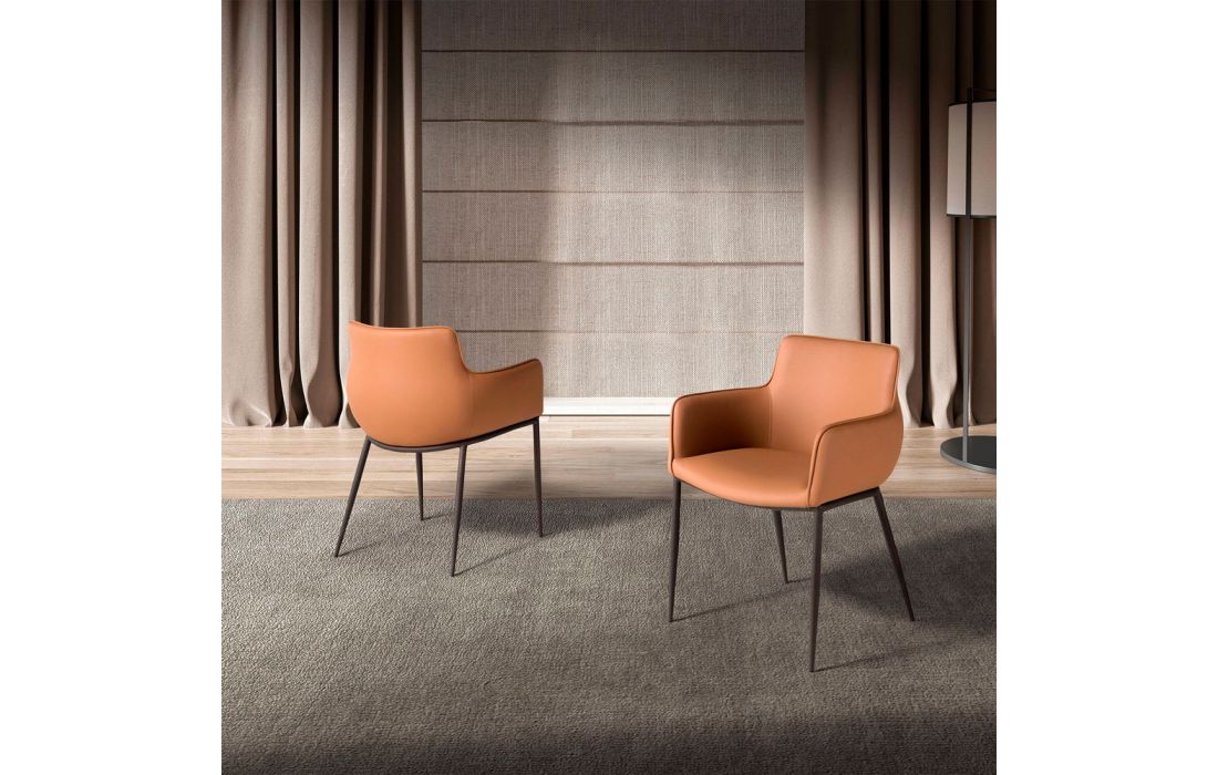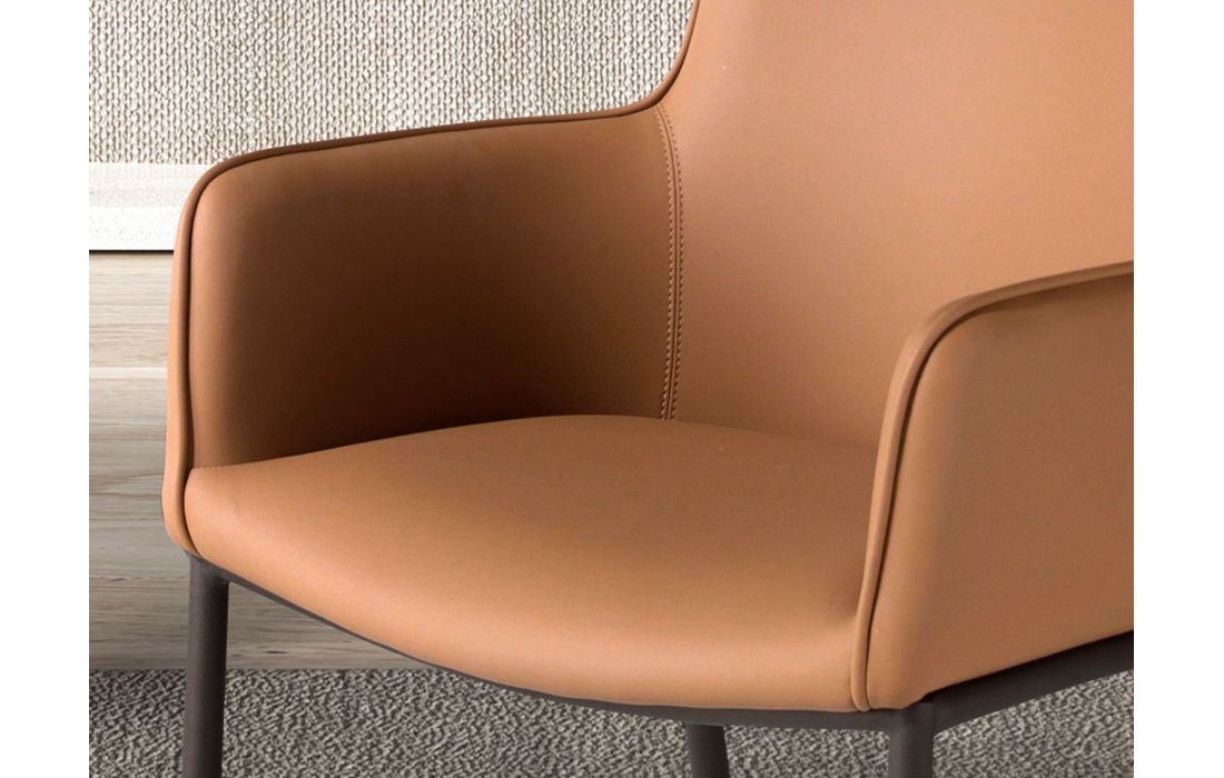 This armchair features a seat and backrest upholstered in brown synthetic leather. Its stainless steel legs with black epoxy coating, along with its avant-garde and timeless style, make it indispensable for your kitchen or dining room.