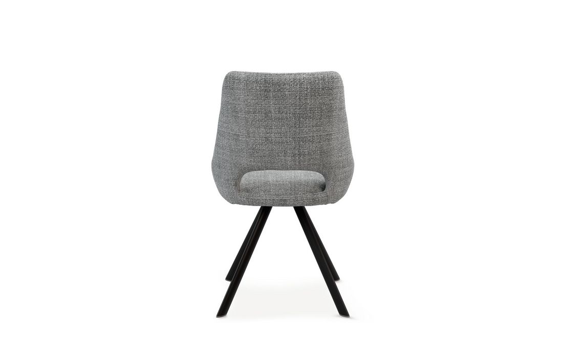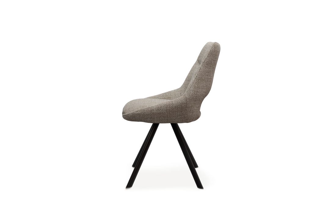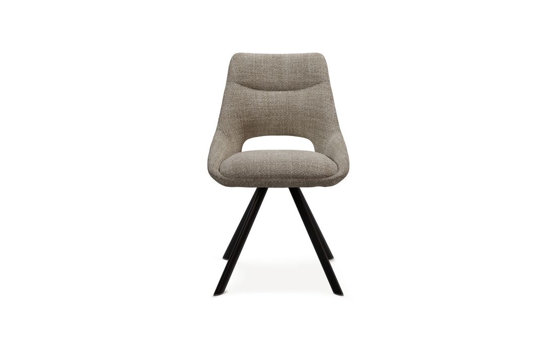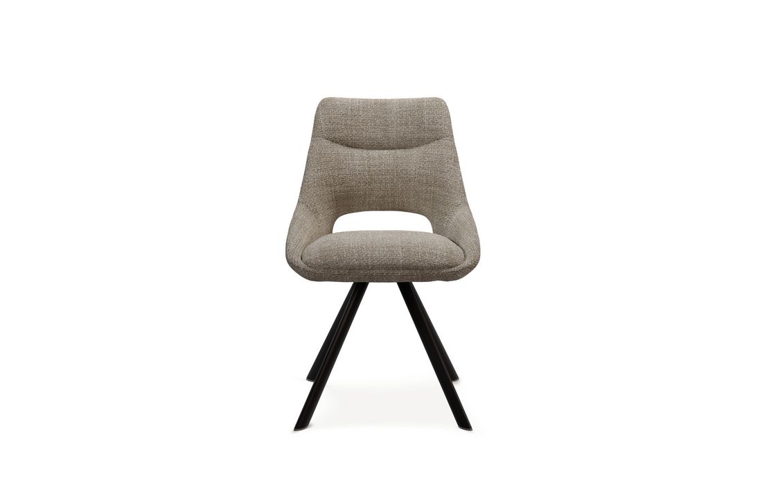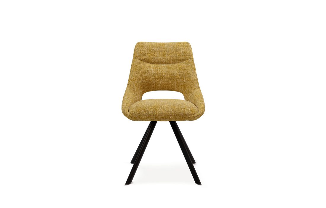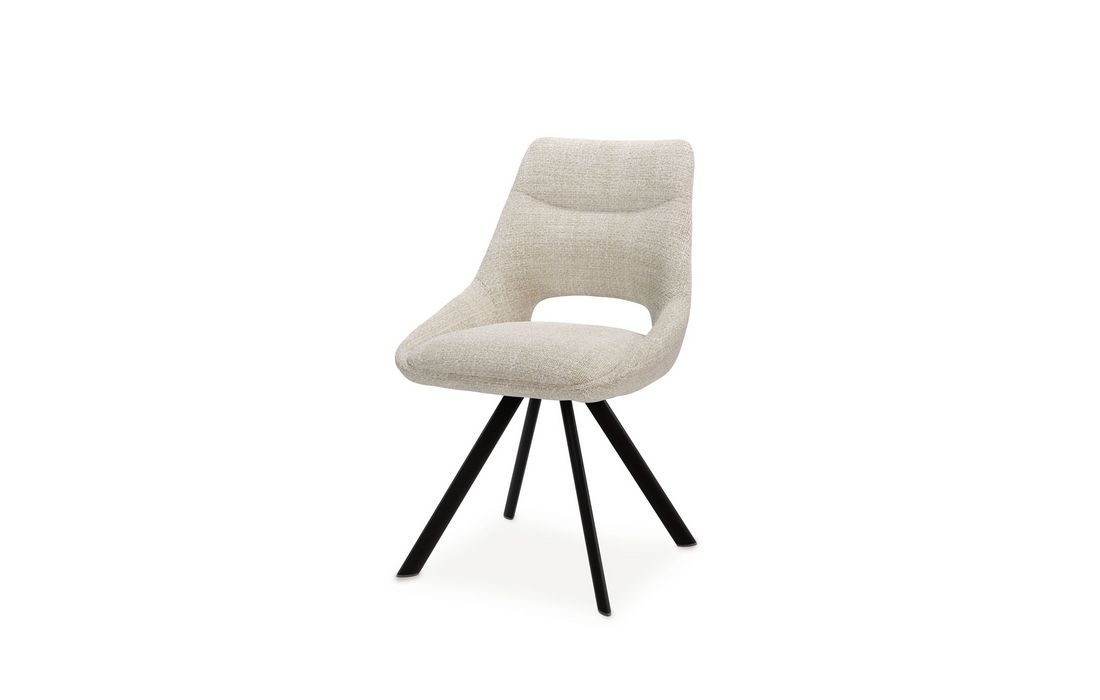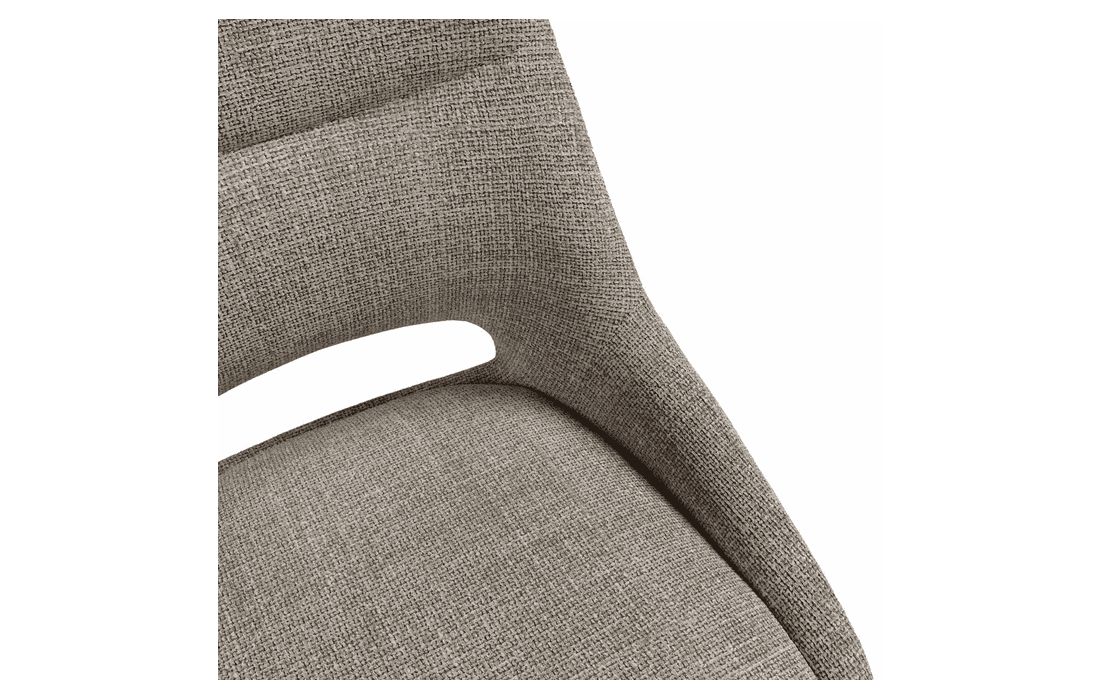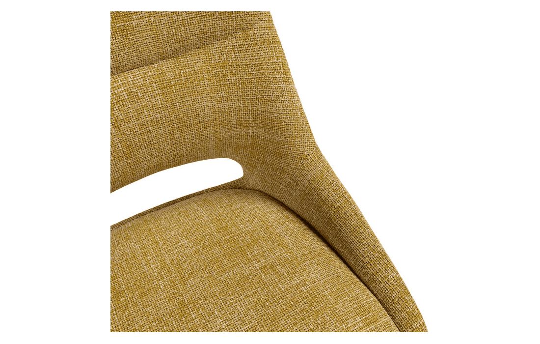 This chair stands out for its original design, with a wide backrest and an elegant opening detail that gives it a sophisticated look. This chair is perfect for any environment. Available in light gray, beige, mustard, and taupe.