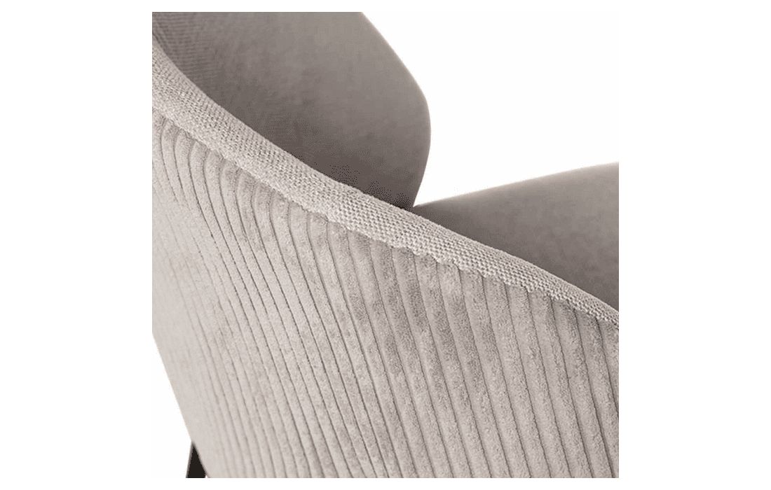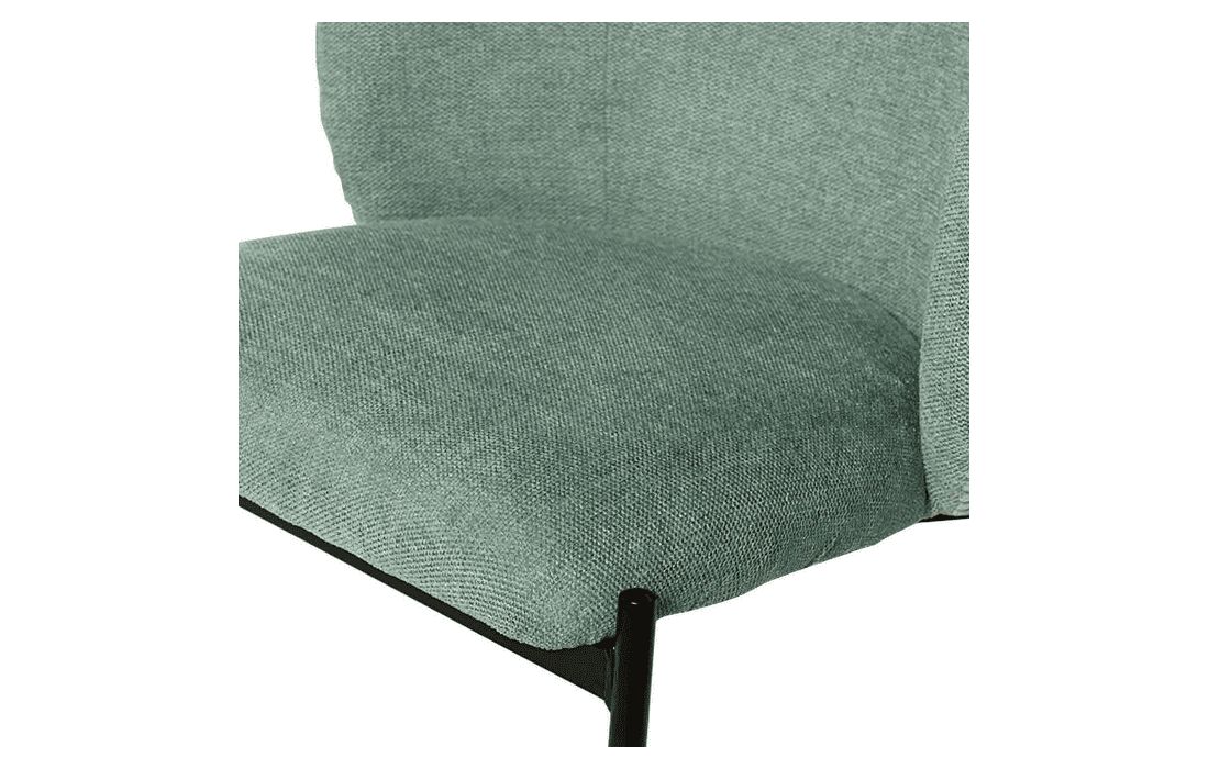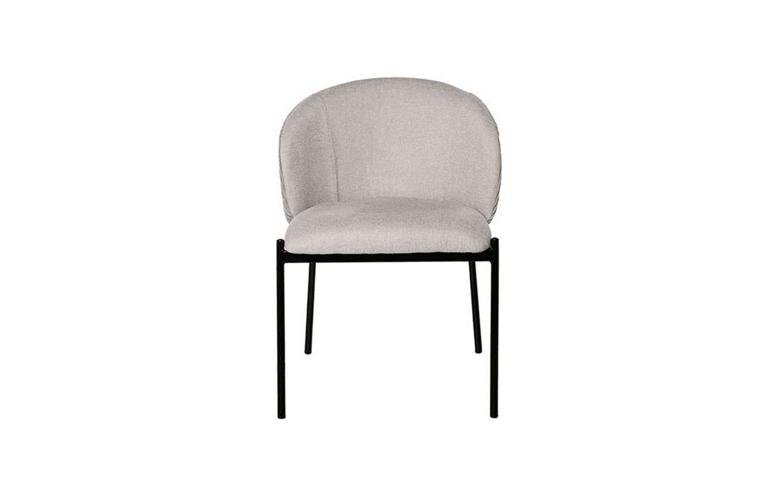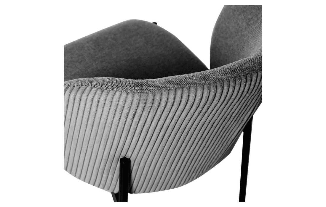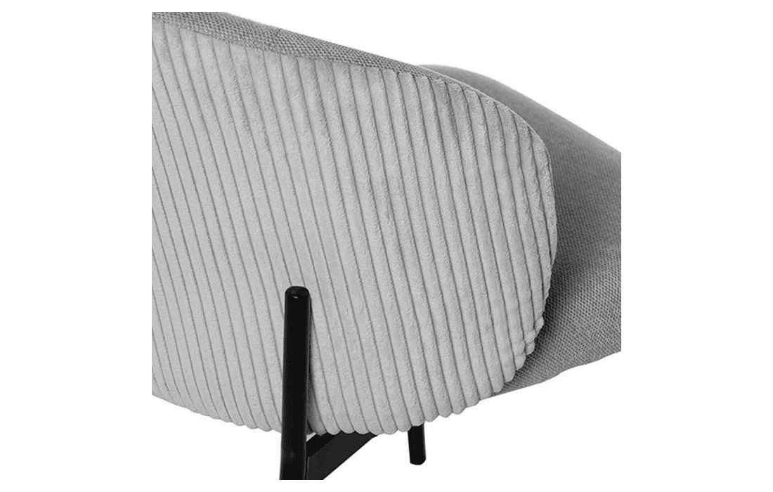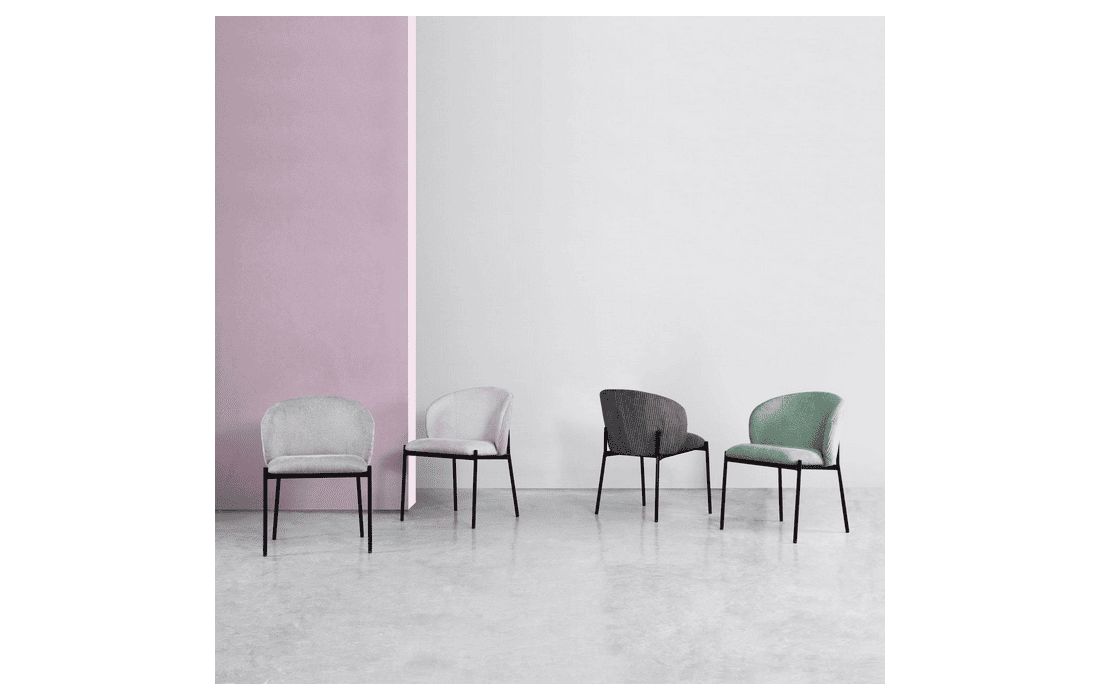 Its wide, slightly concave backrest provides comfortable support. In addition, the metal legs contrast with the rest of the chair, giving it a sophisticated look. Available in light gray, dark gray, beige, and mint.