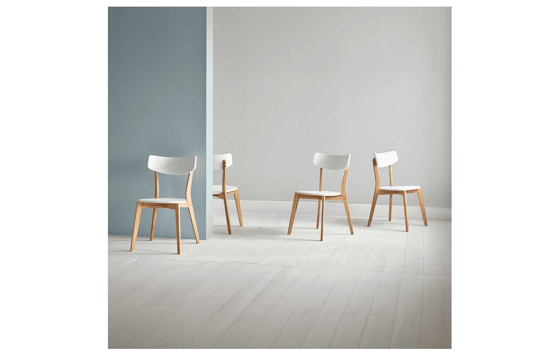 This chair has a unique charm thanks to the combination of the white seat and backrest with the oak-finished frame and legs. Its design is ideal for dining rooms and kitchens looking to add a touch of style to the space.