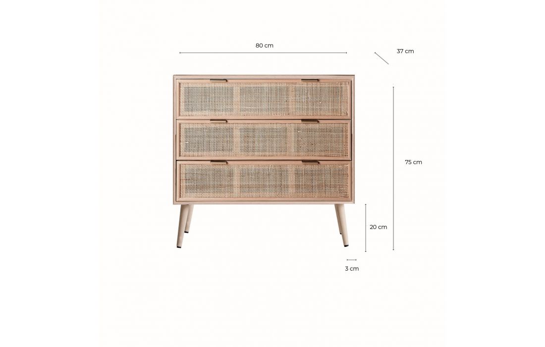 Chest of drawers made of fir wood with three drawers in a fine rattan straw fabric