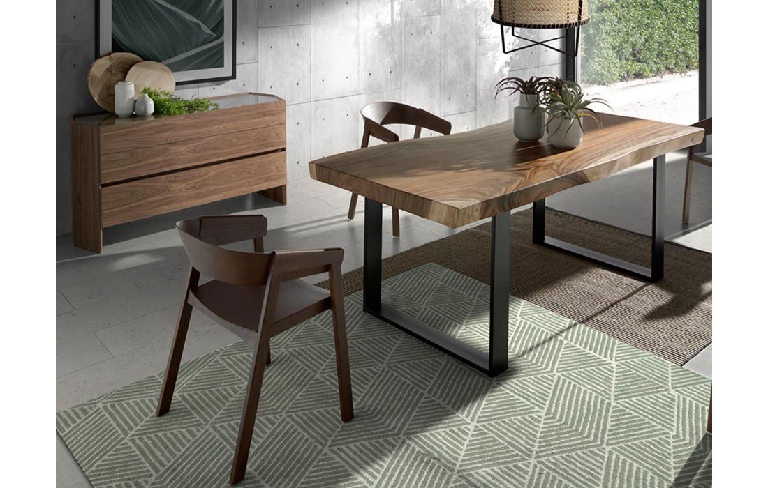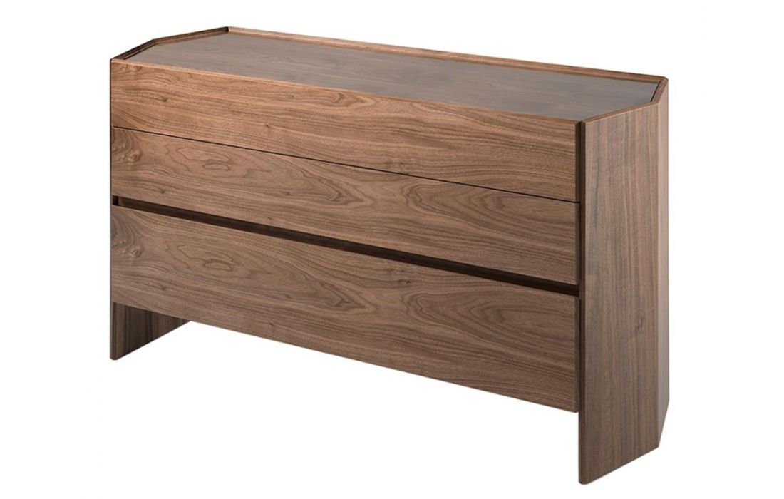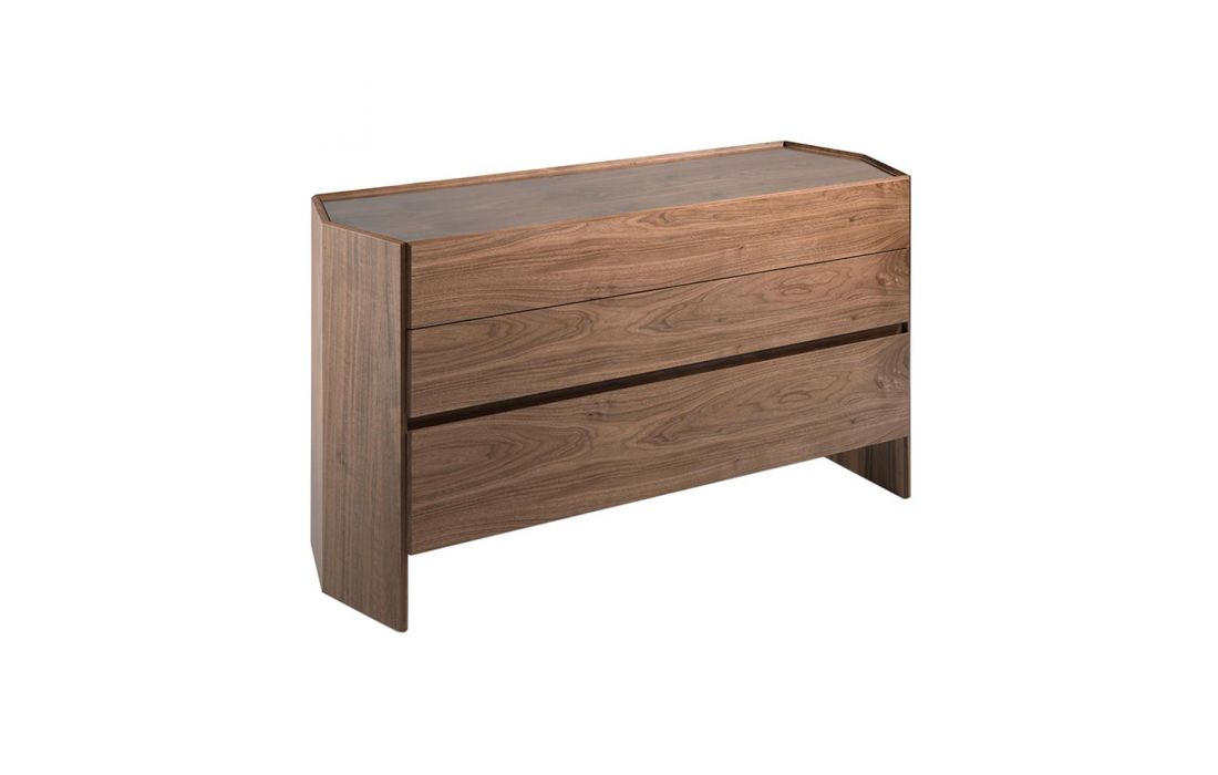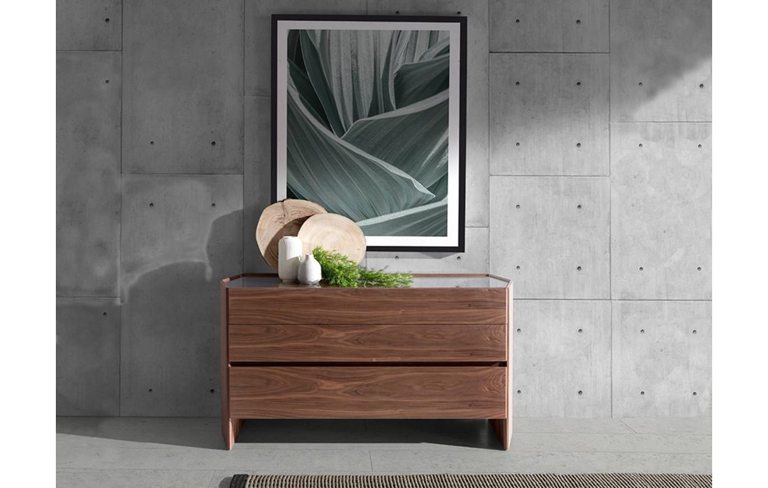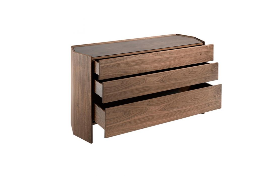 Hexagonal chest of drawers in walnut with three drawers. Hexagonal tempered glass top.