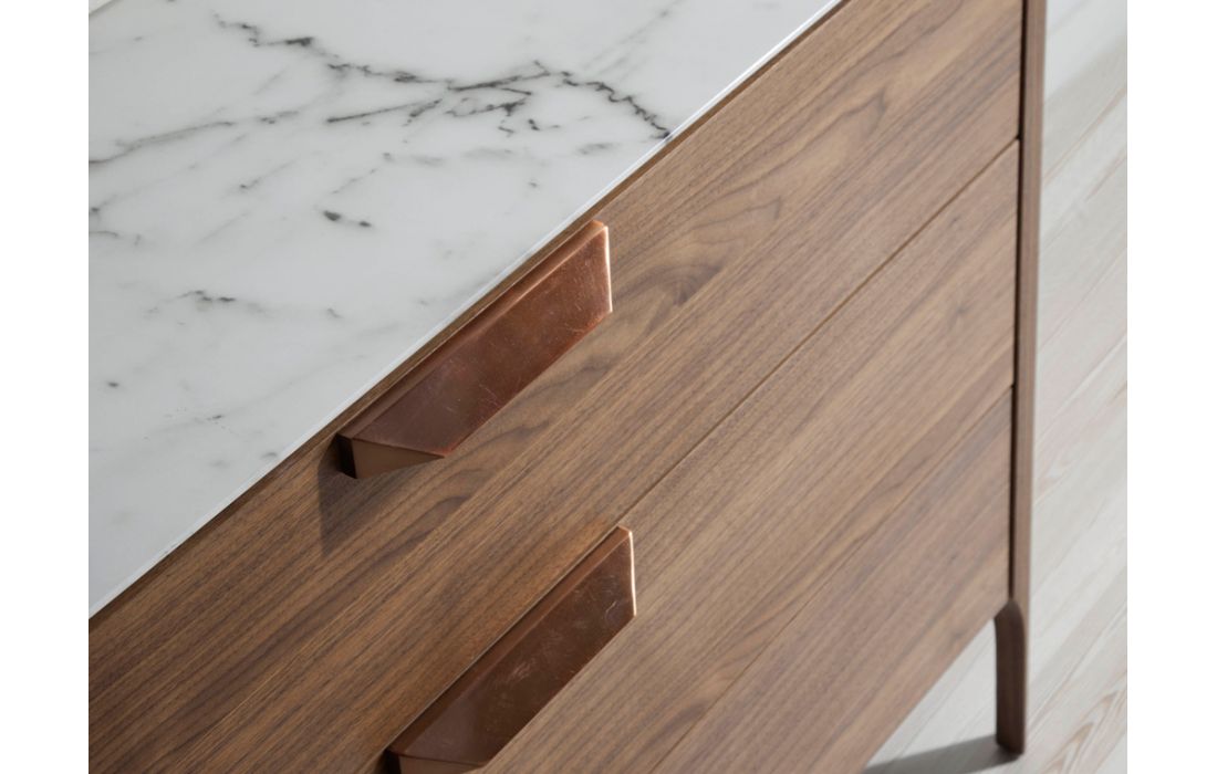 Chest of drawers in walnut veneered wood with marble-effect fiberglass top. Drawers with copper colored steel handles.