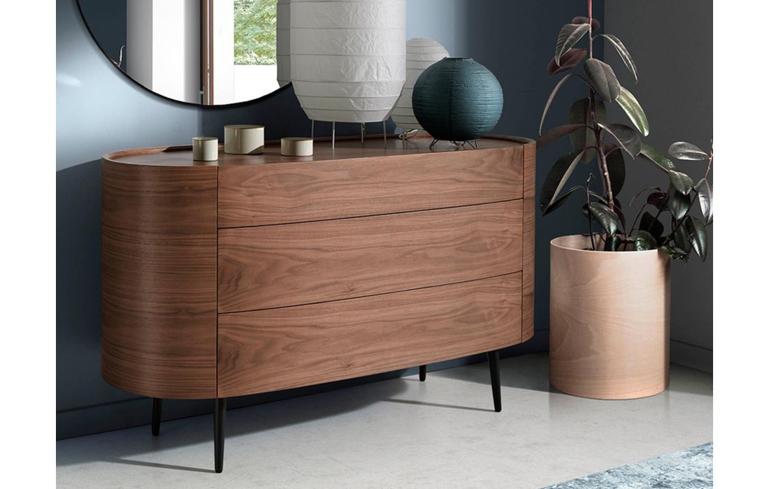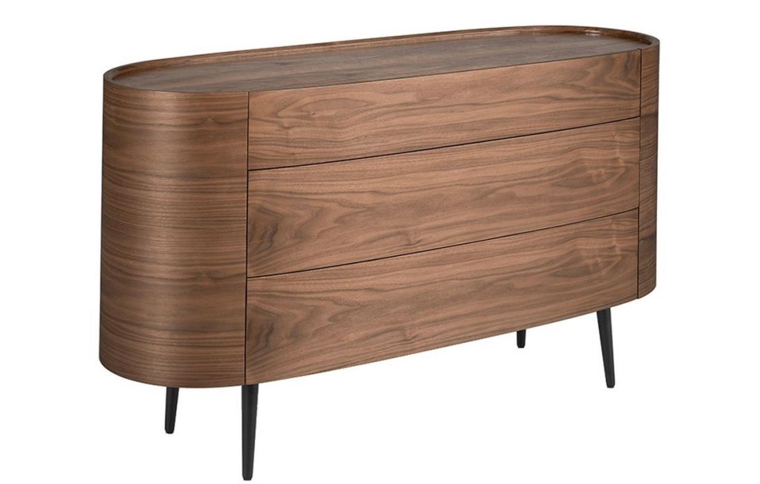 Oval chest of drawers in 0.5 mm thick natural walnut wood with 3 hidden drawers. Black painted wooden feet.
