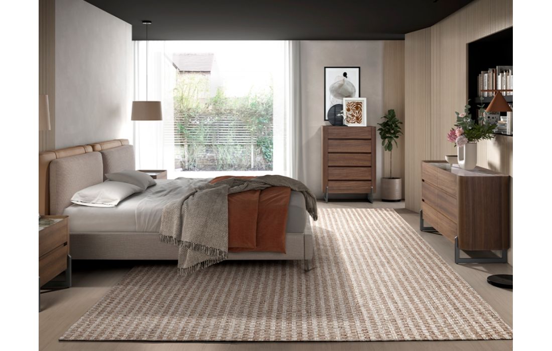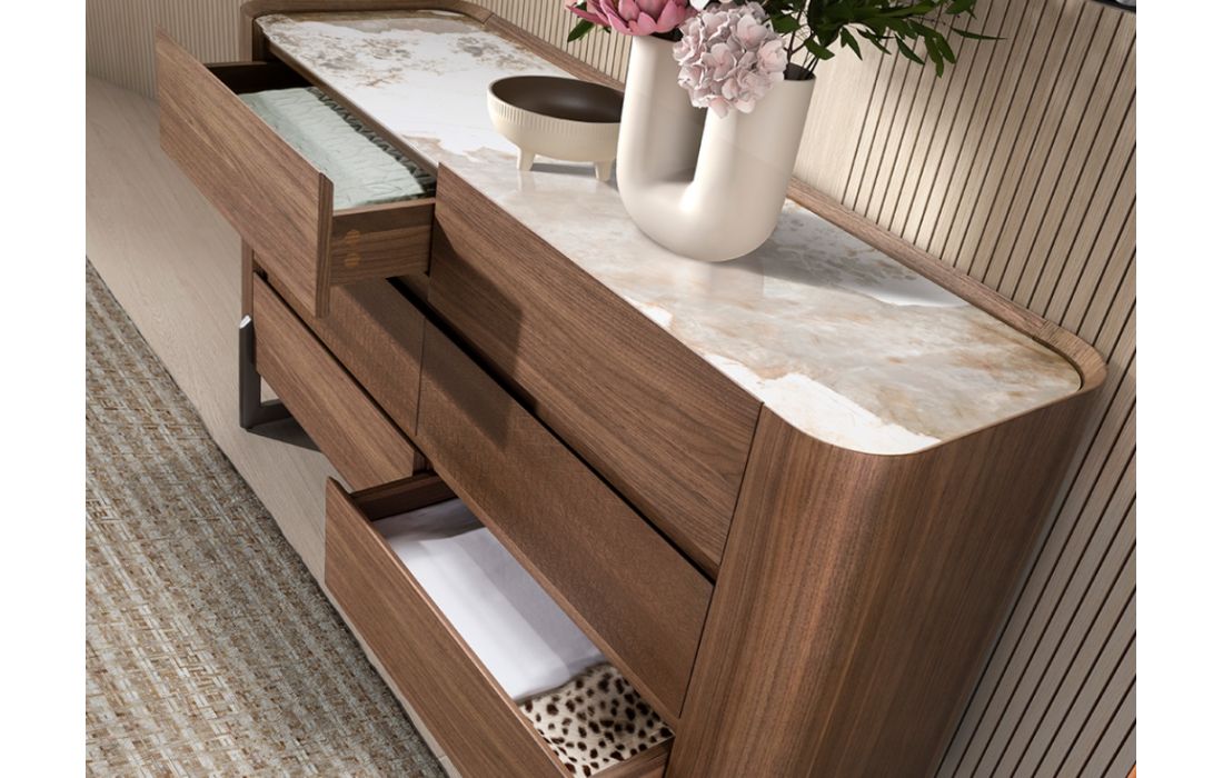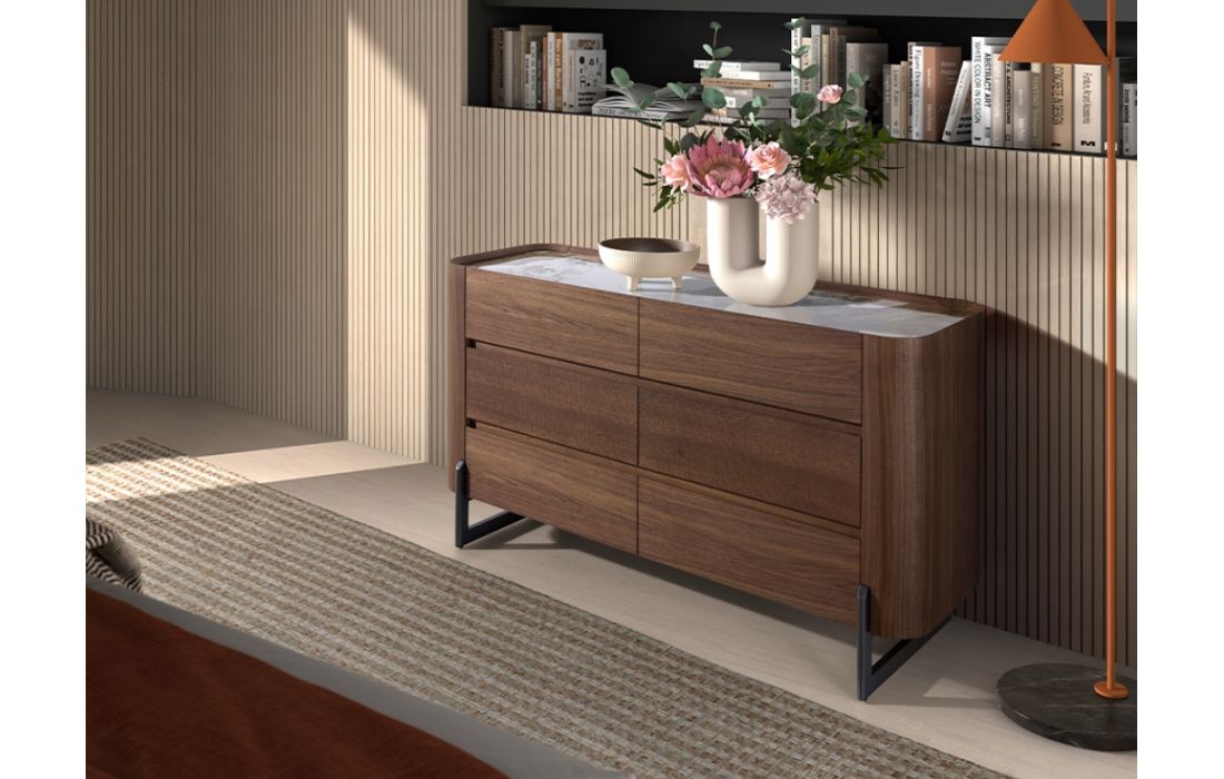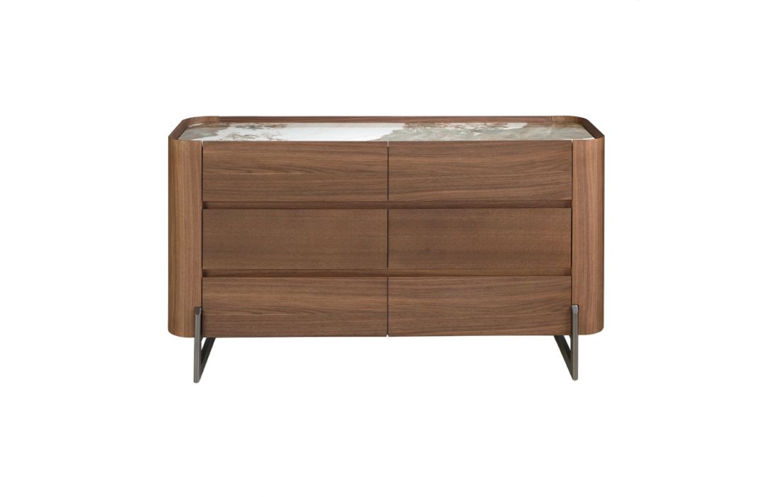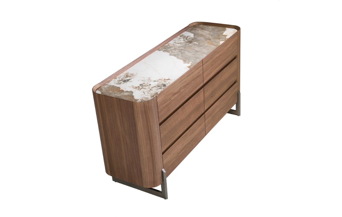 Chest of drawers with wooden structure veneered in natural walnut and original dark metallic stainless steel legs and marble top.