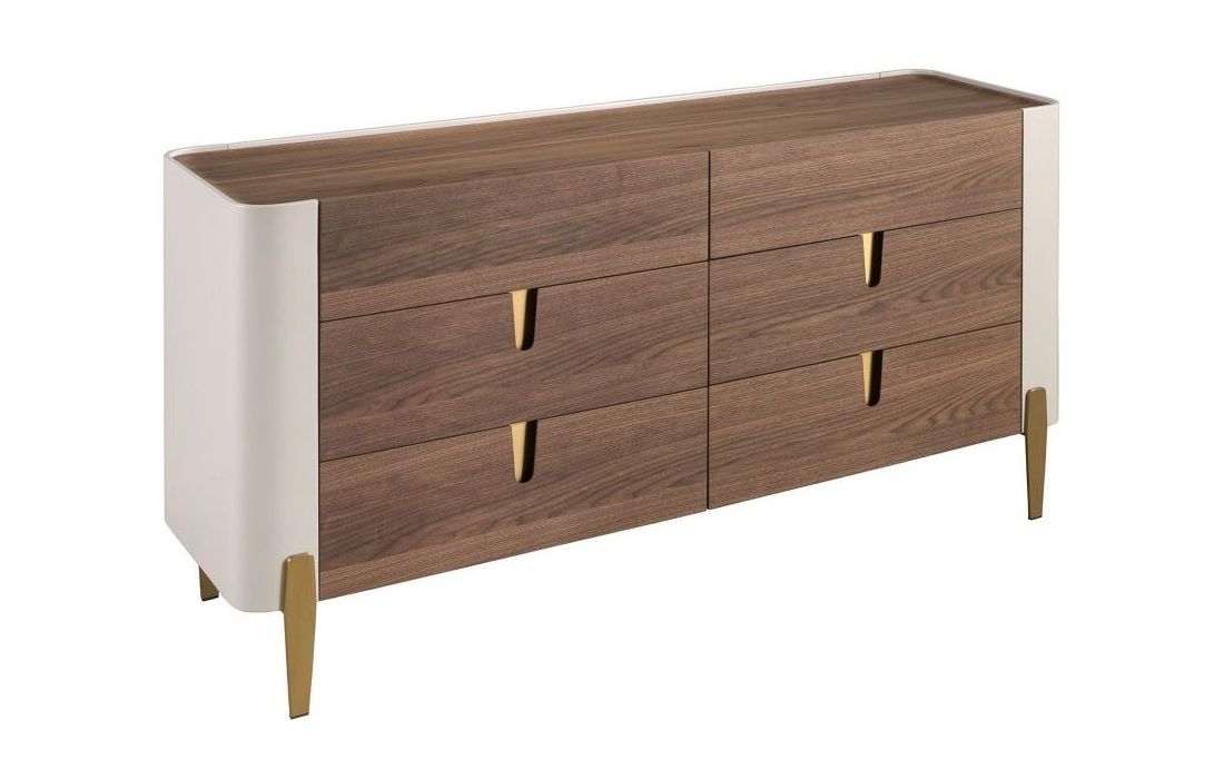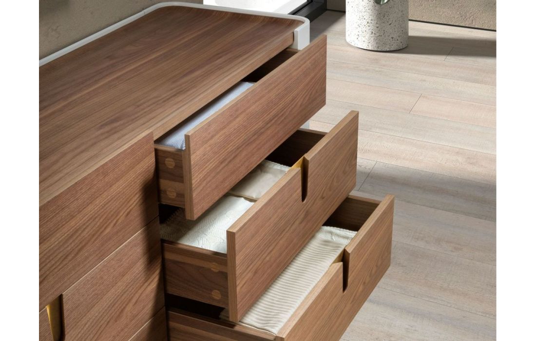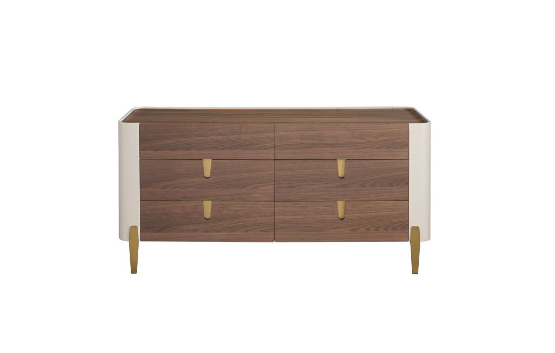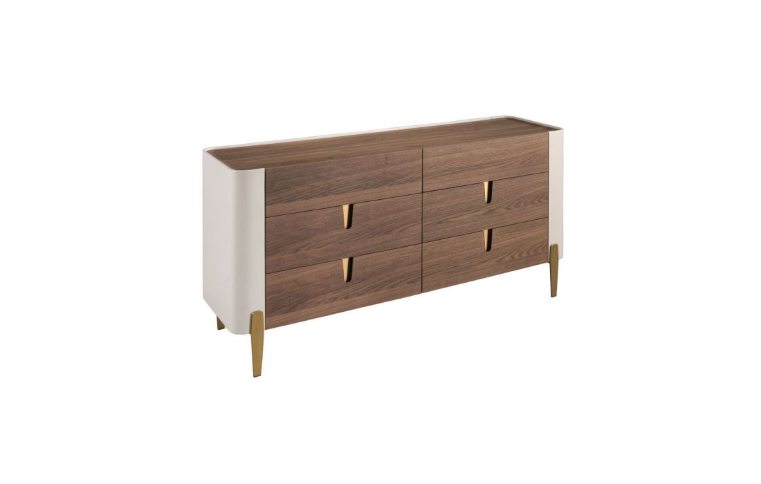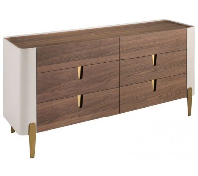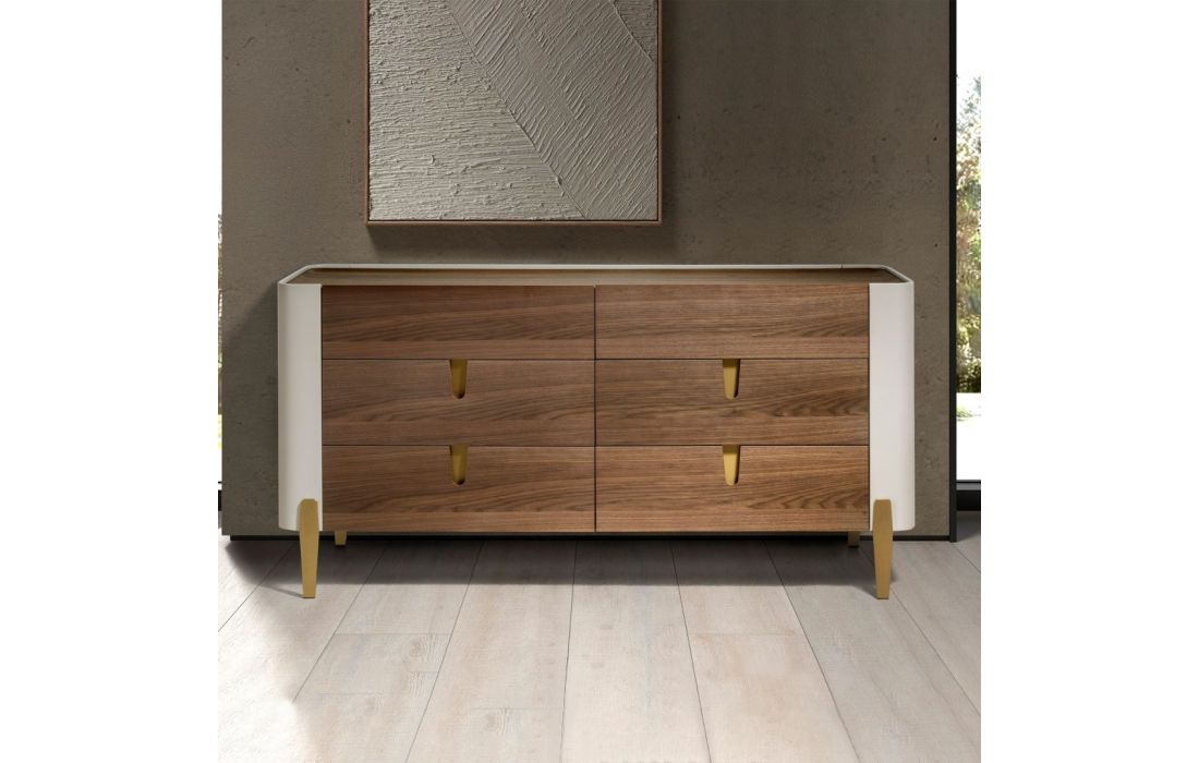 Modern design chest of drawers with walnut MDF and lacquered MDF structure, stainless steel legs, with original stainless steel detail and has ample storage space with 6 drawersRecipient :