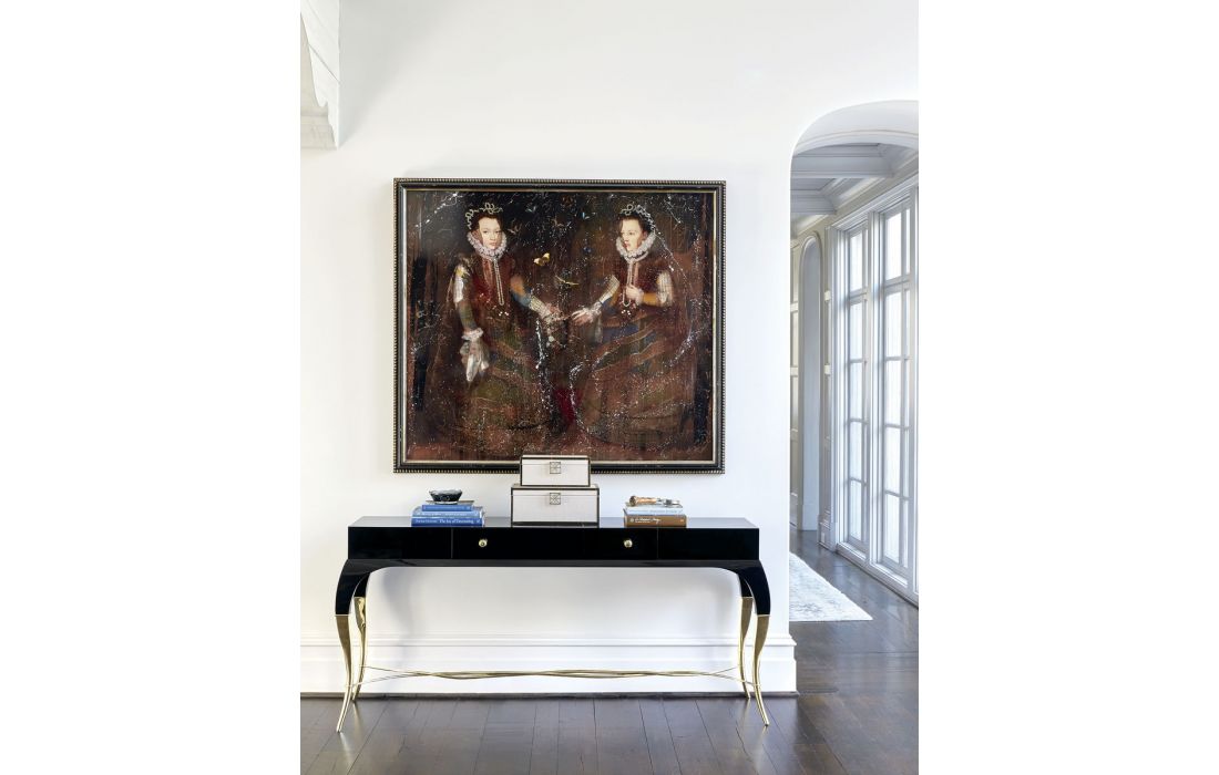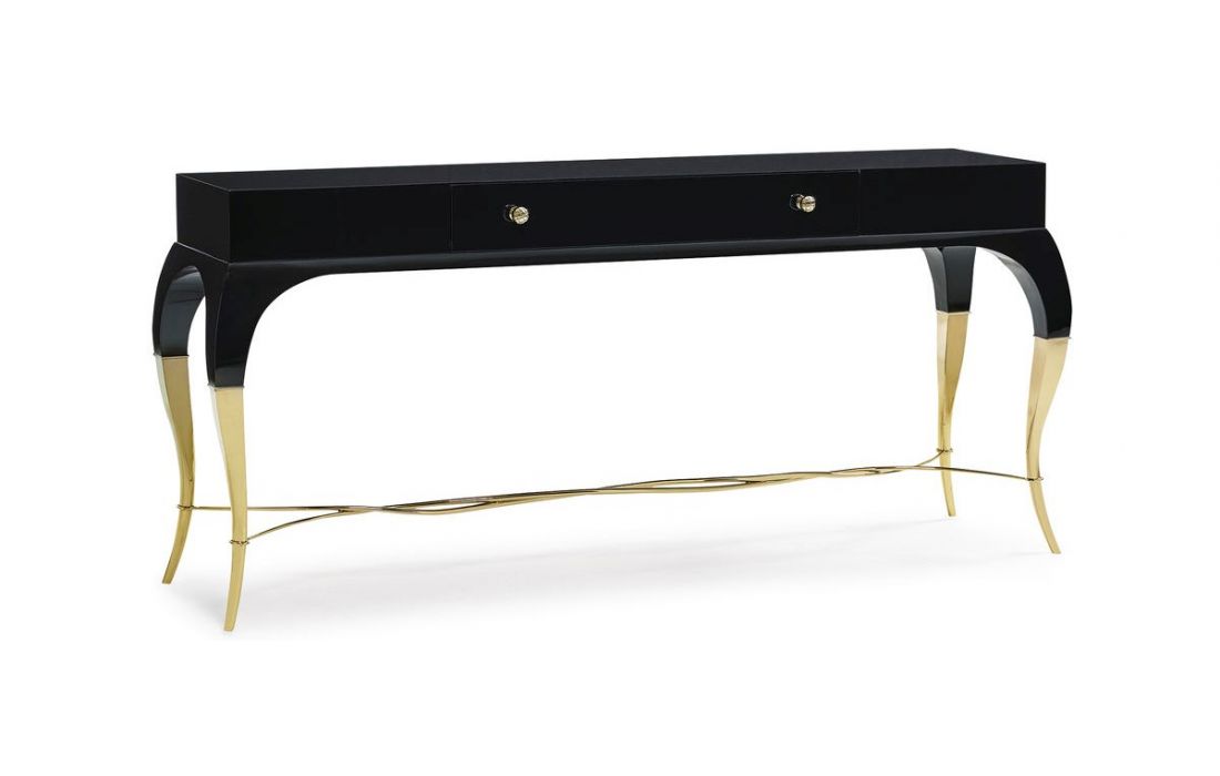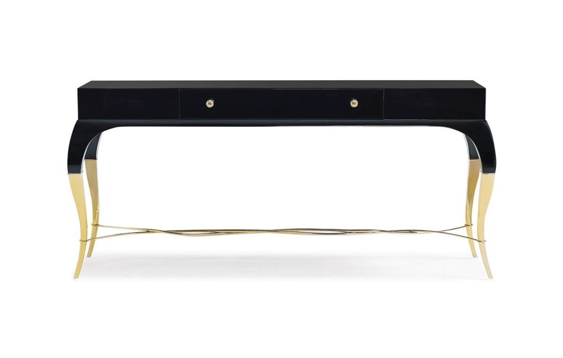 Console with 1 drawer, gold handle, black shiny "Piano Black" and feet in "Majestic Gold".