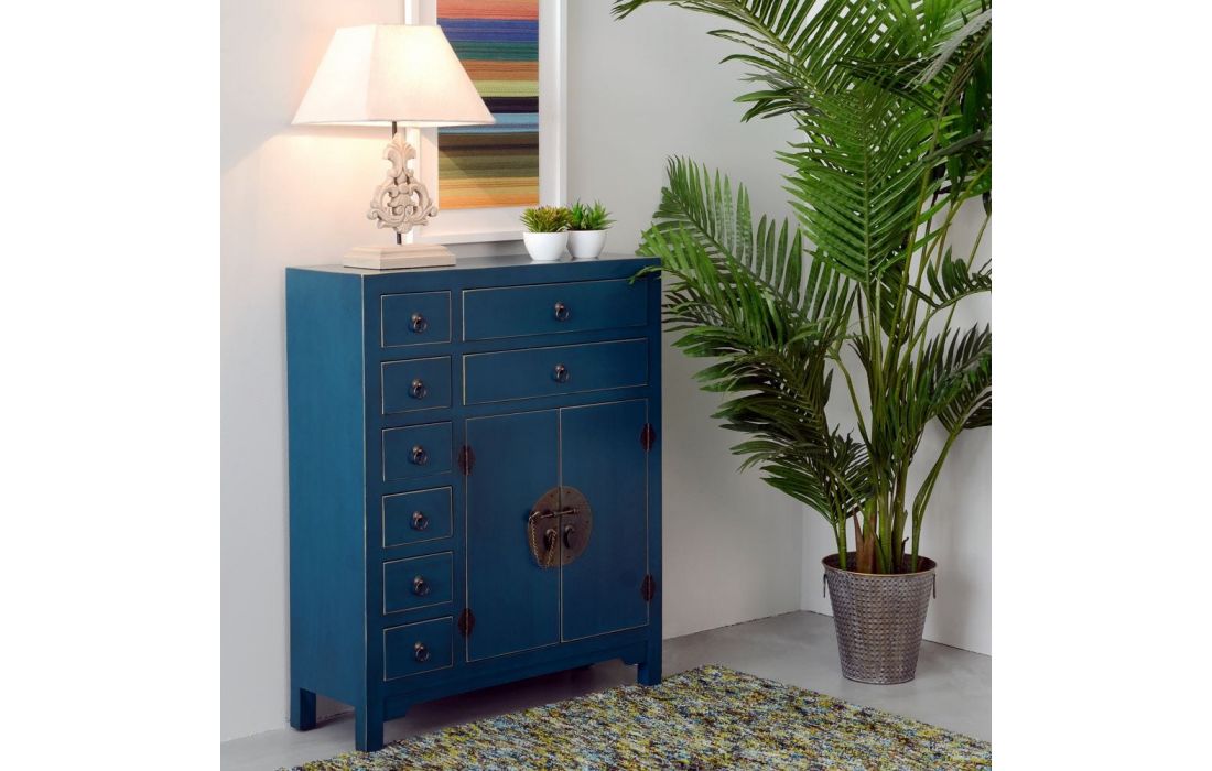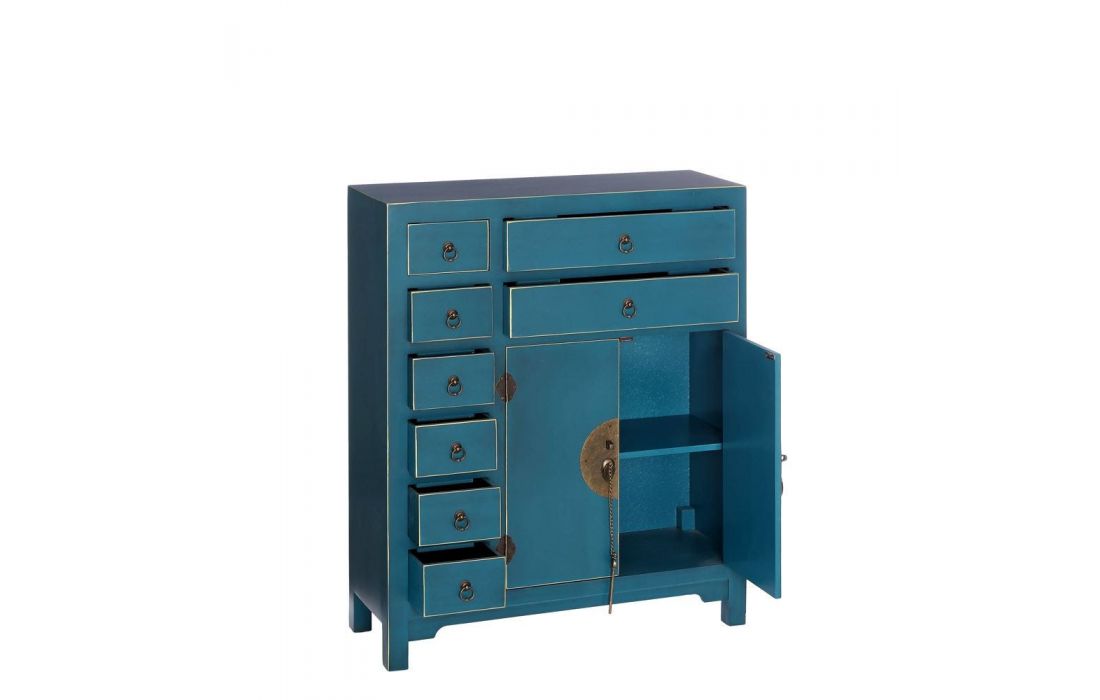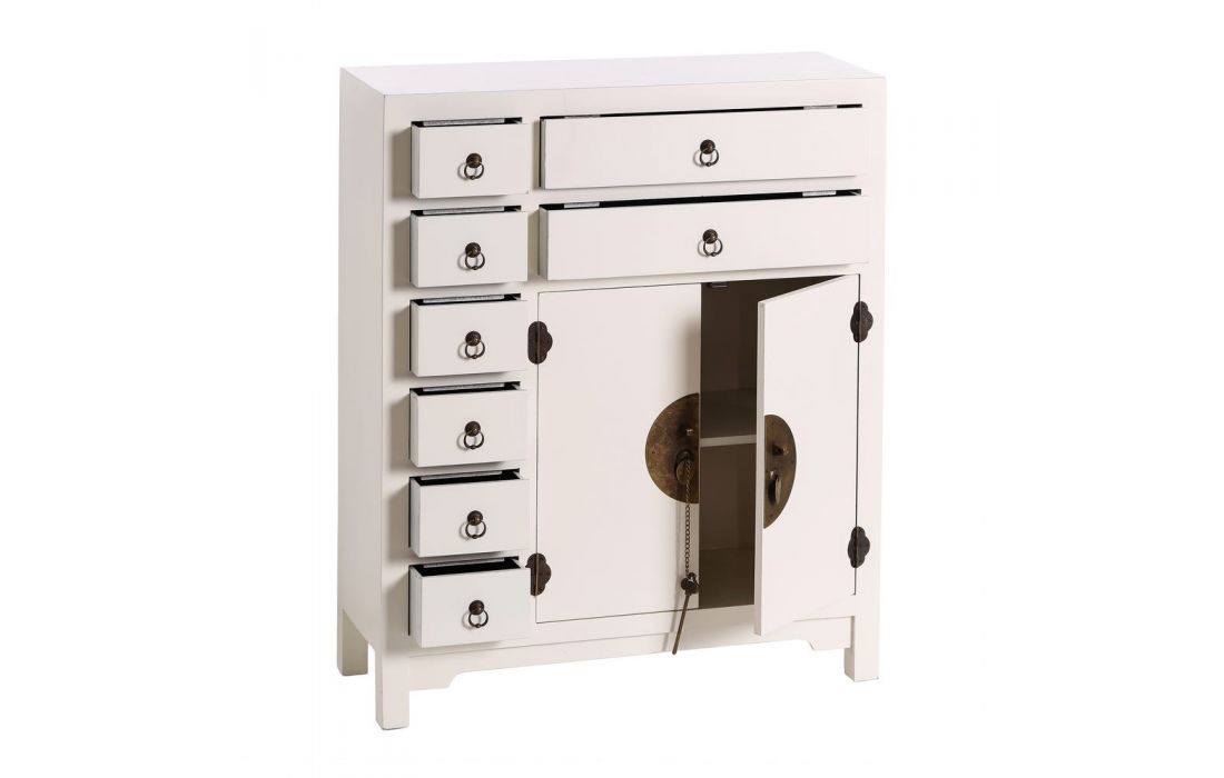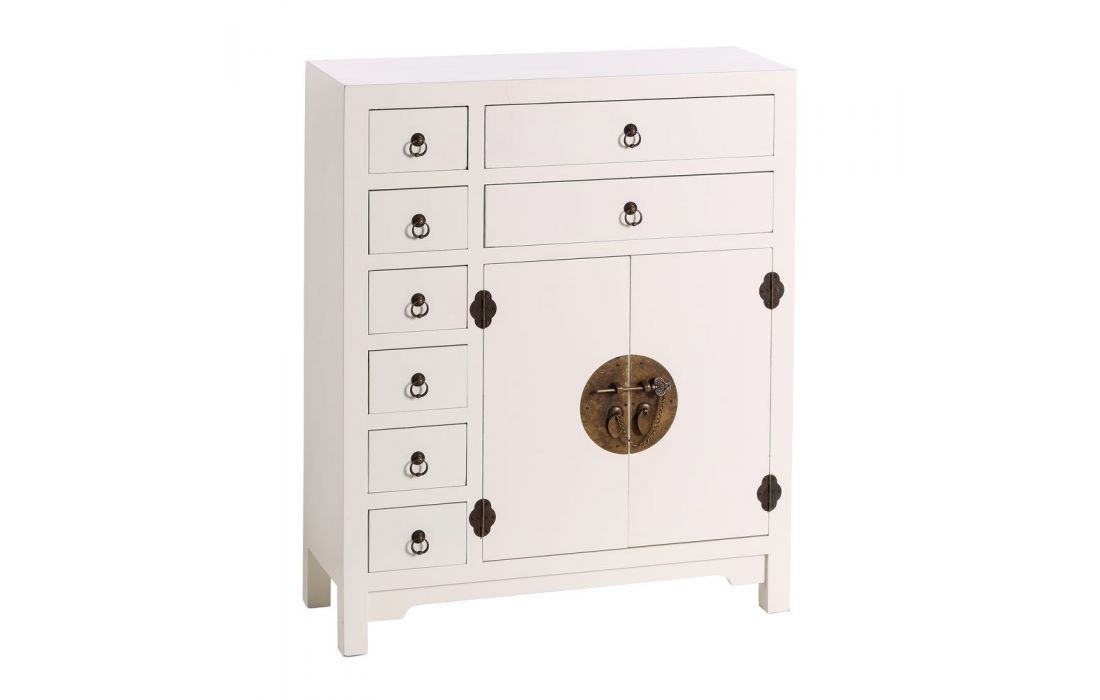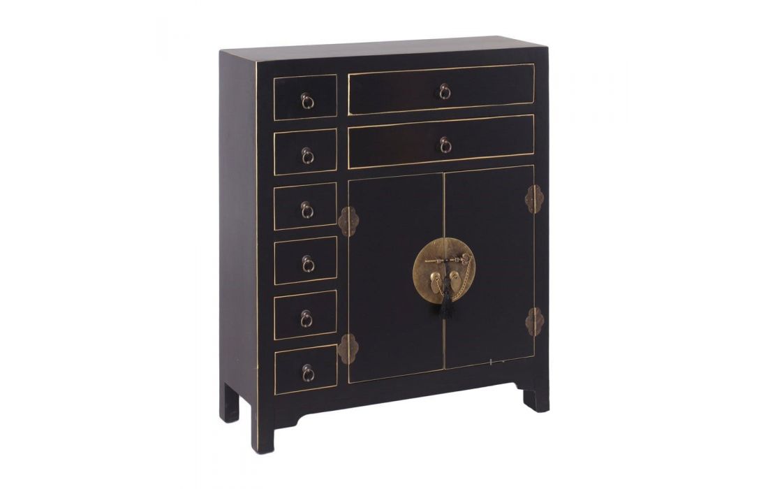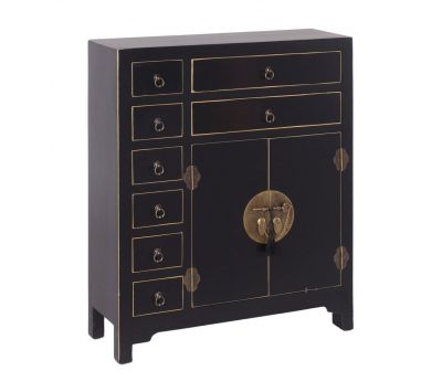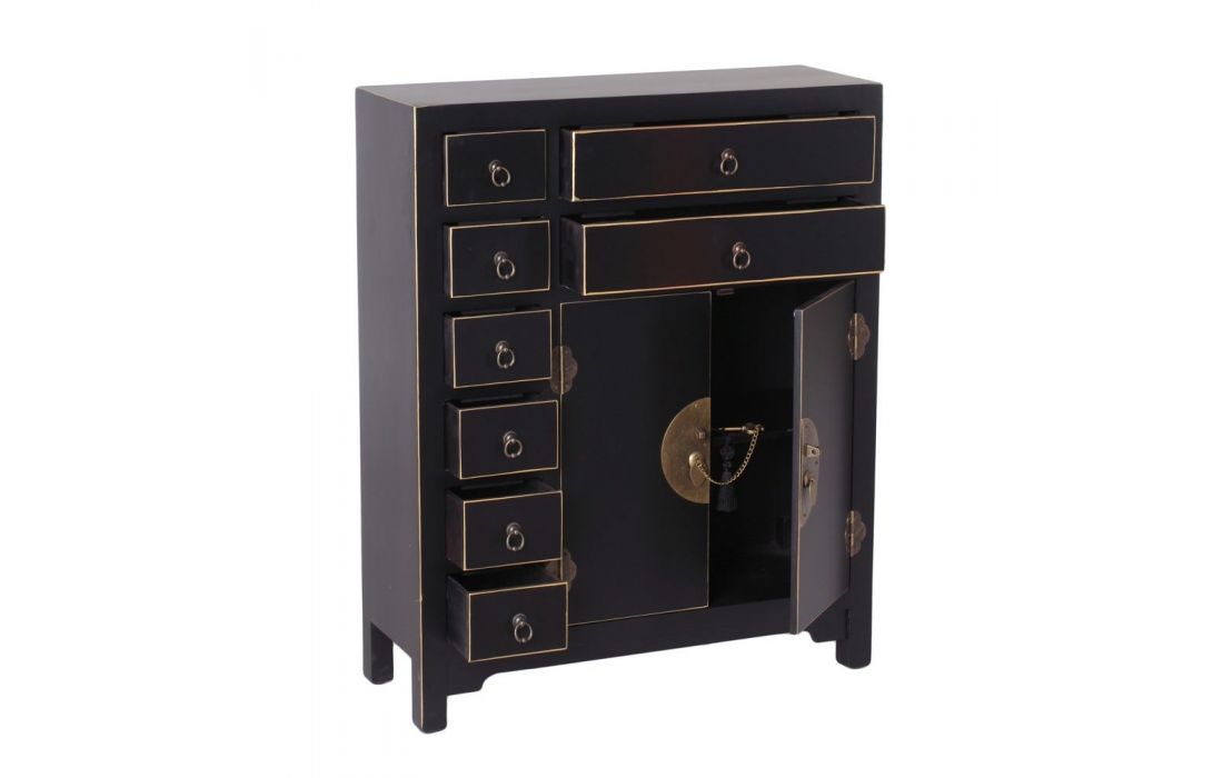 MDF cabinet w / 2 doors and 8 drawers and gold metal handles available in 4 colors, black, white, red and blue.