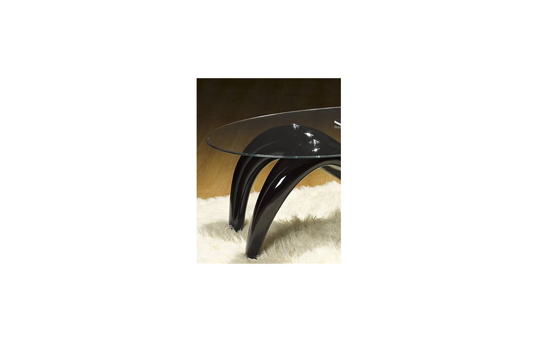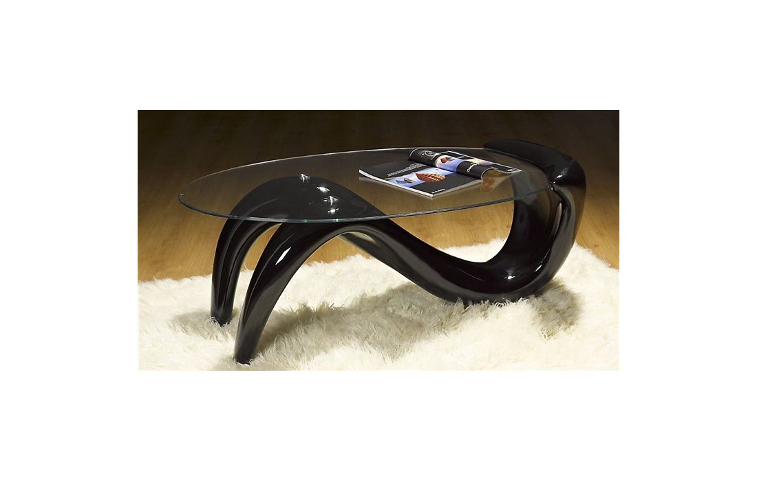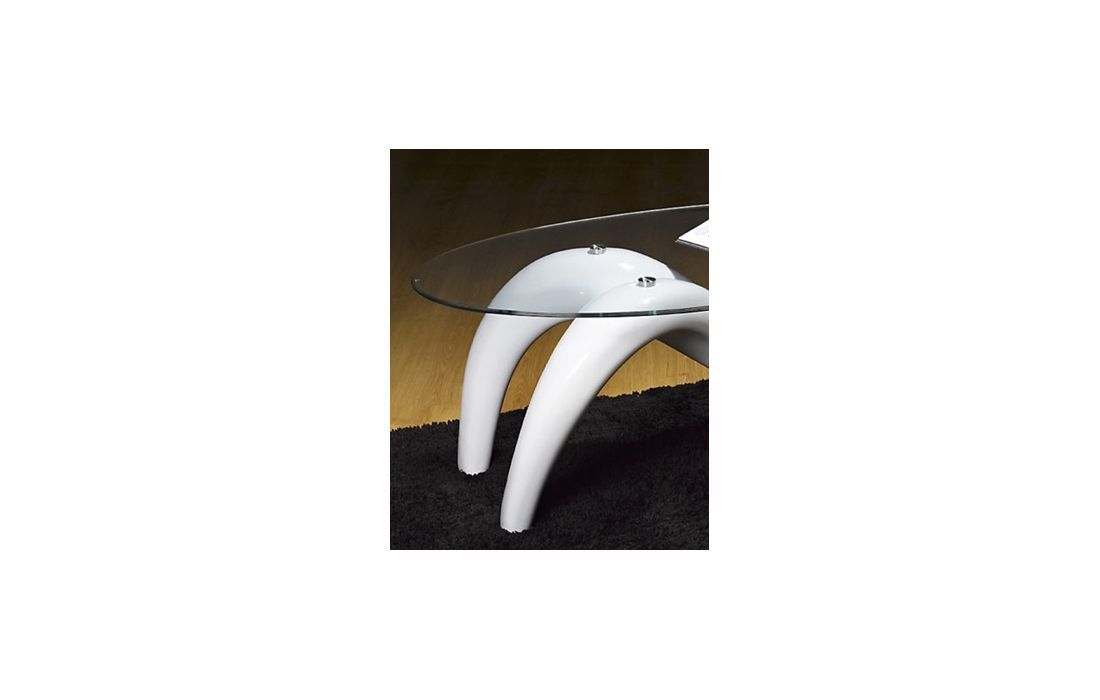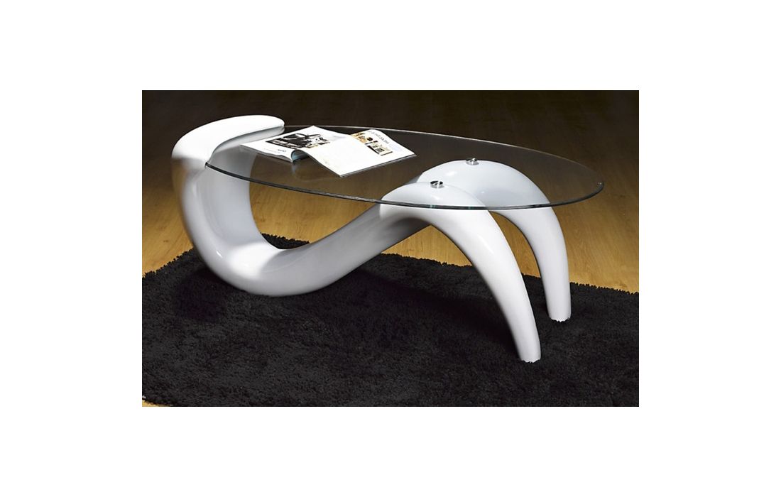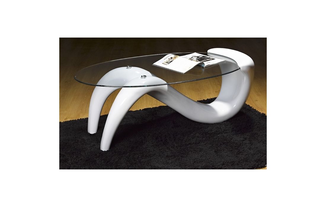 Coffee table with white or black fiberglass structure and glass top.