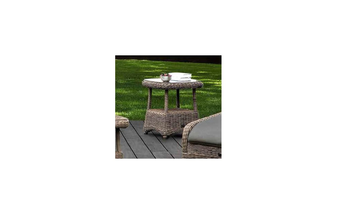 Coffee table in gray kubu rattan with glass top, for outdoor use.