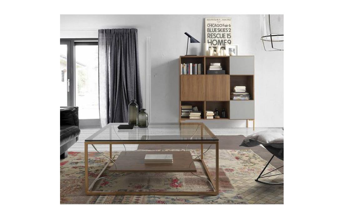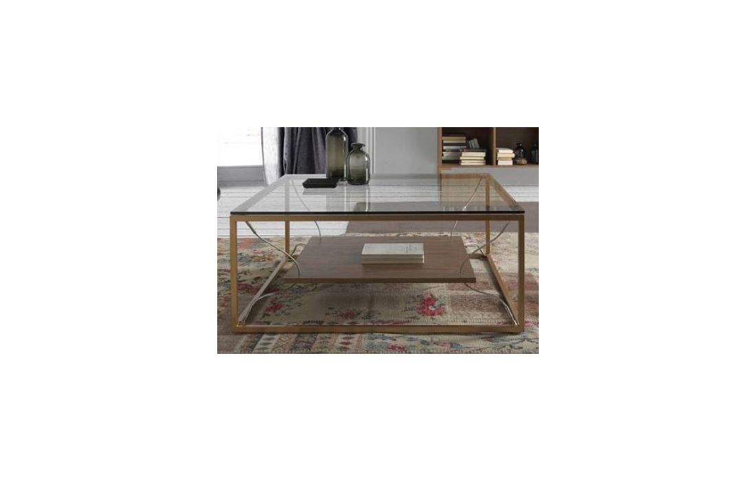 Coffee table with structure in copper metal, top glass top and bottom in walnut.