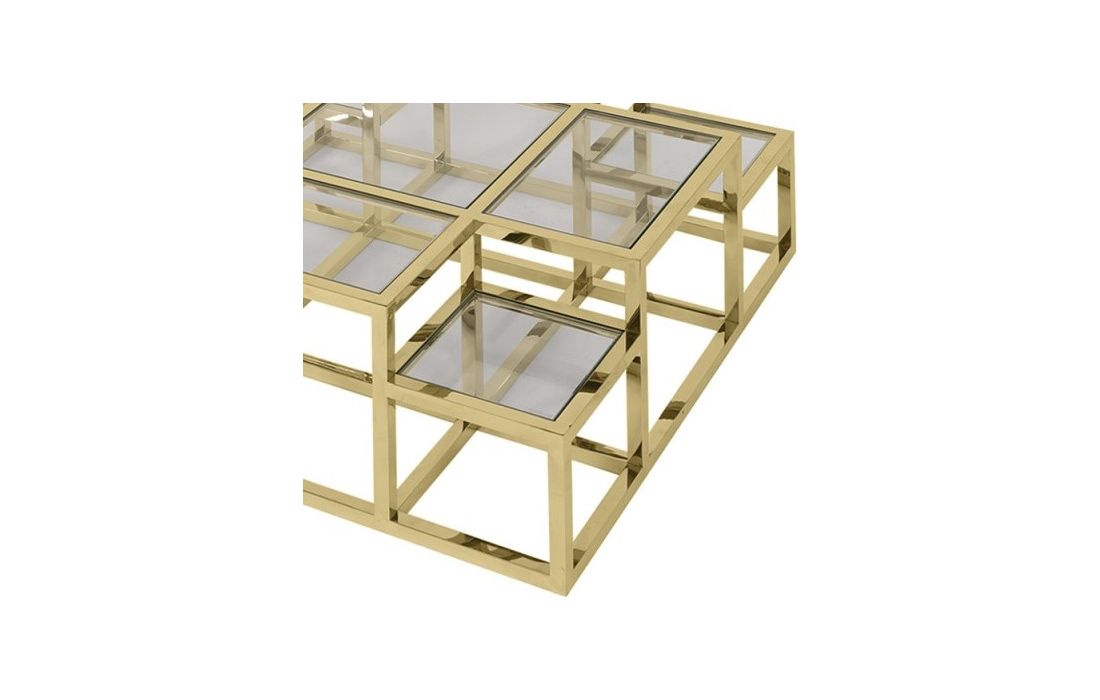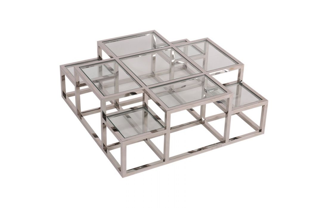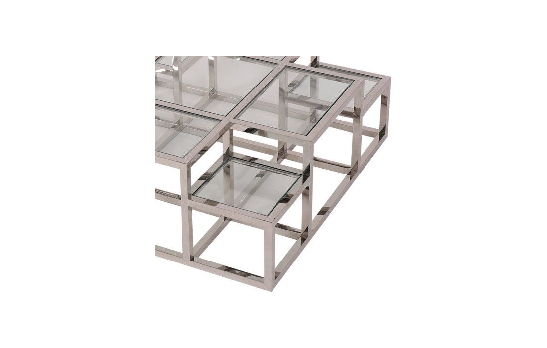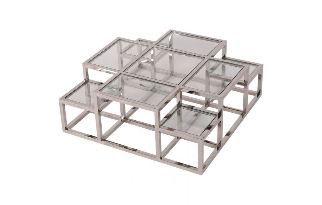 Coffee table with stainless steel base and glass top.