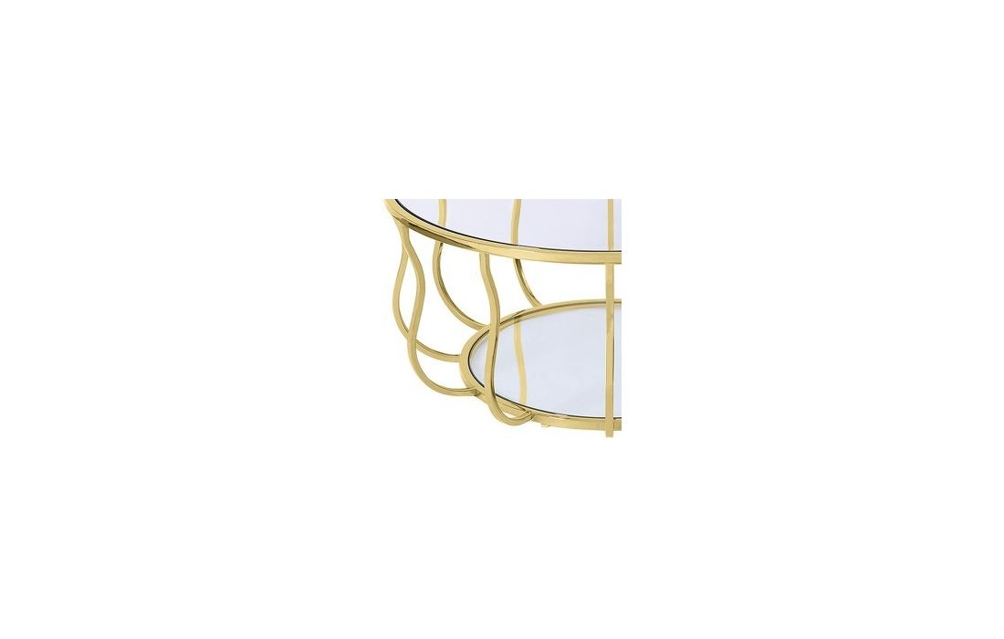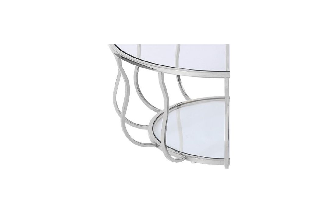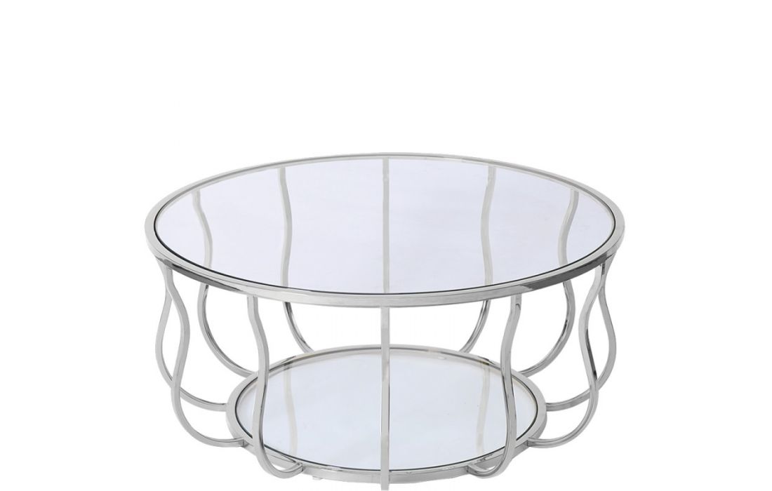 Coffee table with stainless steel base and glass top.
