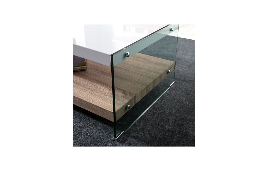 Coffee table with white lacquered top, the bottom with oak-colored vinyl and glass sides