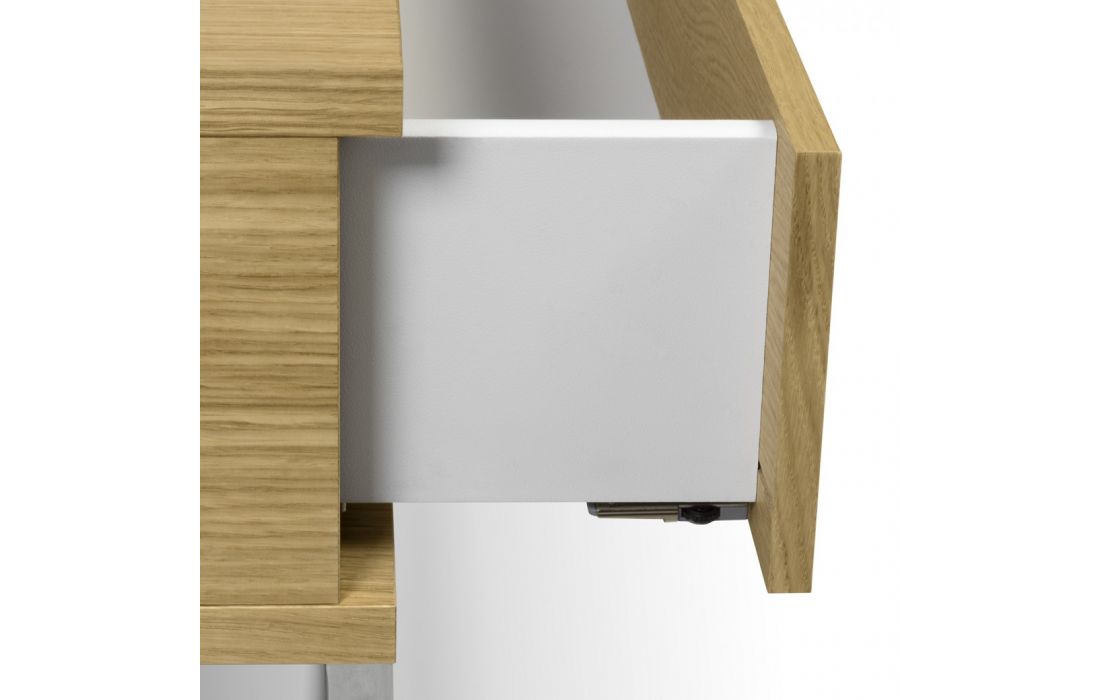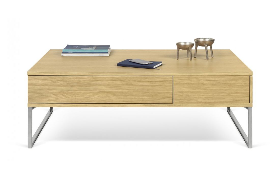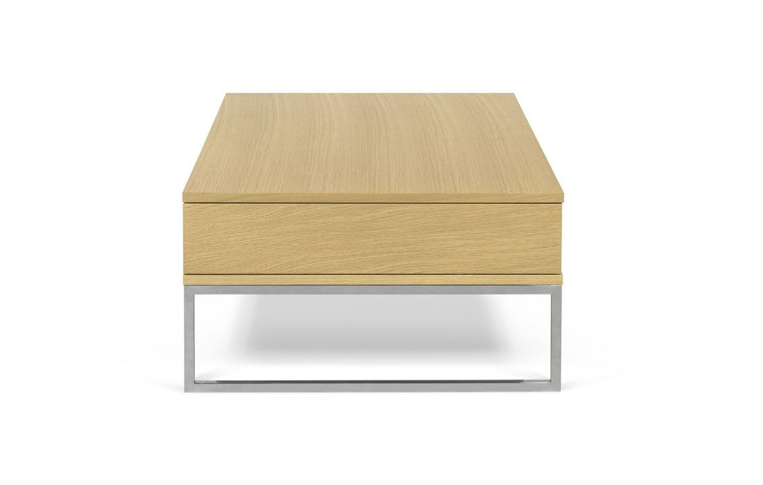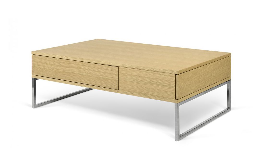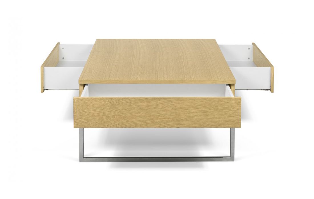 Coffee table with 3 drawers, veneered oak and chromed metal feet.