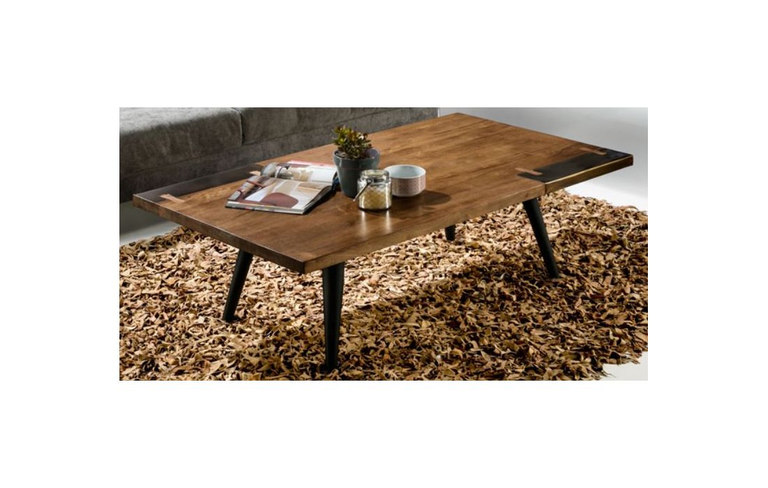 Wooden and metal coffee table. Wood top with decorative brass plates aged. Metallic tube feet, black finish.
