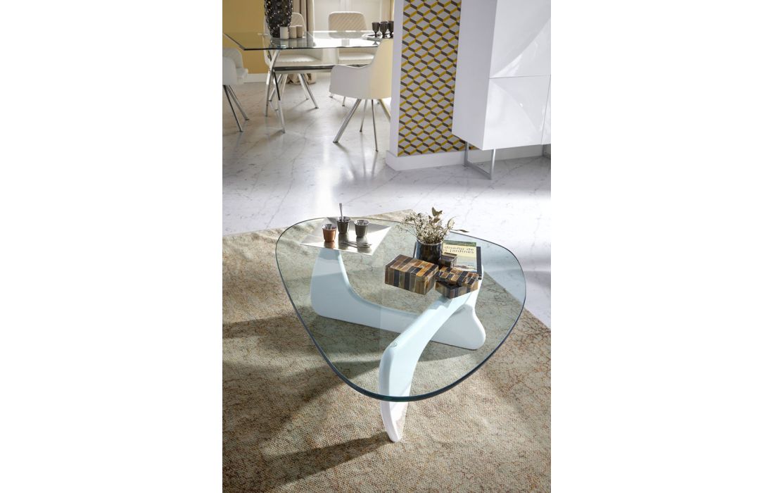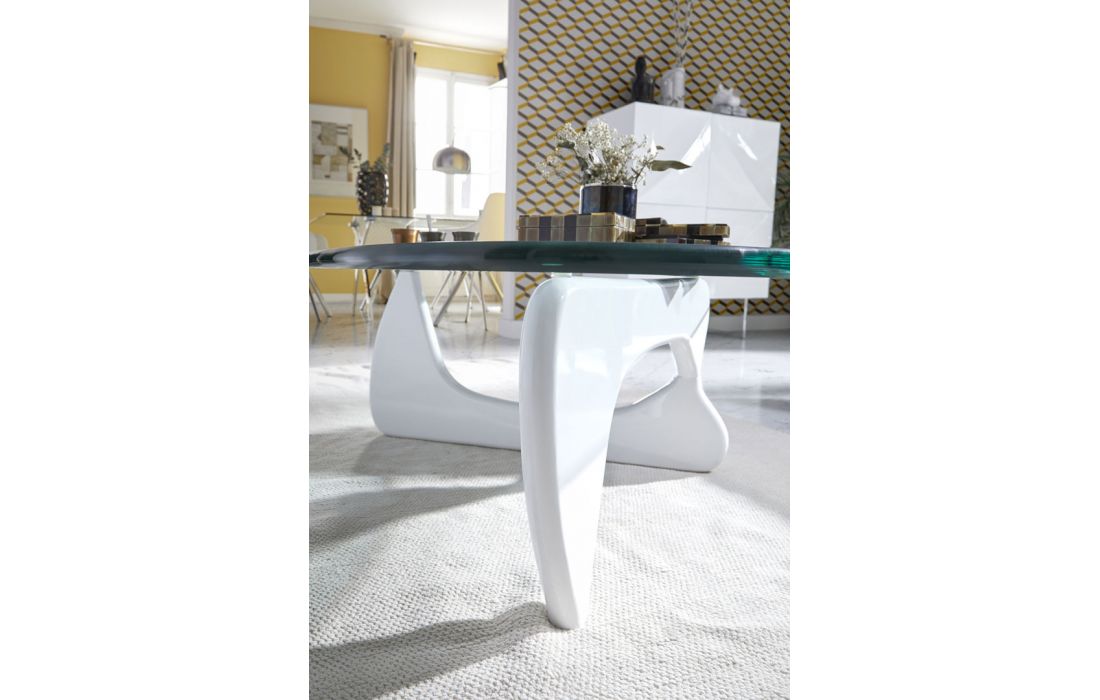 Coffee table with tempered glass top with white gloss lacquered foot.