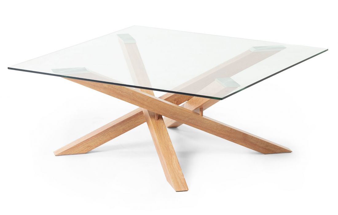 Coffee table square topped transparent tempered glass 10 mm thick metal structure with wooden finish.