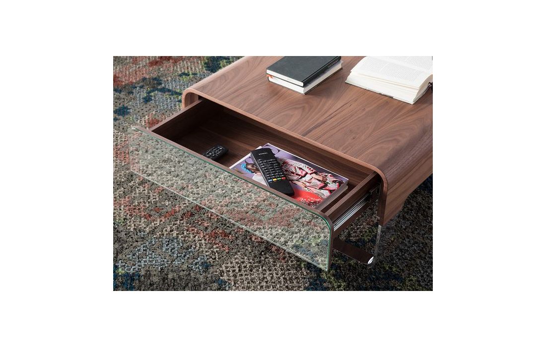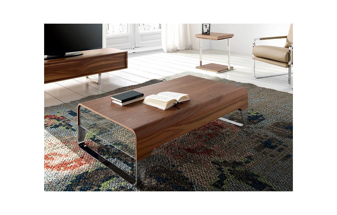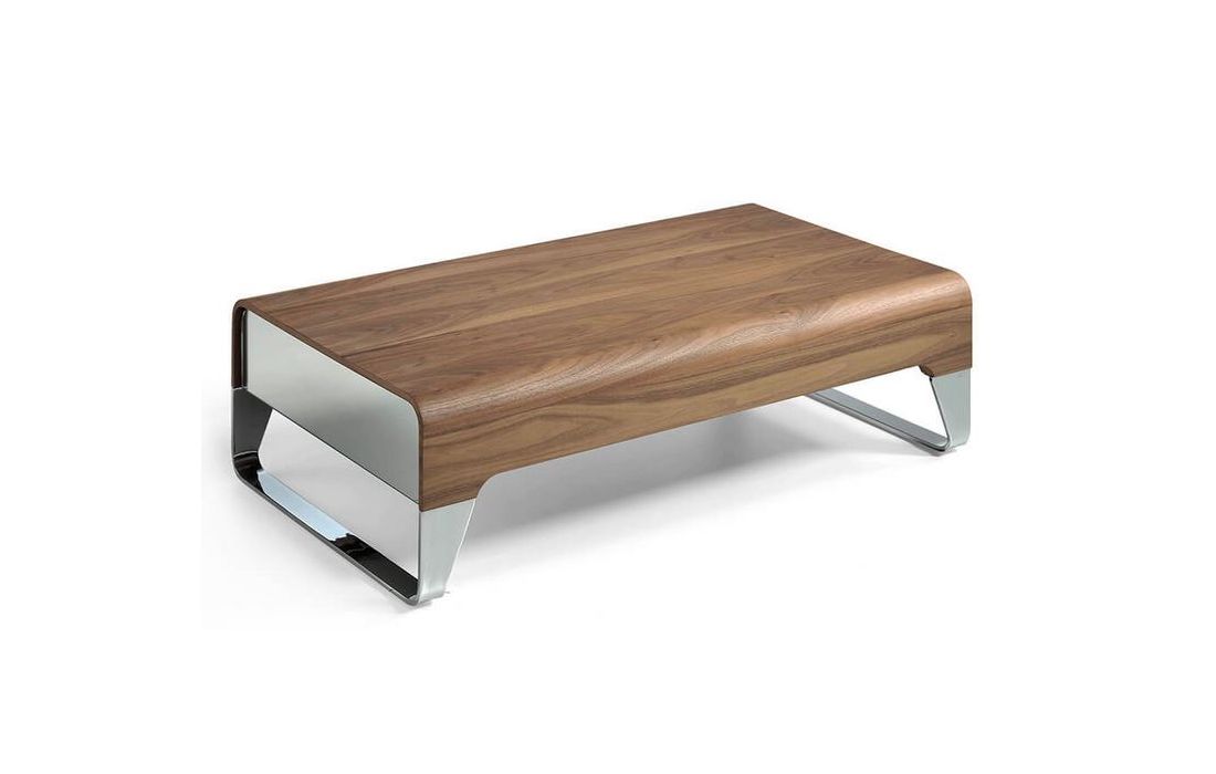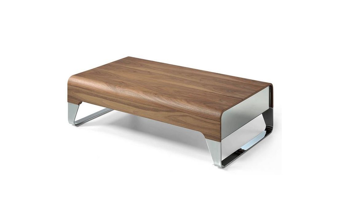 Coffee table with 2 side drawers, walnut structure, stainless steel feet.