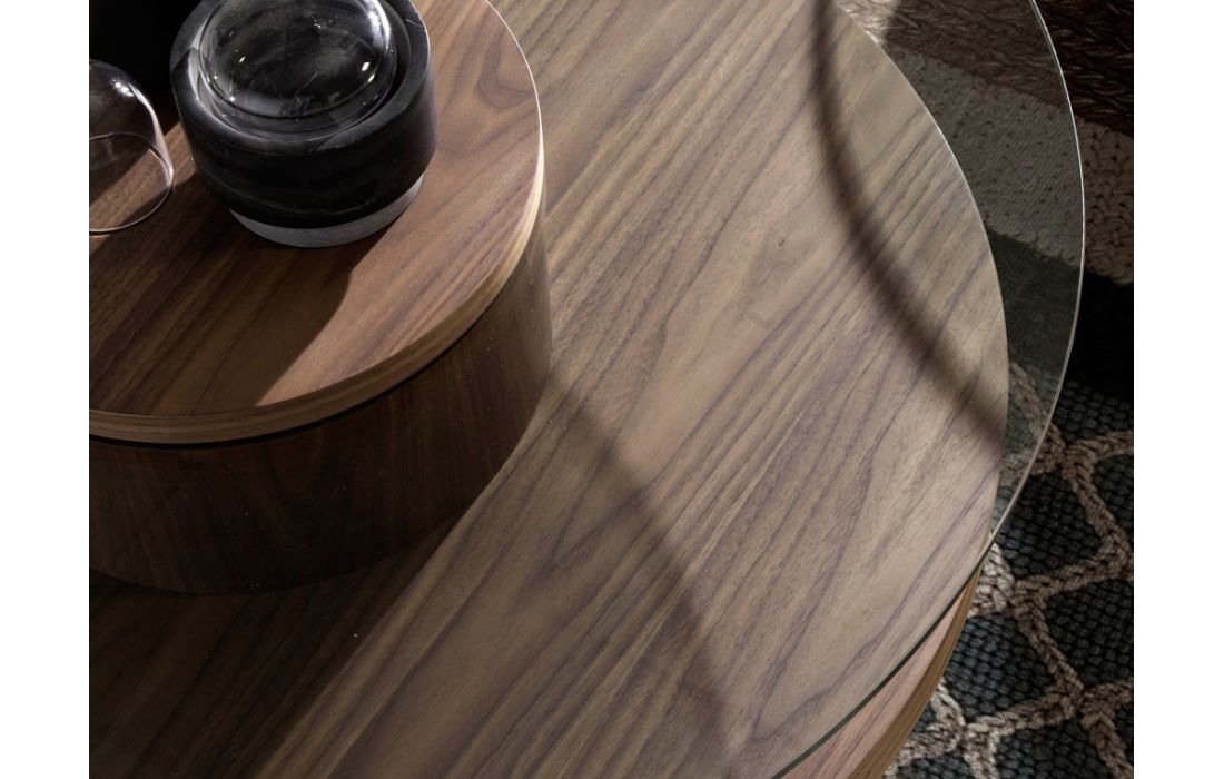 Round coffee table made of walnut-veneered ash wood and tempered glass top.