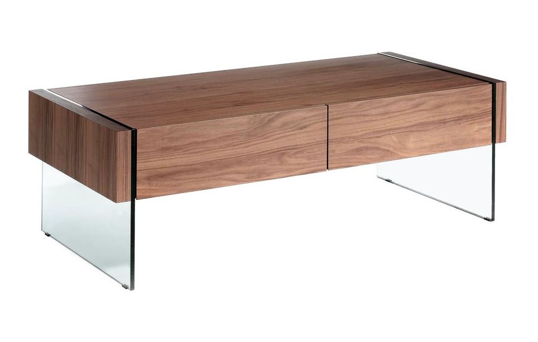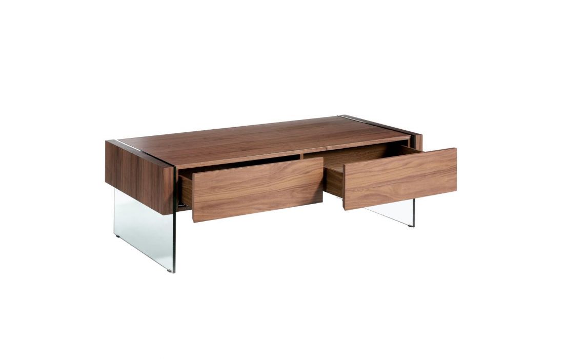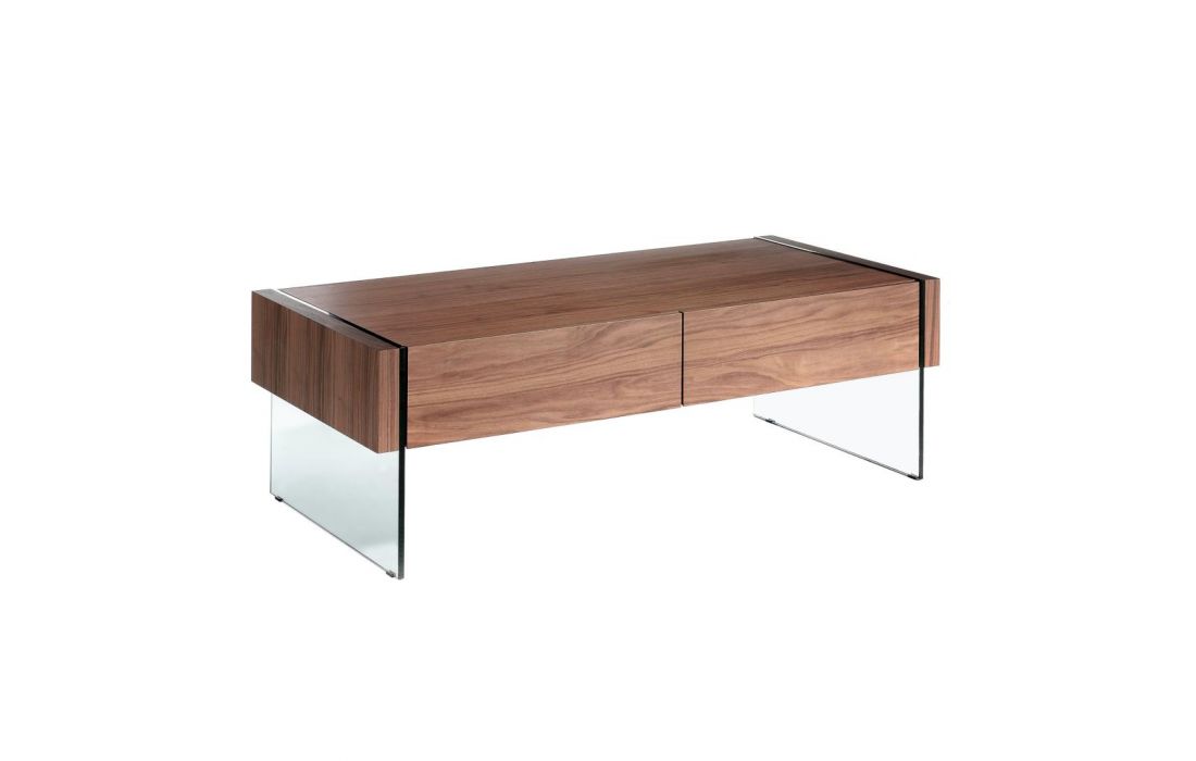 Rectangular coffee table with a modern design, made of natural walnut MDF and its tempered glass leg structure provides a modern and avant-garde touch with 2 drawersRecipient :