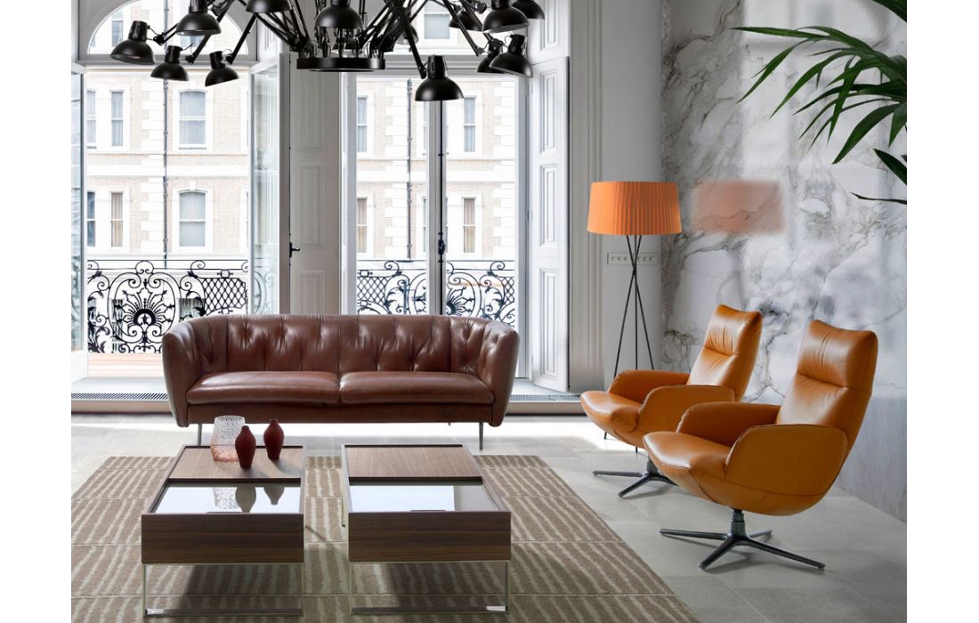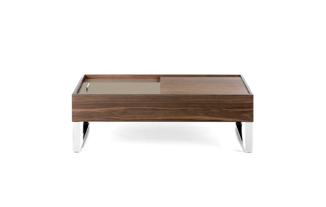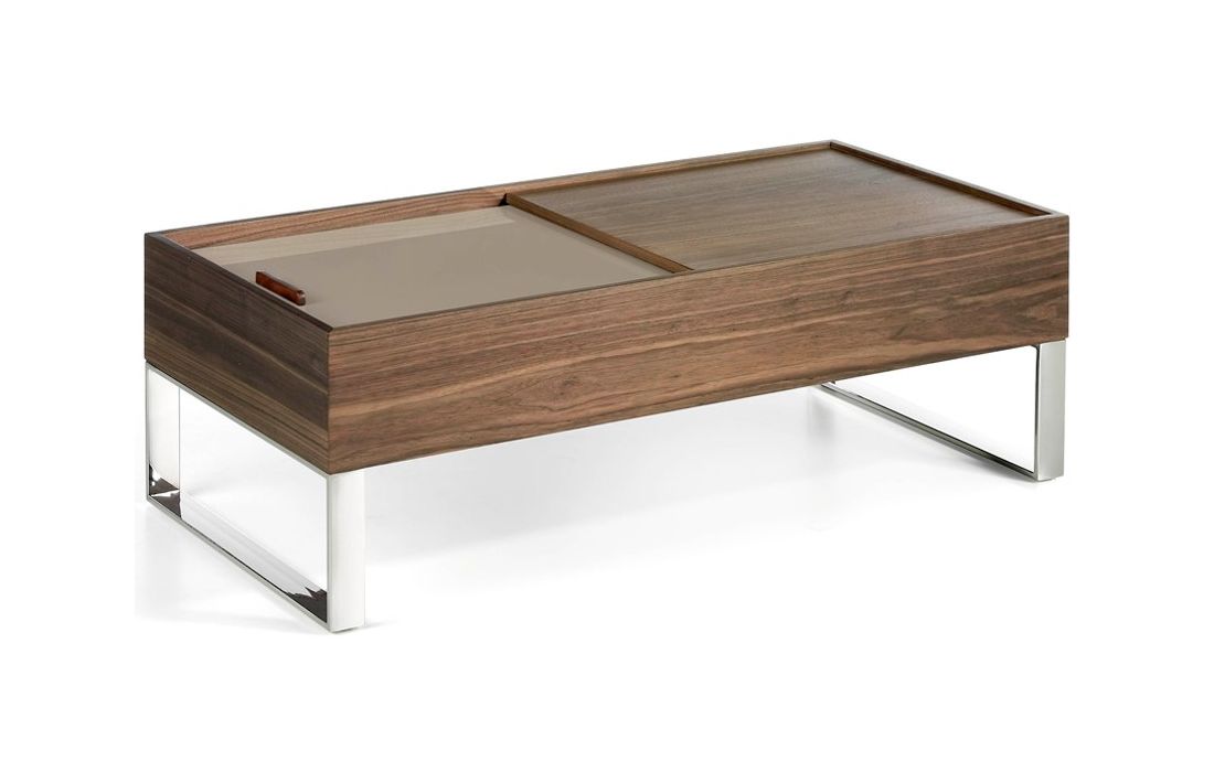 Coffee table with stainless steel feet. Sliding top cover inside cavity.