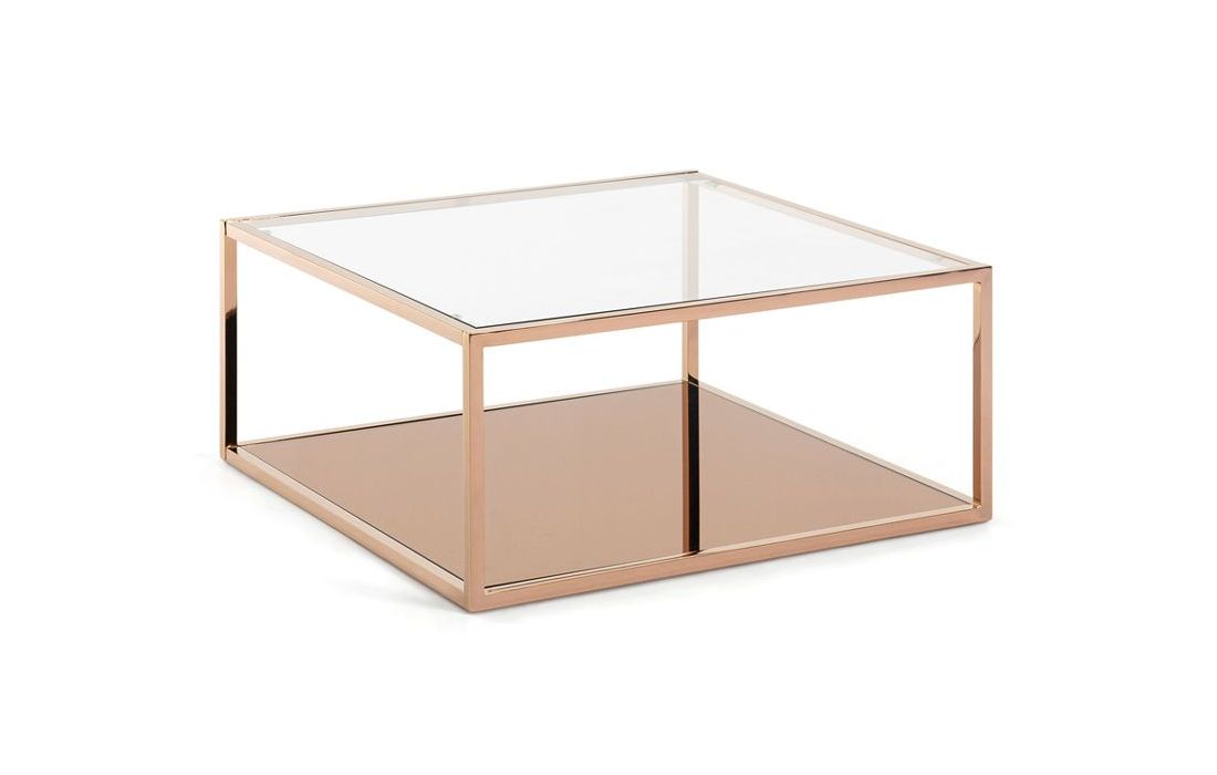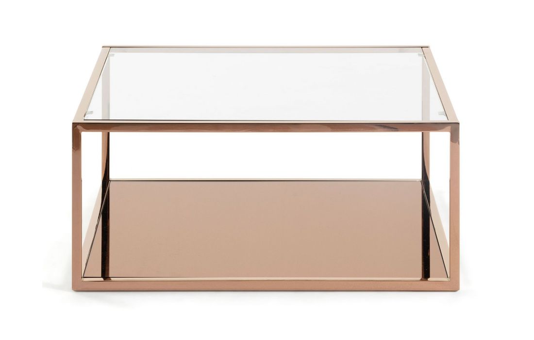 Rectangular coffee table with metal structure and glass top, both with copper finish and top top with transparent glass.