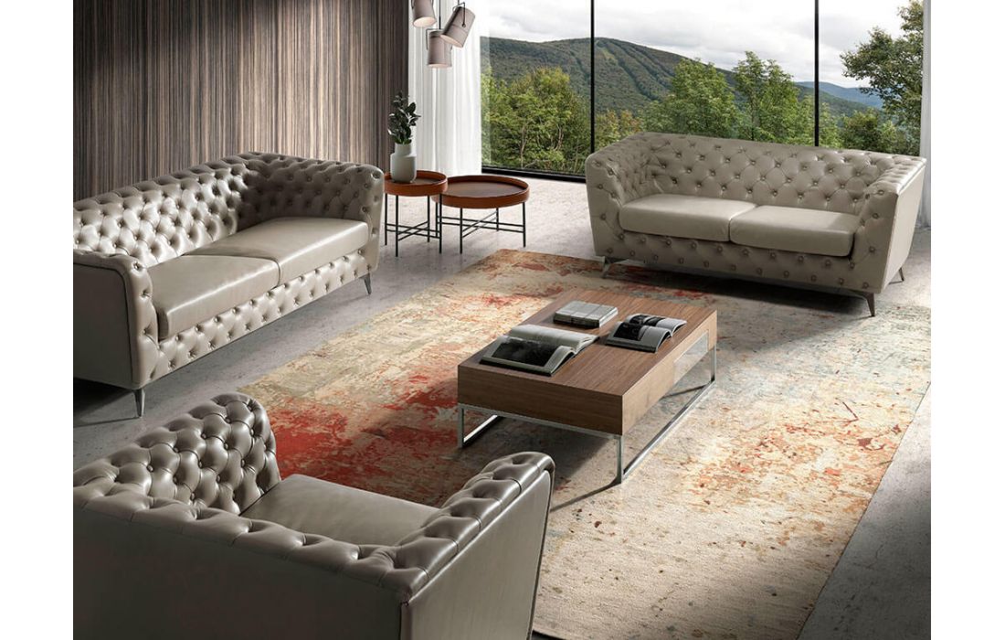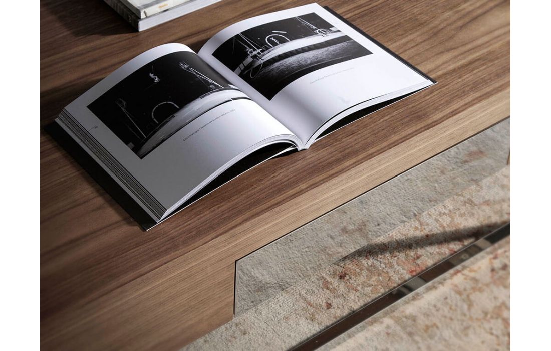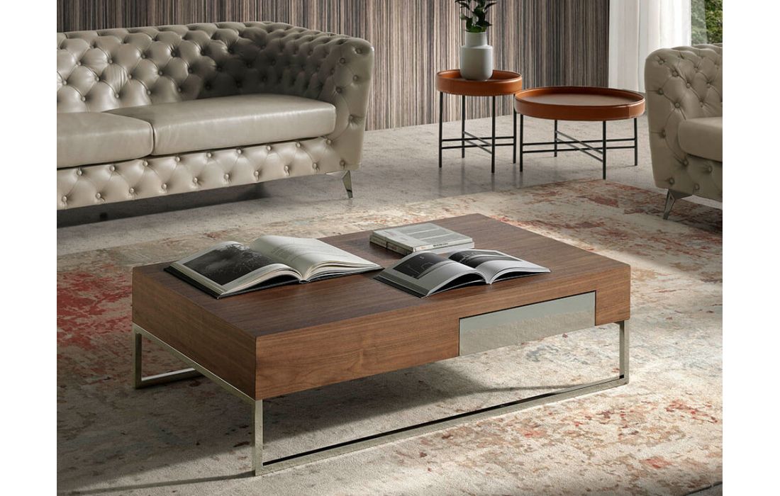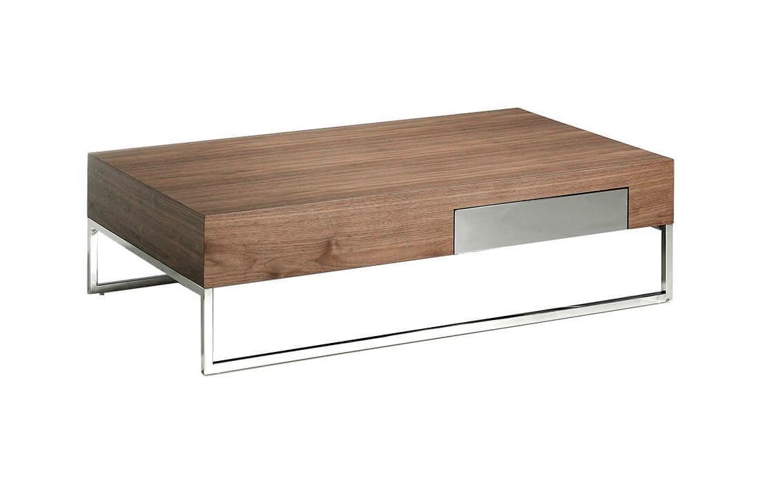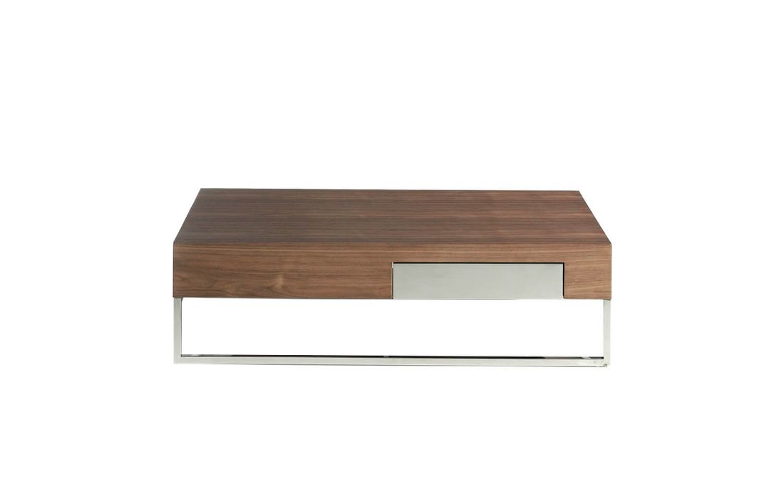 Coffee table in walnut veneered wood with front drawer and chromed stainless steel feet.