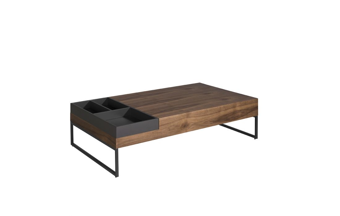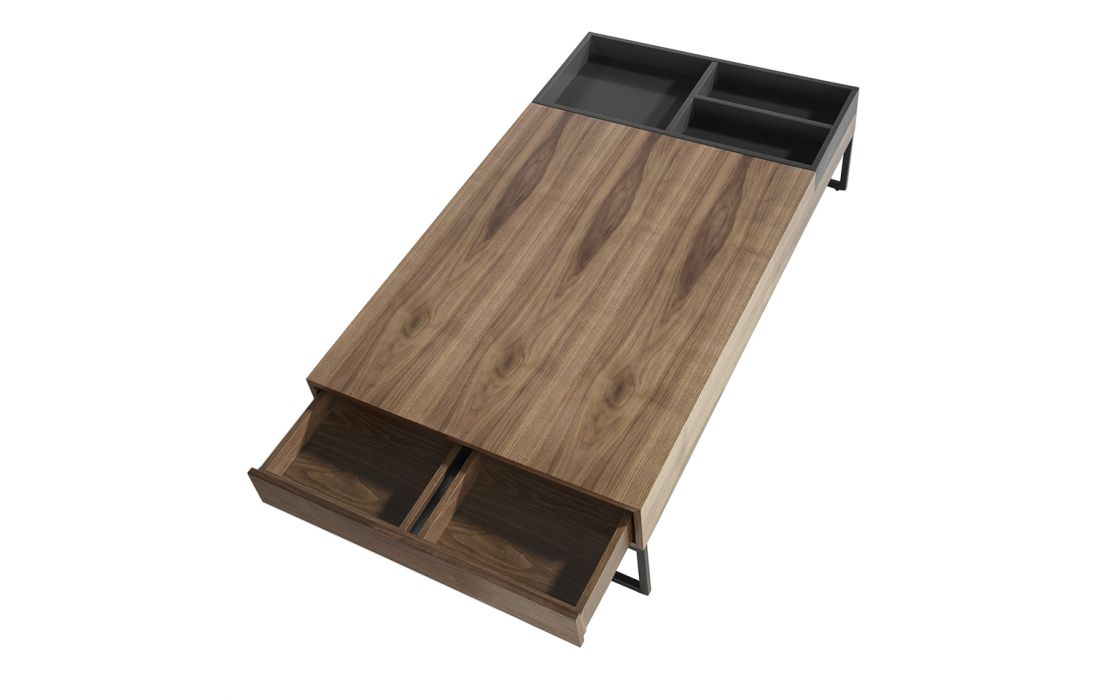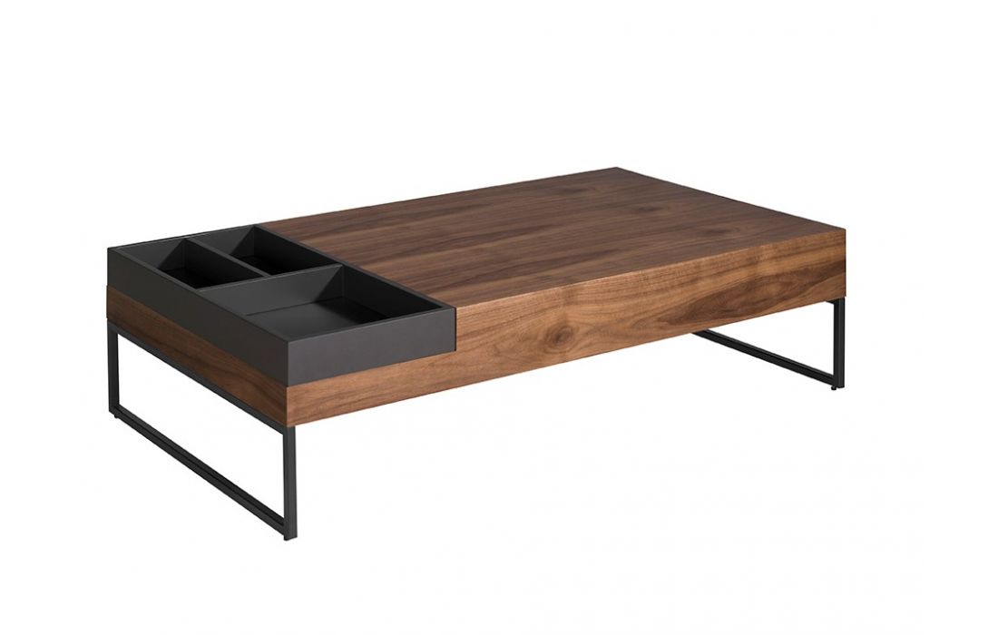 Rectangular coffee table in walnut wood with side drawer. Gray lacquered DM wooden tray with compartments. Black epoxy stainless steel feet.