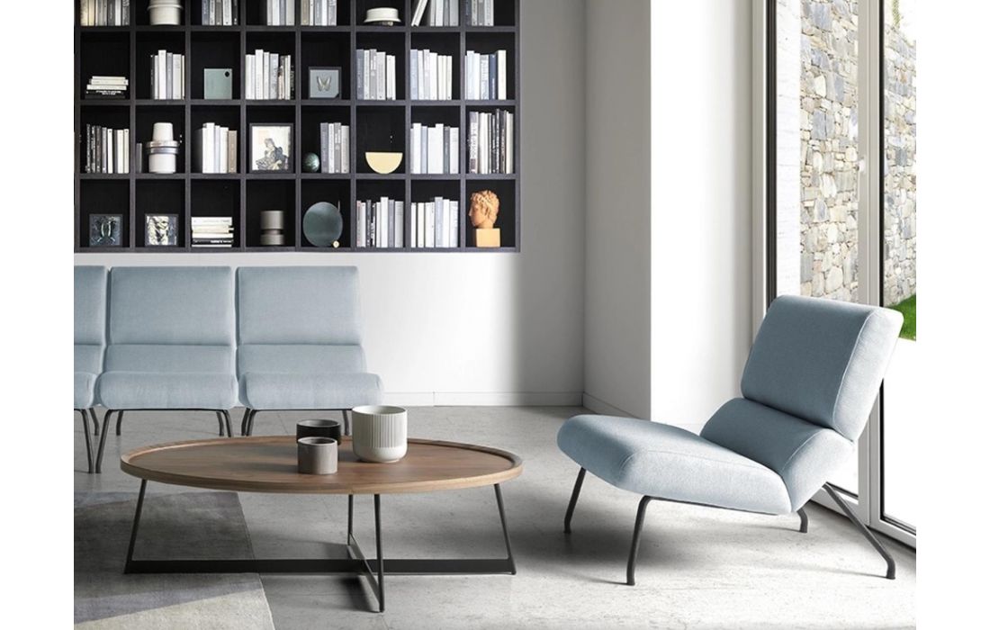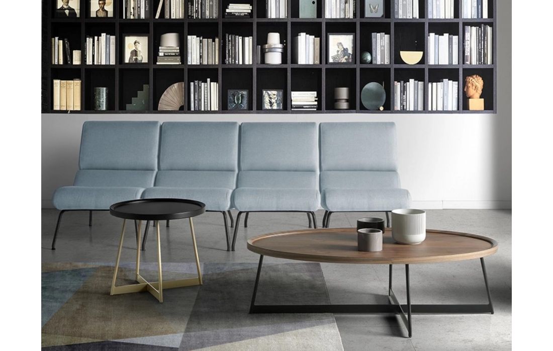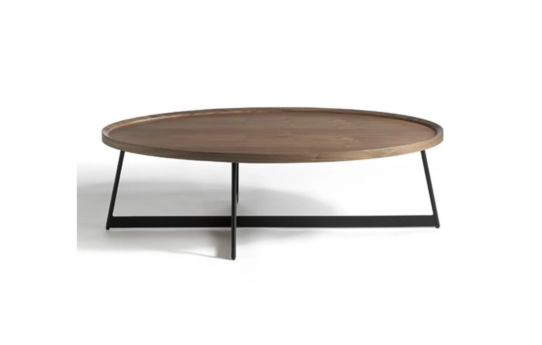 Coffee table with veneered wood top with walnut finish and metal feet.