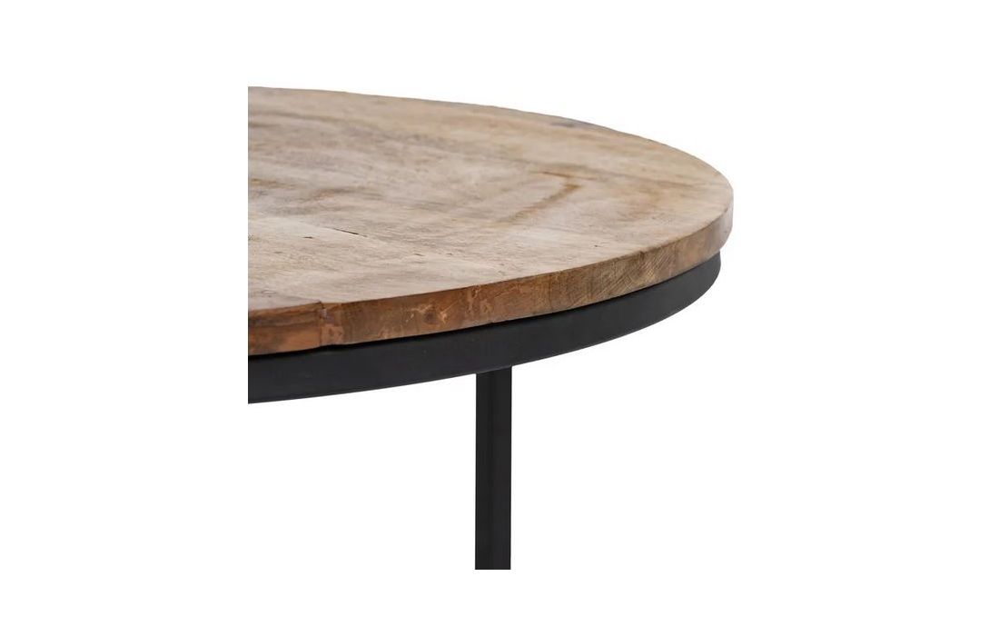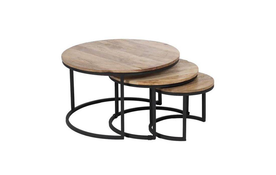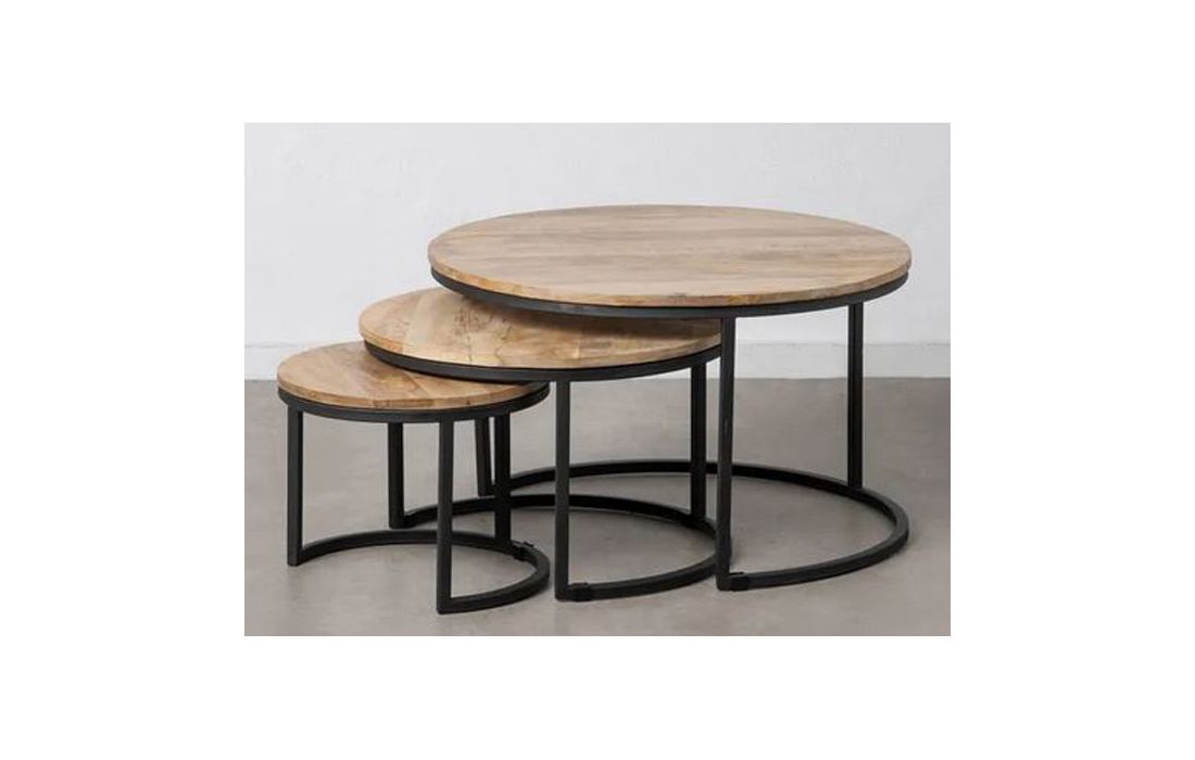 Set of 3 coffee tables with black iron structure and natural mango wood top