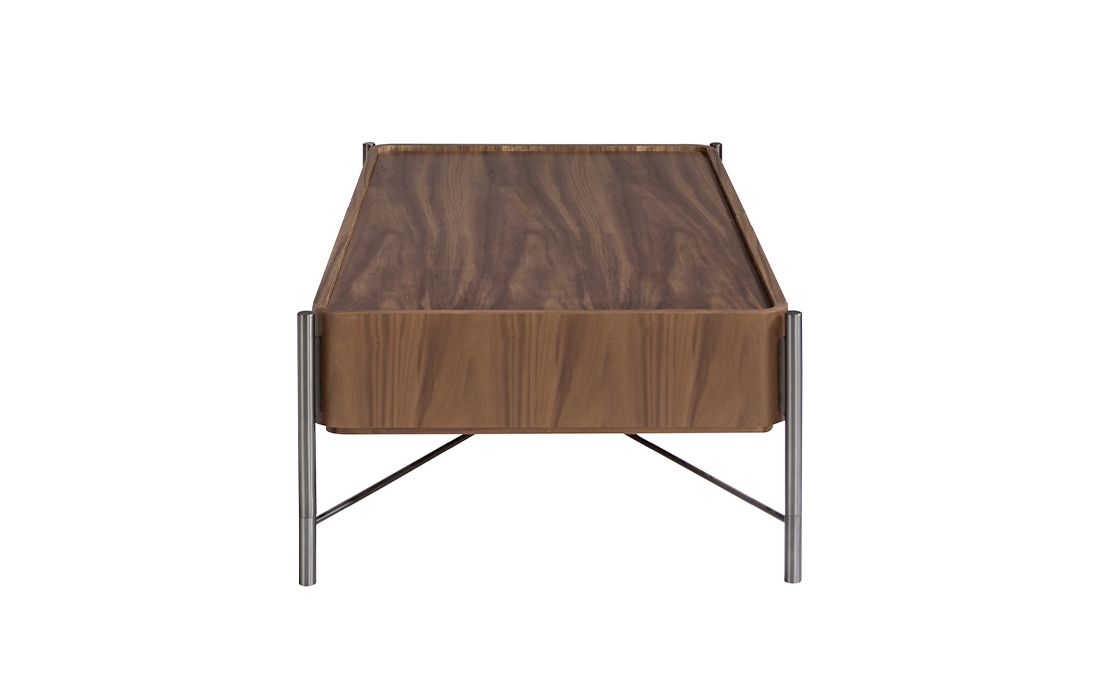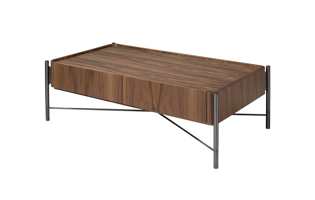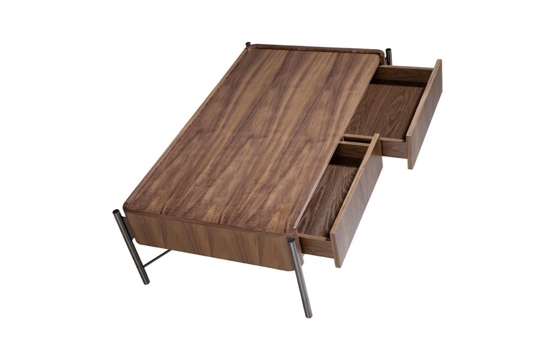 Rectangular walnut veneer coffee table with 2 drawers and blackened stainless steel base frame