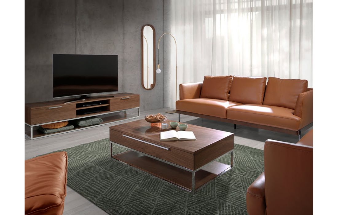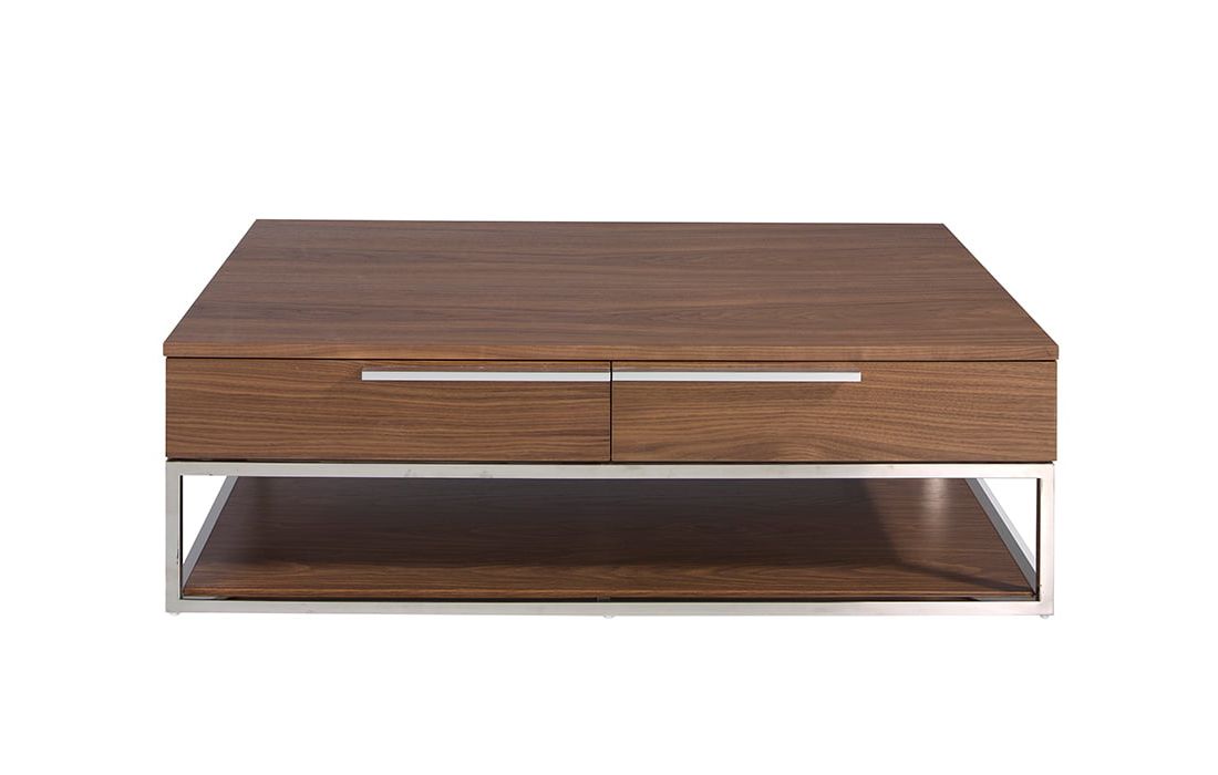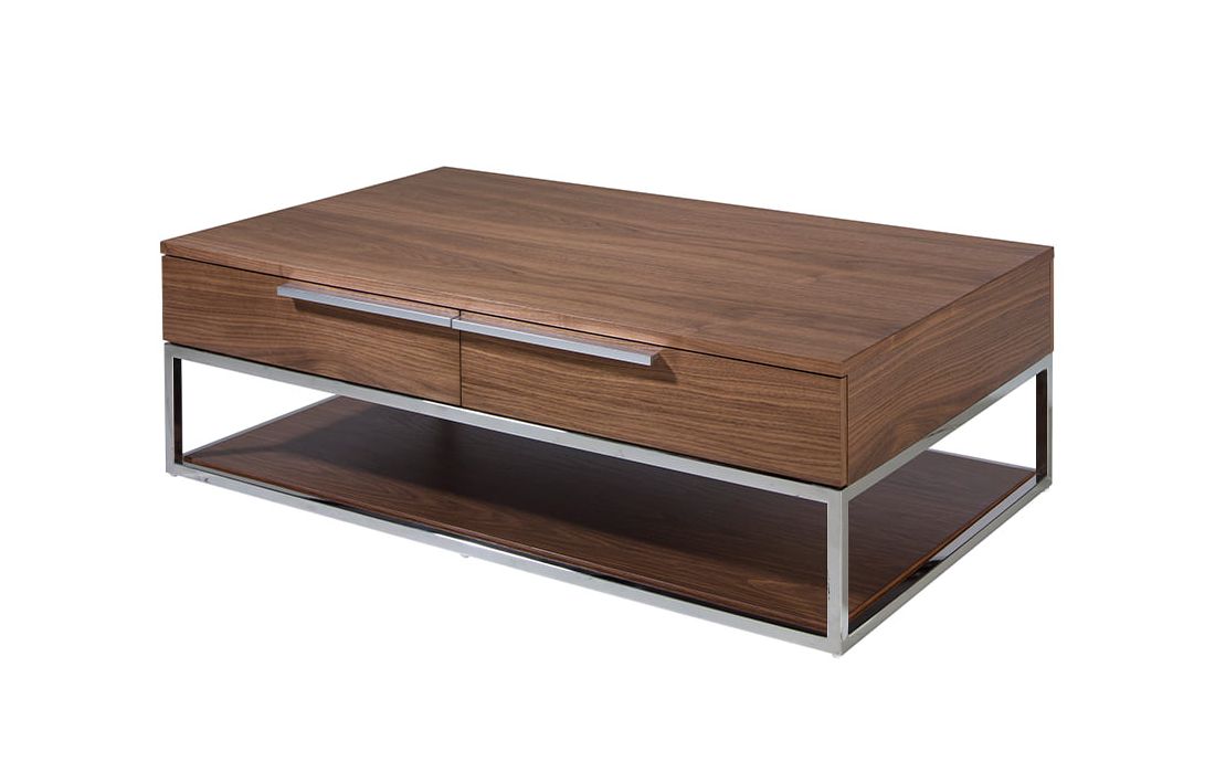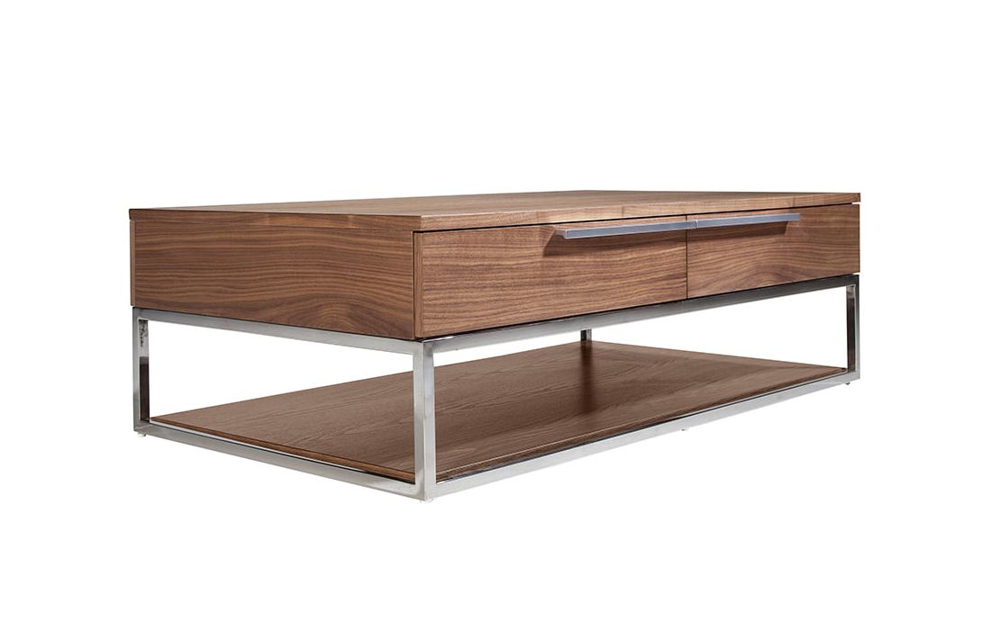Rectangular walnut veneer coffee table with two drawers and structure of legs and handles in chromed stainless steelRecipient :