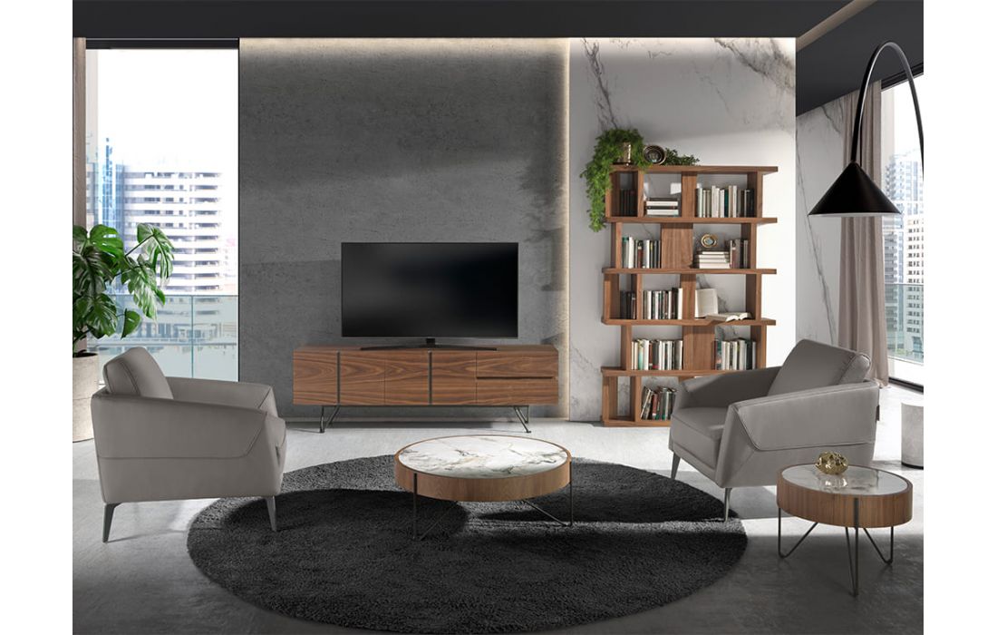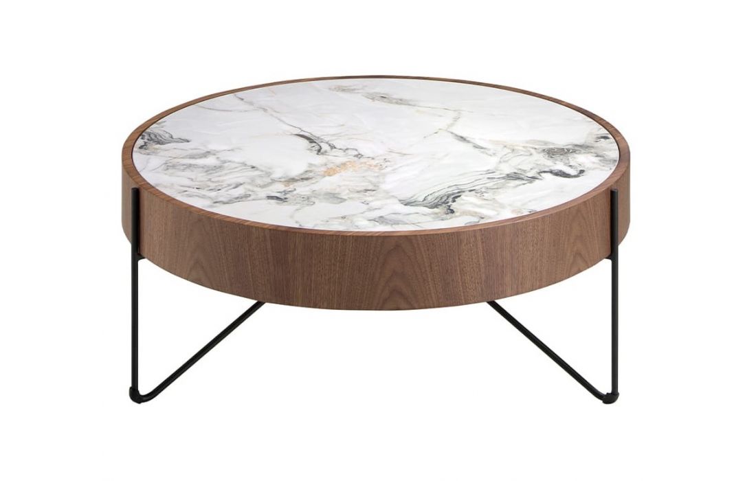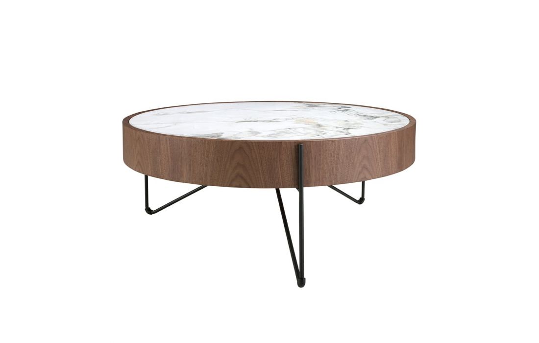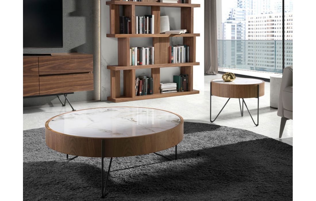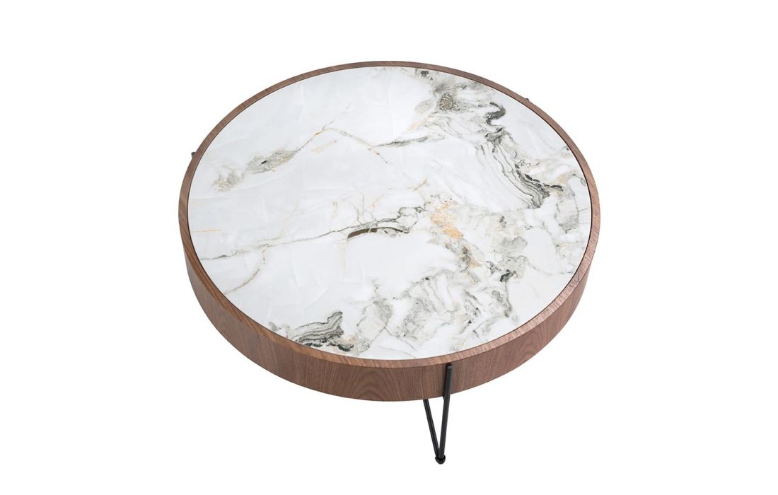 Modern coffee table made of walnut MDF and an elegant marble top in a glossy finish and its stainless steel leg structureRecipient :