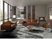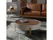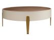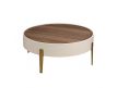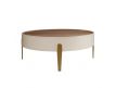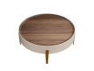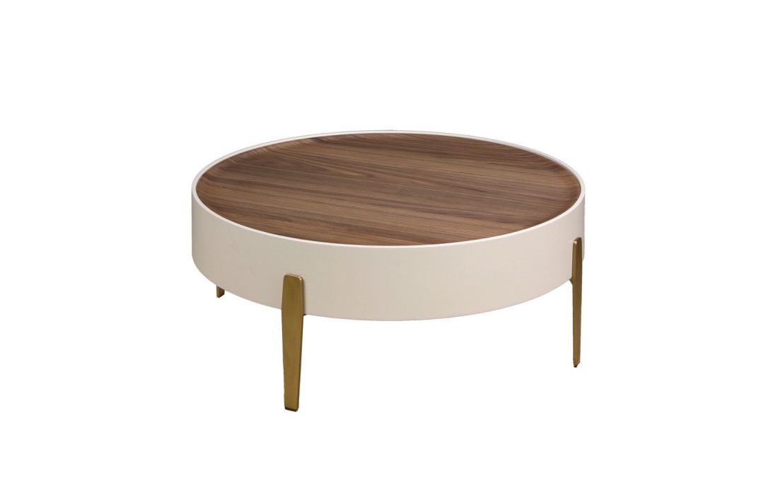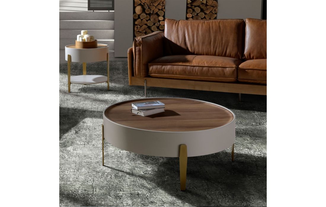 Modern design round coffee table made of beige MDF wood and an elegant natural walnut veneer top and its stainless steel leg structureRecipient :