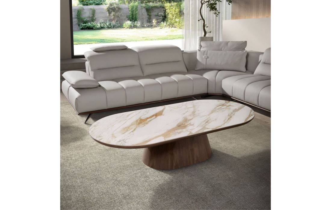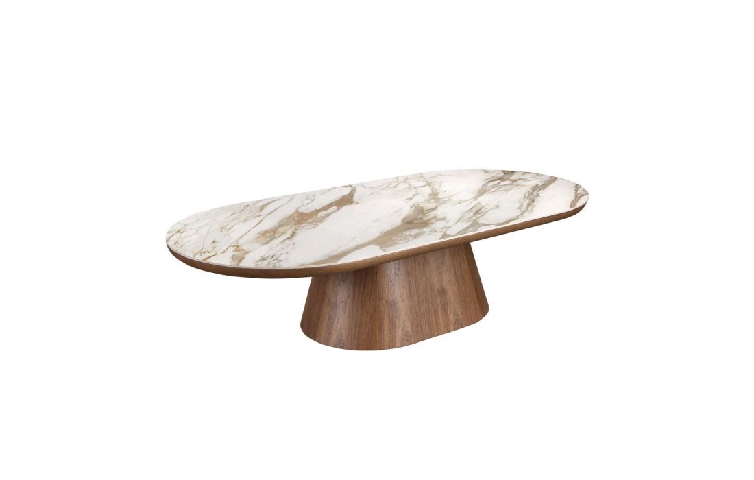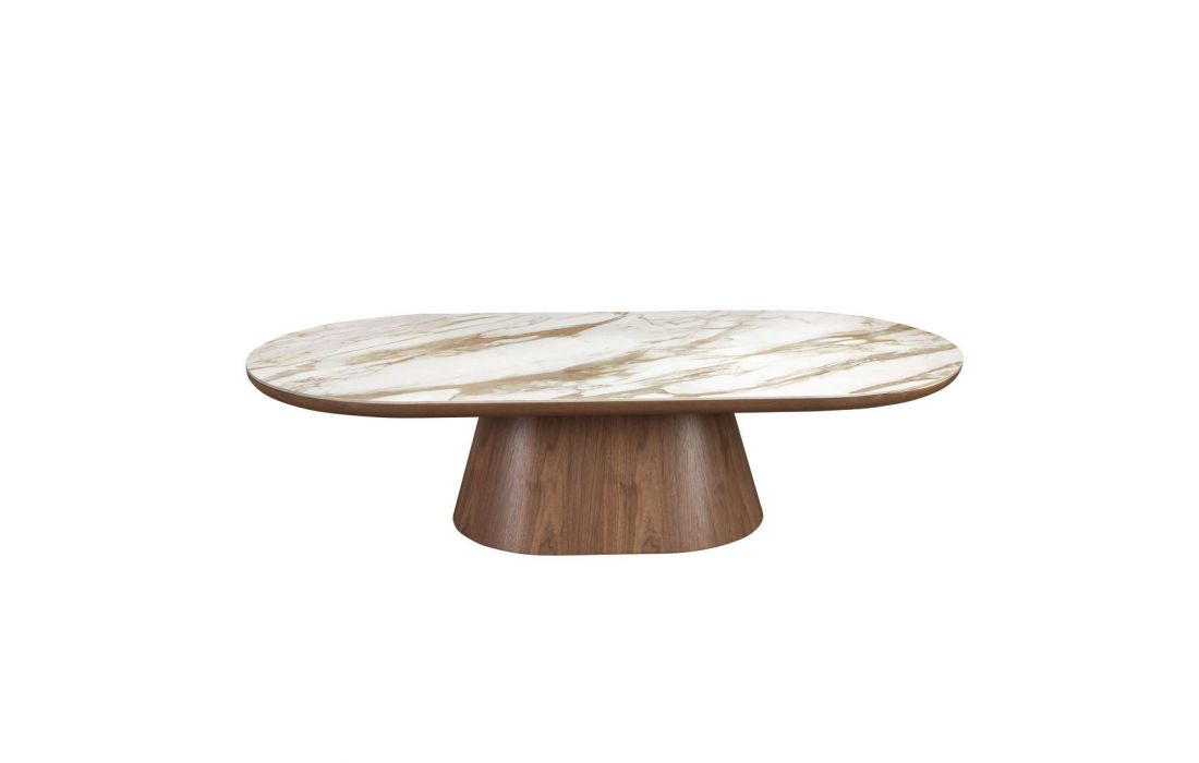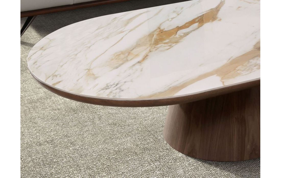 Modern oval coffee table with a glossy finish and marble porcelain top and original walnut veneer legsRecipient :