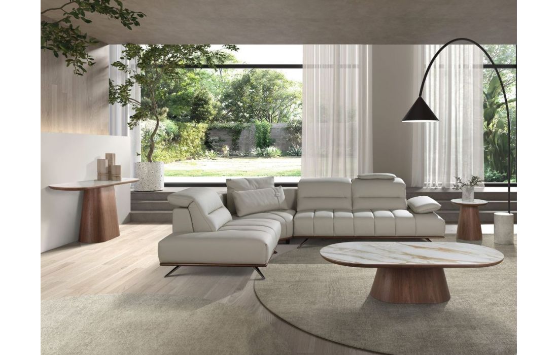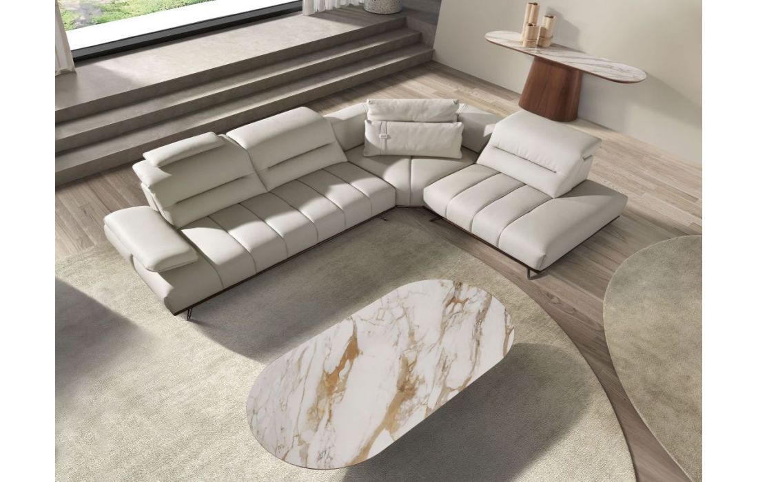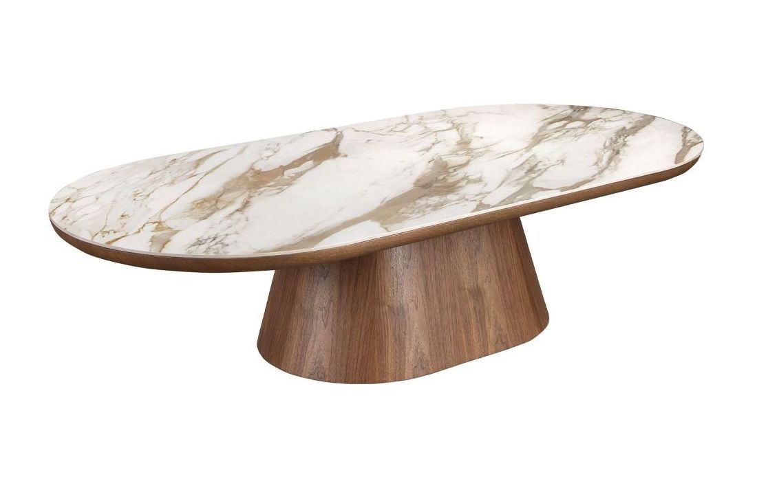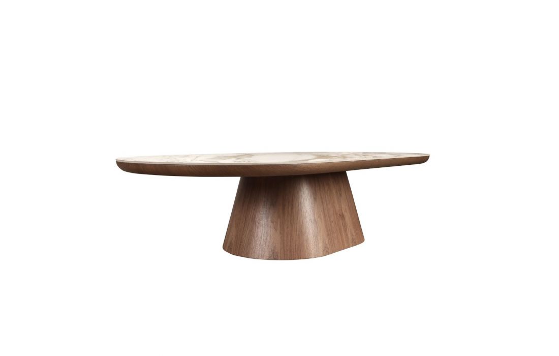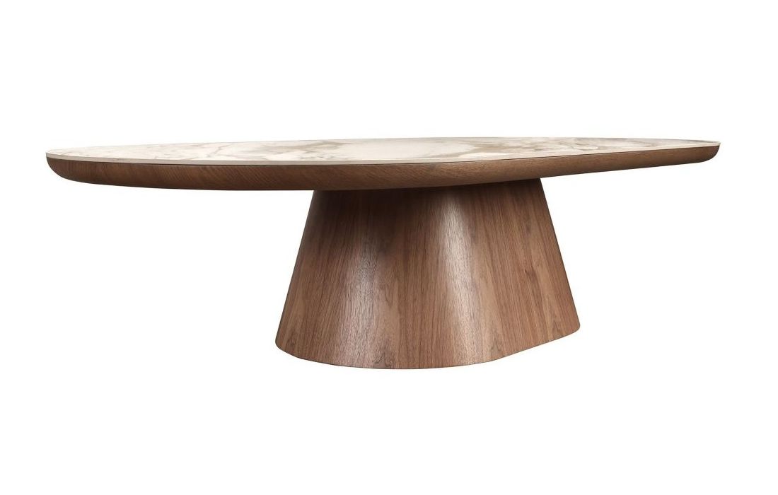 Modern oval coffee table with a glossy finish and marble porcelain top and original walnut veneer legsRecipient :